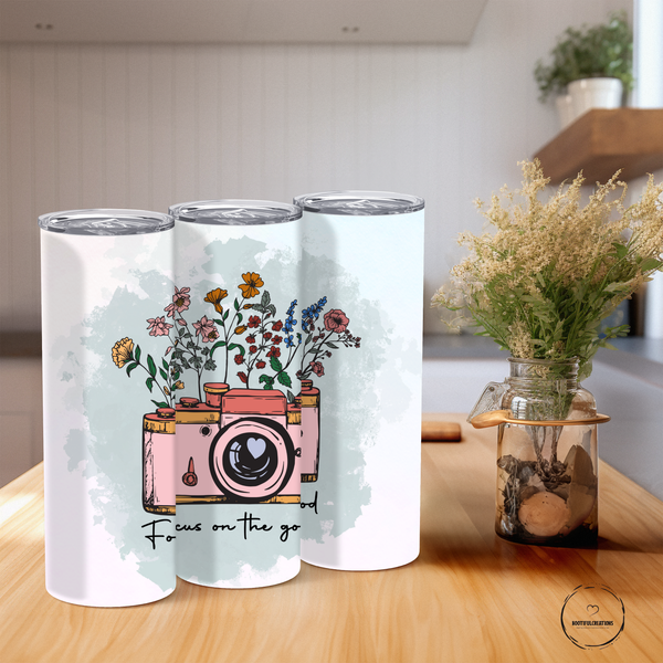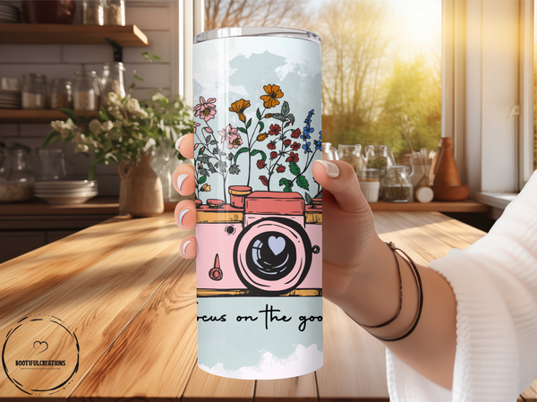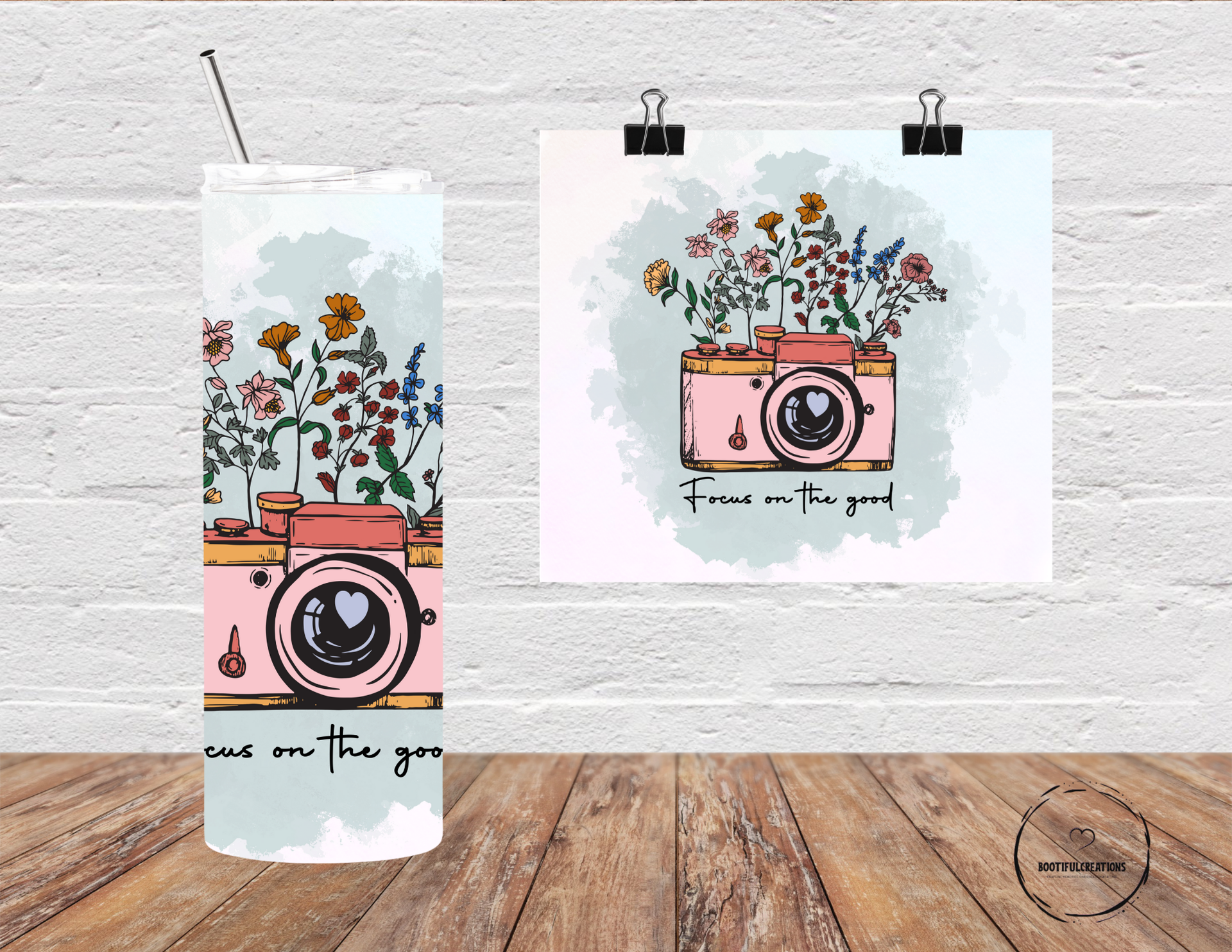 Stay positive and focused with our "Focus on the Good" Tumbler! This tumbler features beautiful flowers blooming from a retro camera, while keeping your drinks hot for up to 6 hours and cold for up to 24 hours. Personalize it with a name to make it truly unique. Stay inspired and spread positivity with every sip.