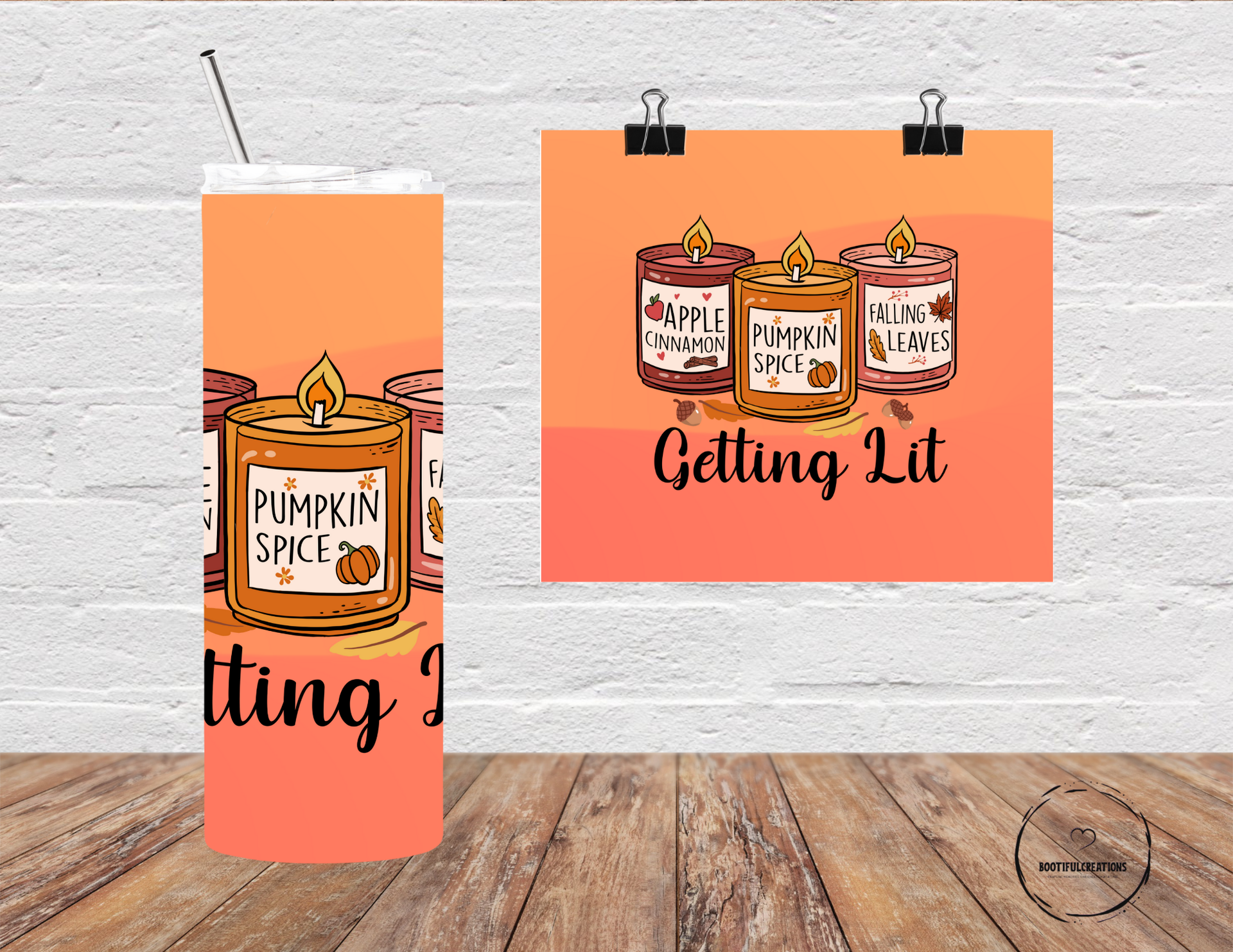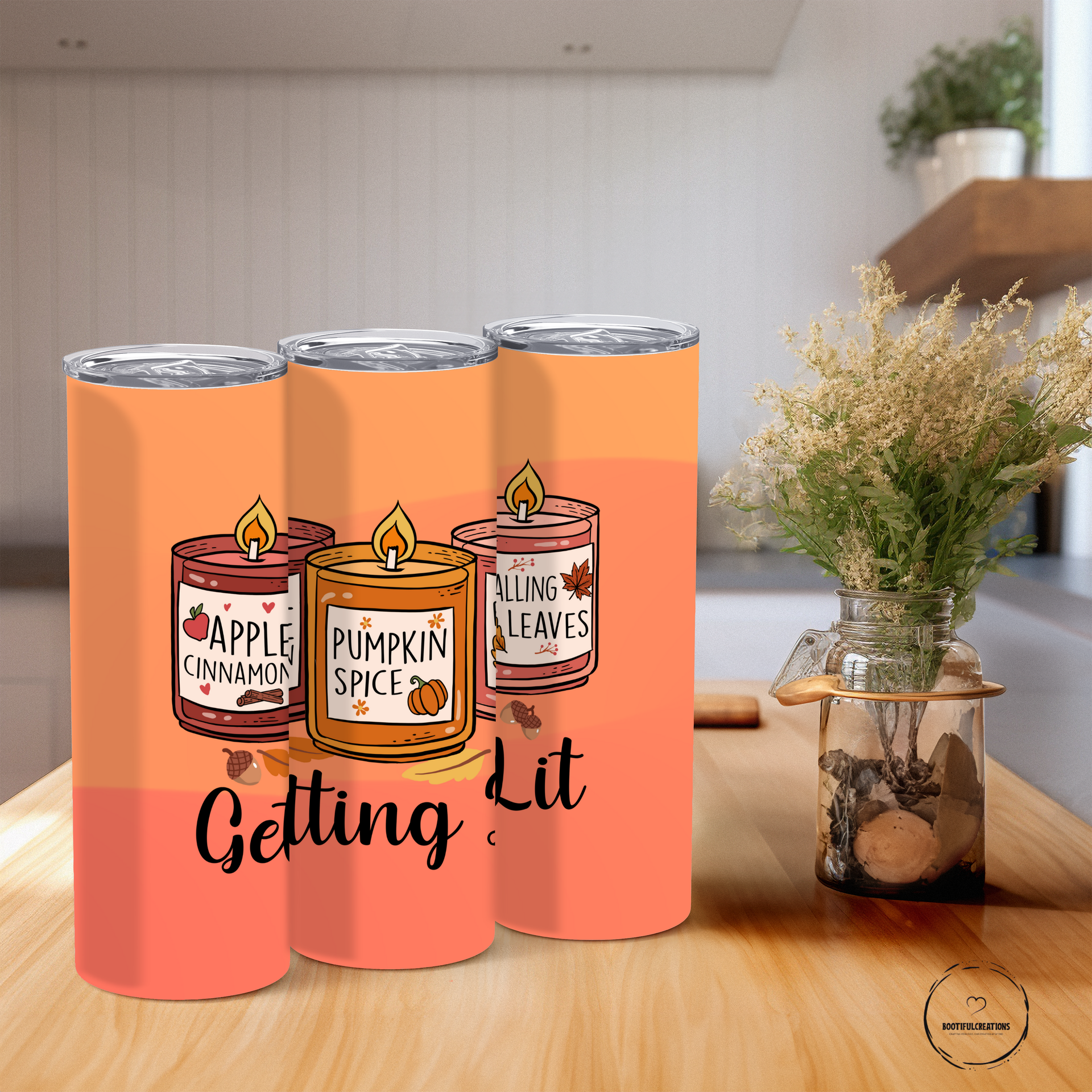 Introducing the "Getting Lit" Tumbler! Perfect for cozy nights in, this tumbler comes with labeled candles in delicious scents of Apple Cinnamon, Pumpkin Spice, and Falling Leaves. Keep your drinks hot for up to 6 hours or cold for up to 24 hours. Personalize it with a name for the ultimate touch. Cheers to staying warm and stylish!