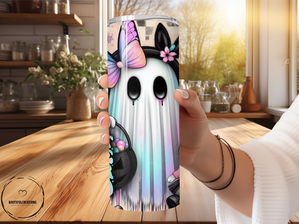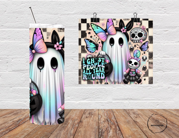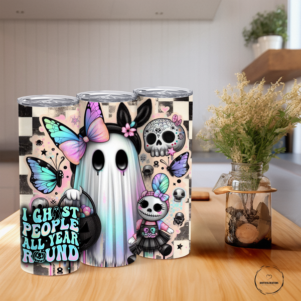 Get spooky all year round with our Ghosting People Tumbler! Featuring a cute ghost with a bow and the phrase "I Ghost People All Year Round", this tumbler can keep your drink hot for up to 6 hours and cold for up to 24 hours. Personalize it with a name and stay hydrated in style.