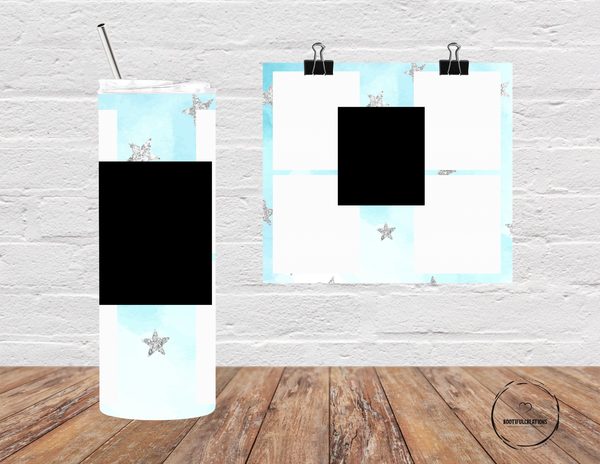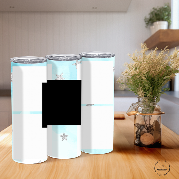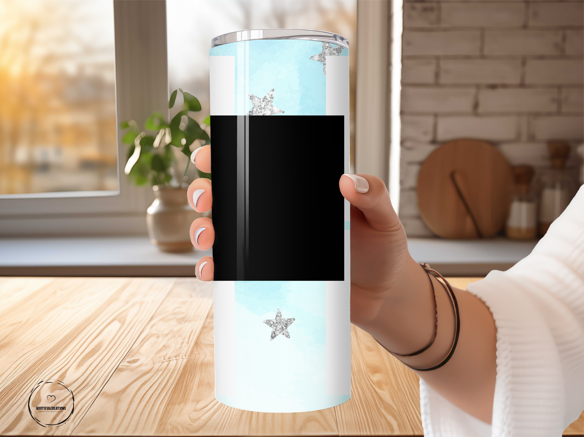 Sparkle up your daily routine with our Glitter Star Photo Tumbler! The light blue background with shimmering silver stars creates a dreamy look. Personalize it with a name and fill the 5 spaces with your favorite photos. Keep your drink hot for 6 hours or cold for 24 hours. Perfect for on-the-go and a great gift idea!
