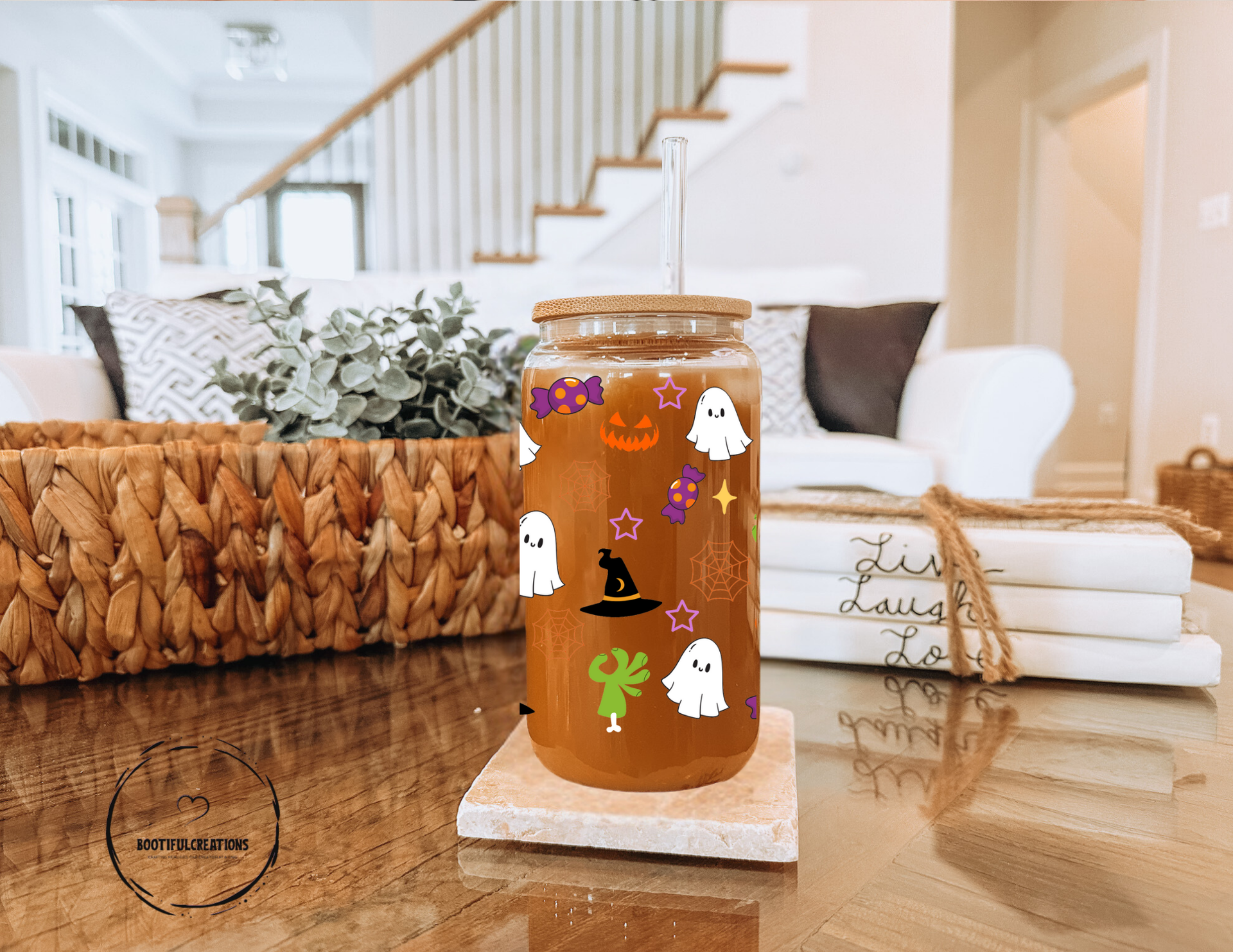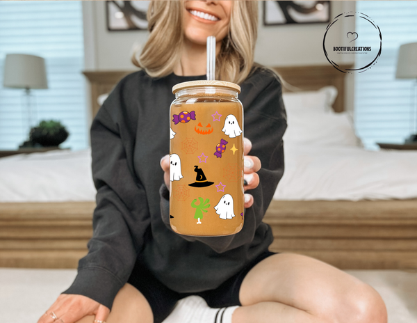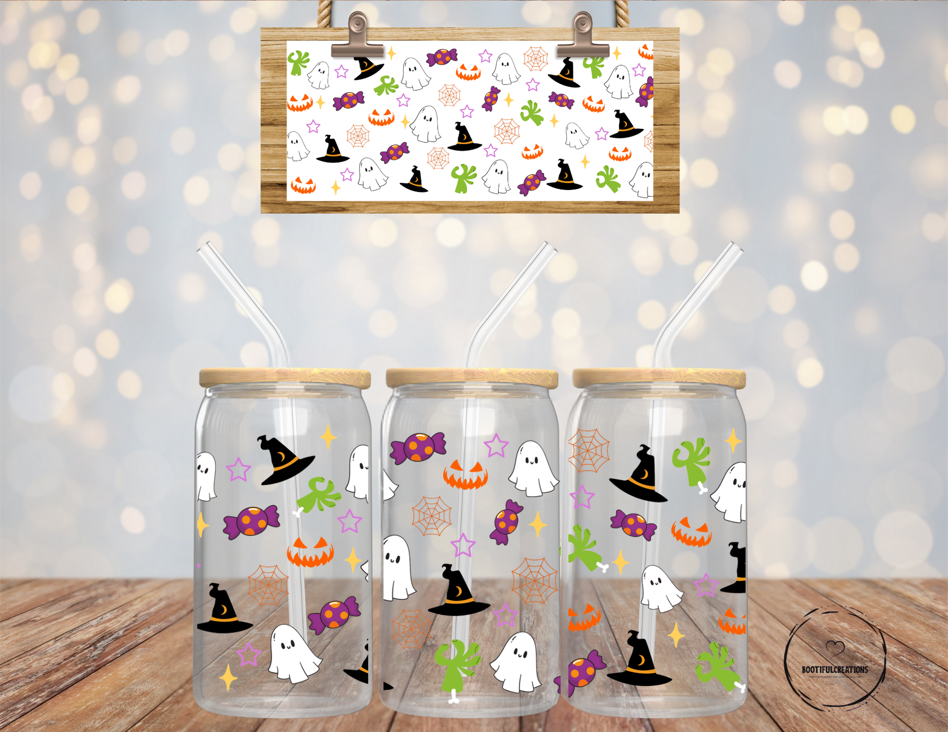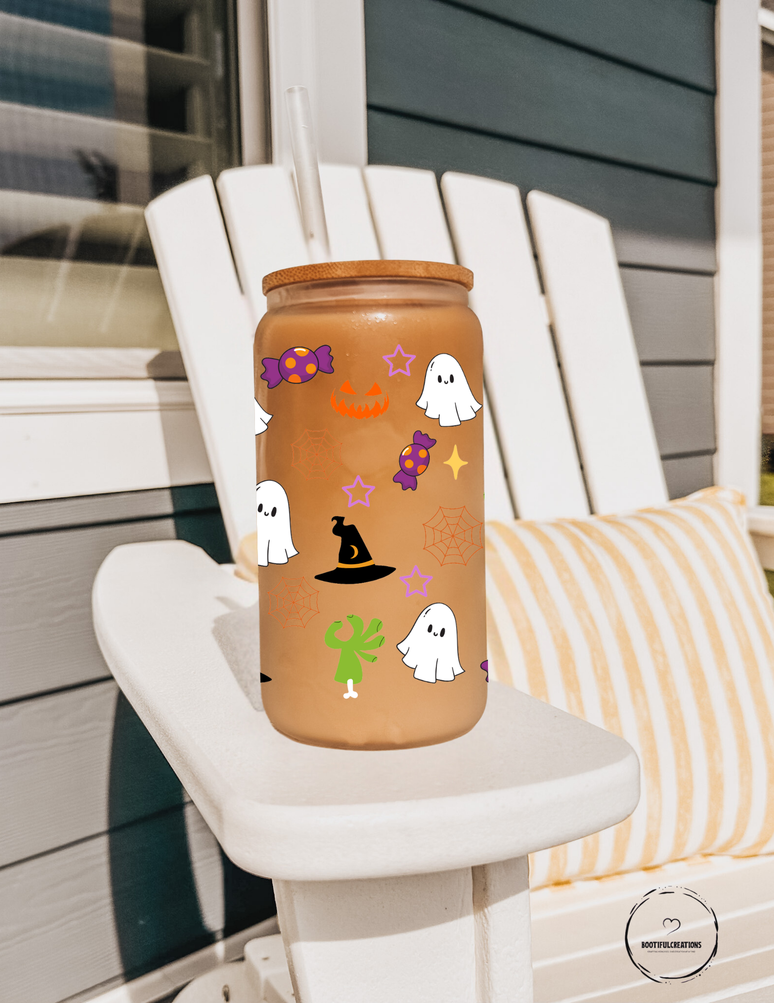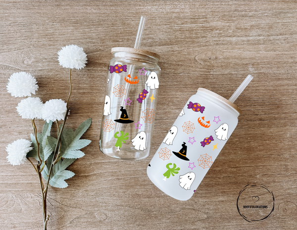 Elevate your Halloween celebration with our unique glass cup featuring spooky ghosts, sweet candy, and witch hats! Holds 16oz of your favorite drink in clear or frosted glass. Perfect for adding festive fun to any party or just sipping in style. Get yours now!