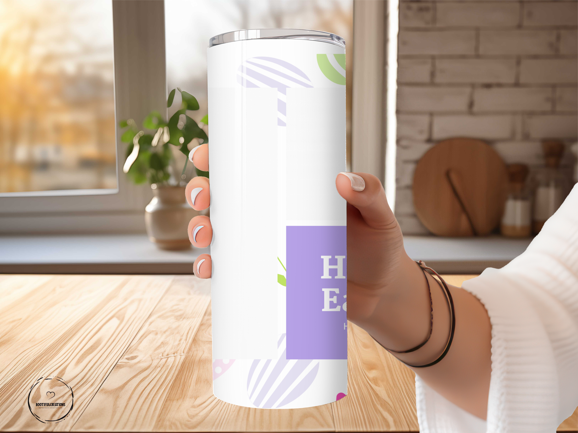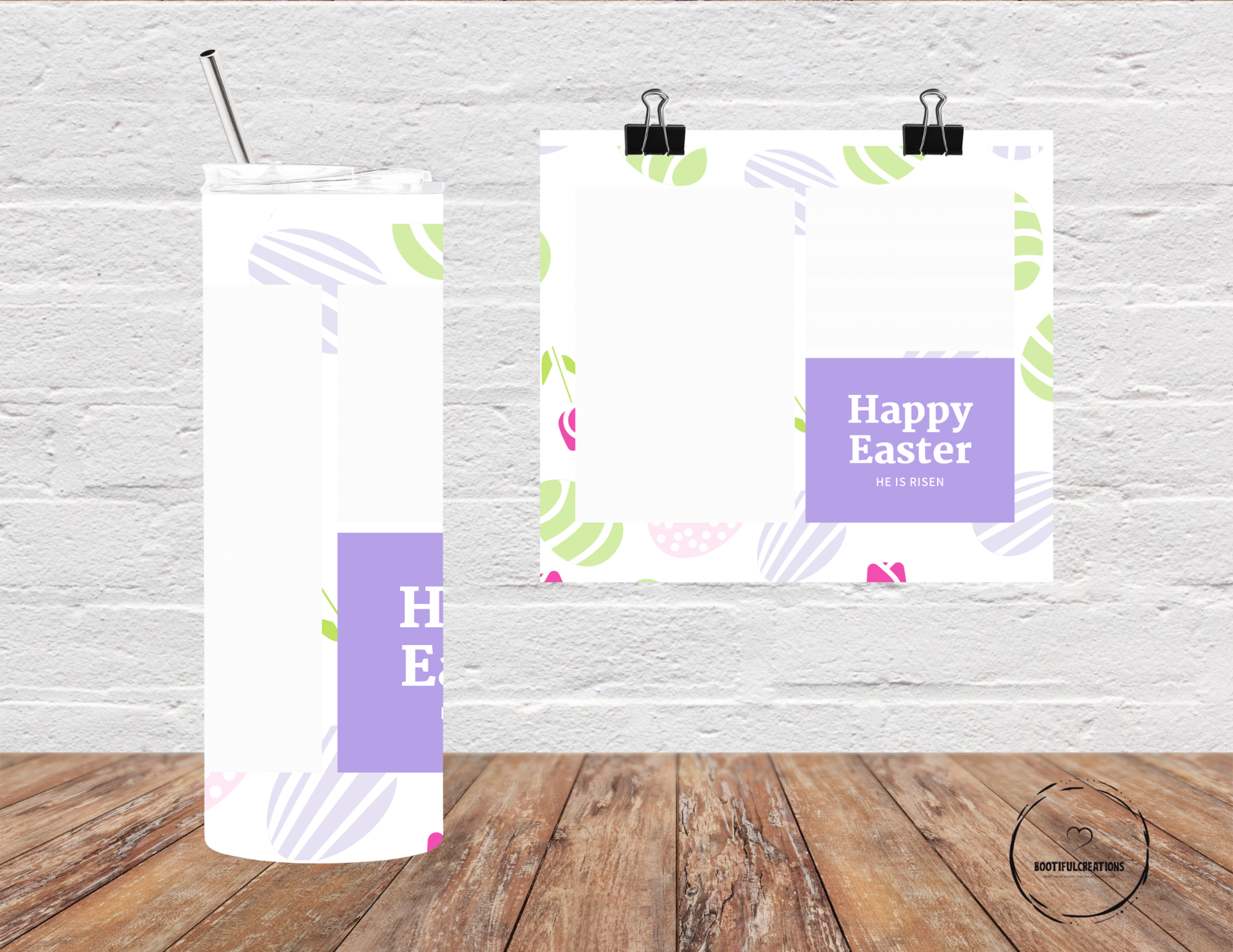 Celebrate Easter with a personalized Happy Easter Photo Tumbler! Featuring a cheerful pastel design with a purple square and the inspiring message "HE IS RISEN" in white. Keep your drink hot for 6 hours or cold for 24 hours. Add 2 photos and make it a unique gift!