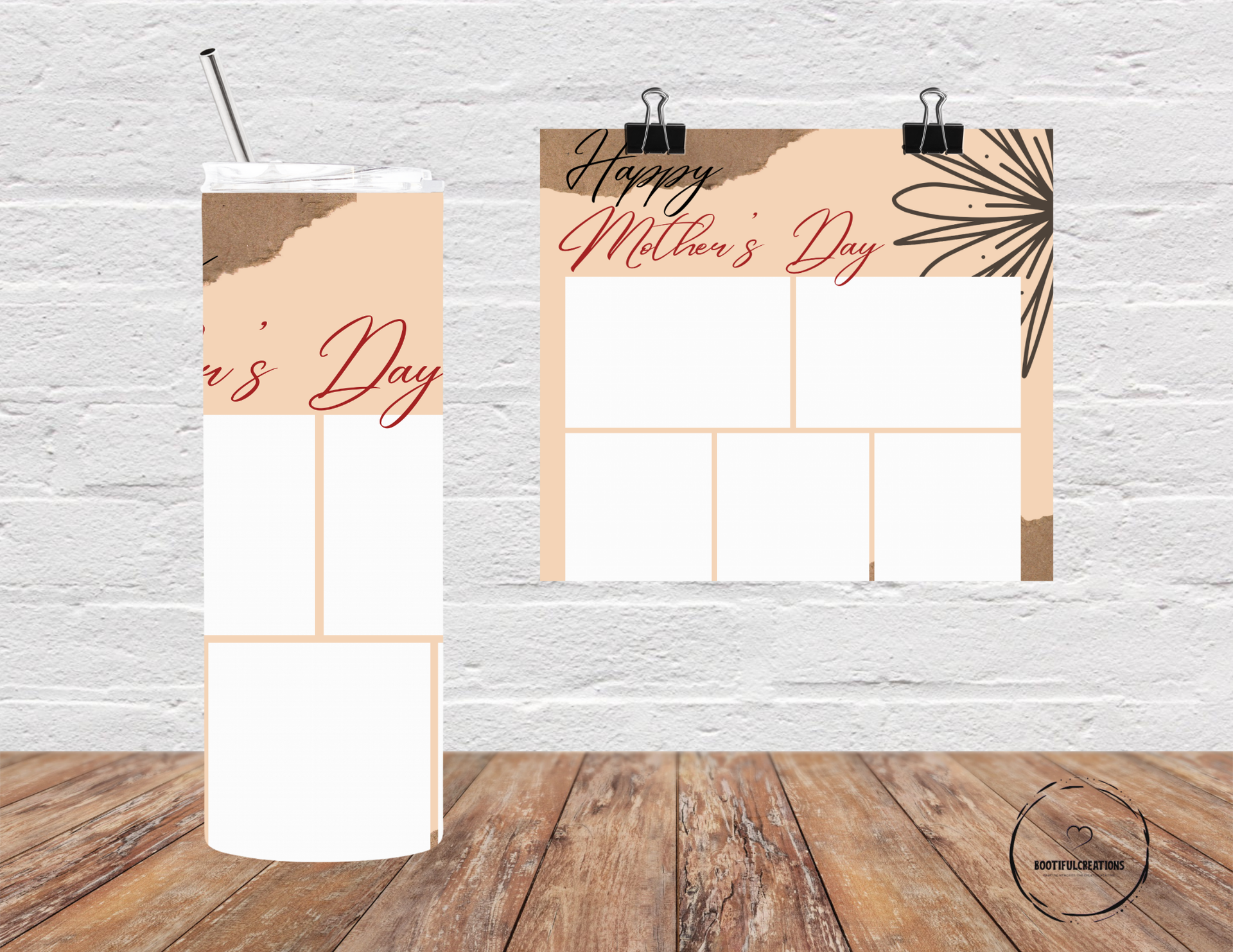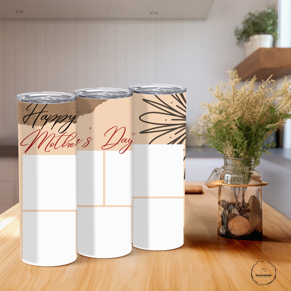 This customizable tumbler is adorned with a beautiful beige and brown color scheme, making it the perfect gift for Mother's Day. The elegant red cursive text adds a touch of sophistication. Keep drinks hot for up to 6 hours or cold for up to 24 hours. Personalize it with a name and showcase up to 5 photos.
