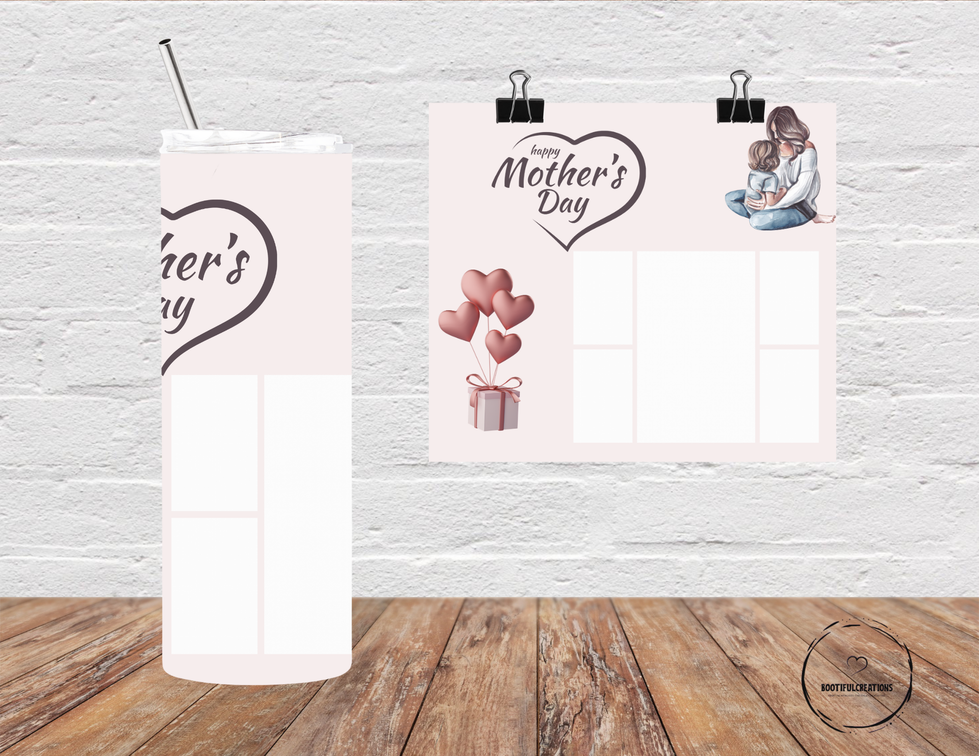 Show your mom how much she means to you with our Happy Mother's Day Photo Tumbler! This beautifully designed tumbler features a heartwarming "Happy Mother's Day" message, along with space for 5 photos, on a soft pink background. Keep drinks hot for 6 hours or cold for 24 hours and personalize it with her name. A perfect gift for the most important woman in your life!