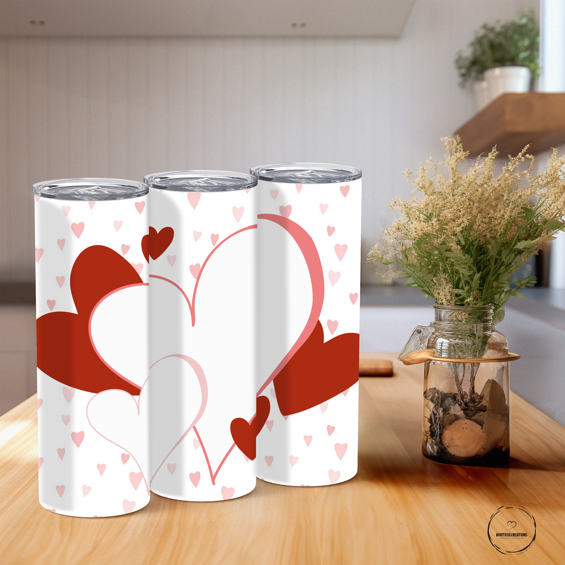 Stay hydrated in style with our Heart-Themed Photo Tumbler! Adorned with large and small hearts in shades of red and pink, this tumbler is perfect for adding a touch of love to your daily routine. Keep your drinks hot for 6 hours and cold for 24 hours while showcasing your favorite photos in the white heart frames. Personalize it with a name for an extra special touch!
