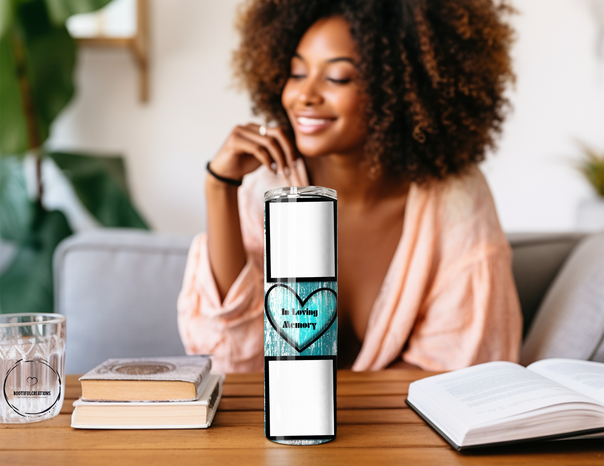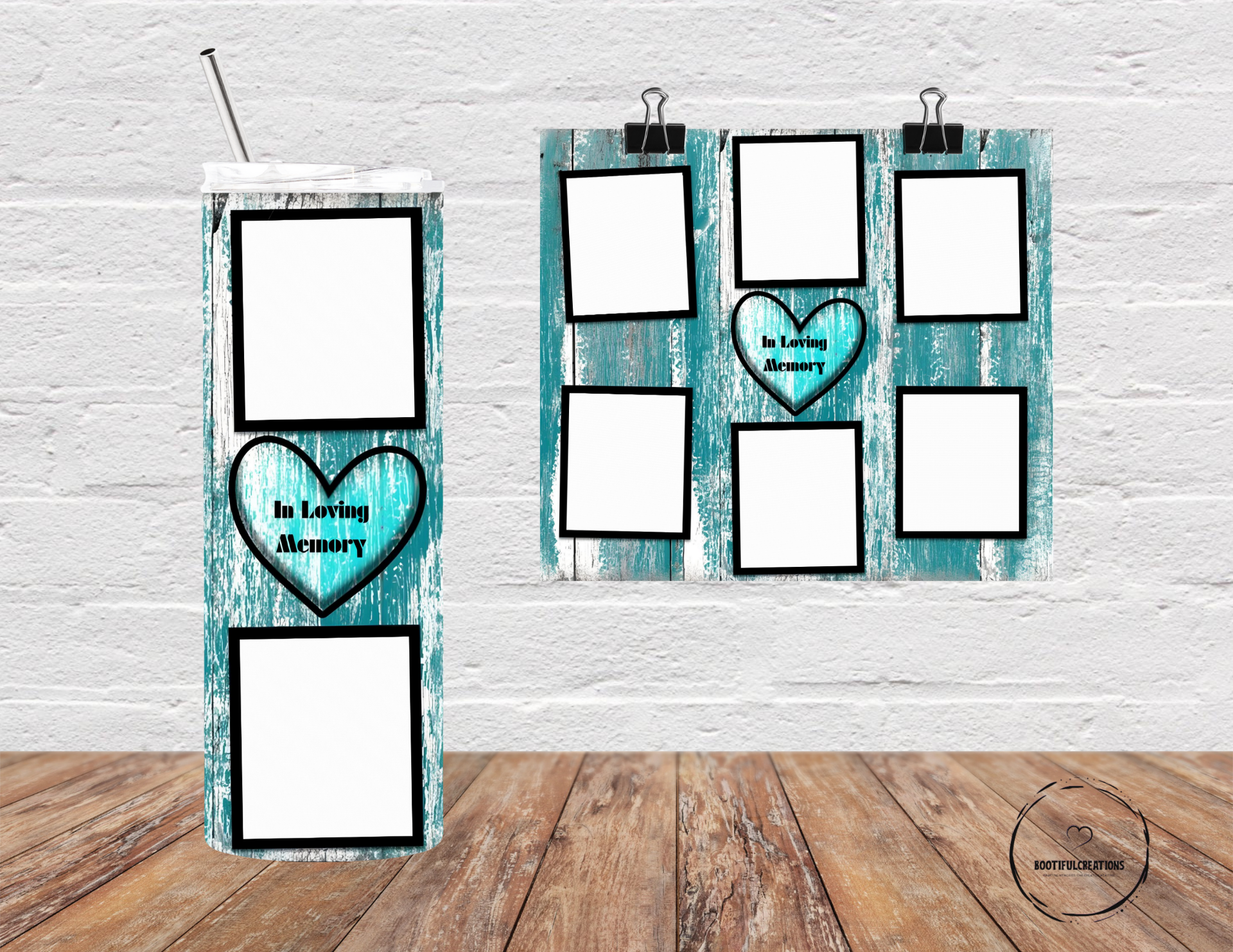 Capture and cherish the memories of your loved one with our In Loving Memory Customizable Photo Tumbler. The rustic, weathered wood design in calming shades of teal and white sets a peaceful tone. With six photo frames, including a heart-shaped one that reads "In Loving Memory," this tumbler keeps your drinks hot for 6 hours and cold for 24. Personalize it with a name for a lasting tribute.