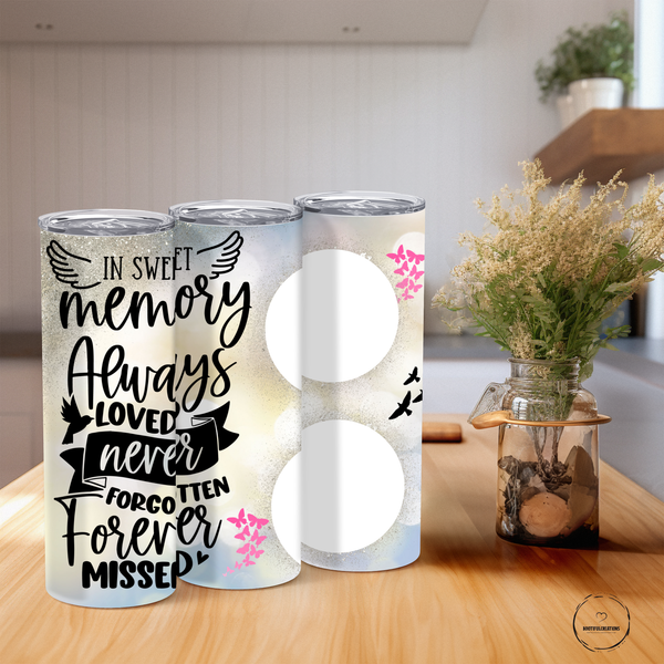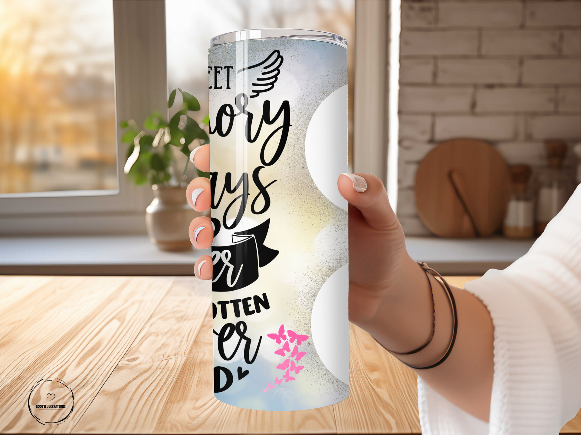 Cherish the memories of your loved one with our In Sweet Memory Photo Tumbler. The heartfelt memorial design features delicate angel wings, pink butterflies, and a comforting pastel gradient background. Keep drinks hot for up to 6 hours or cold for up to 24 hours. Personalize it with a name and two special photos.