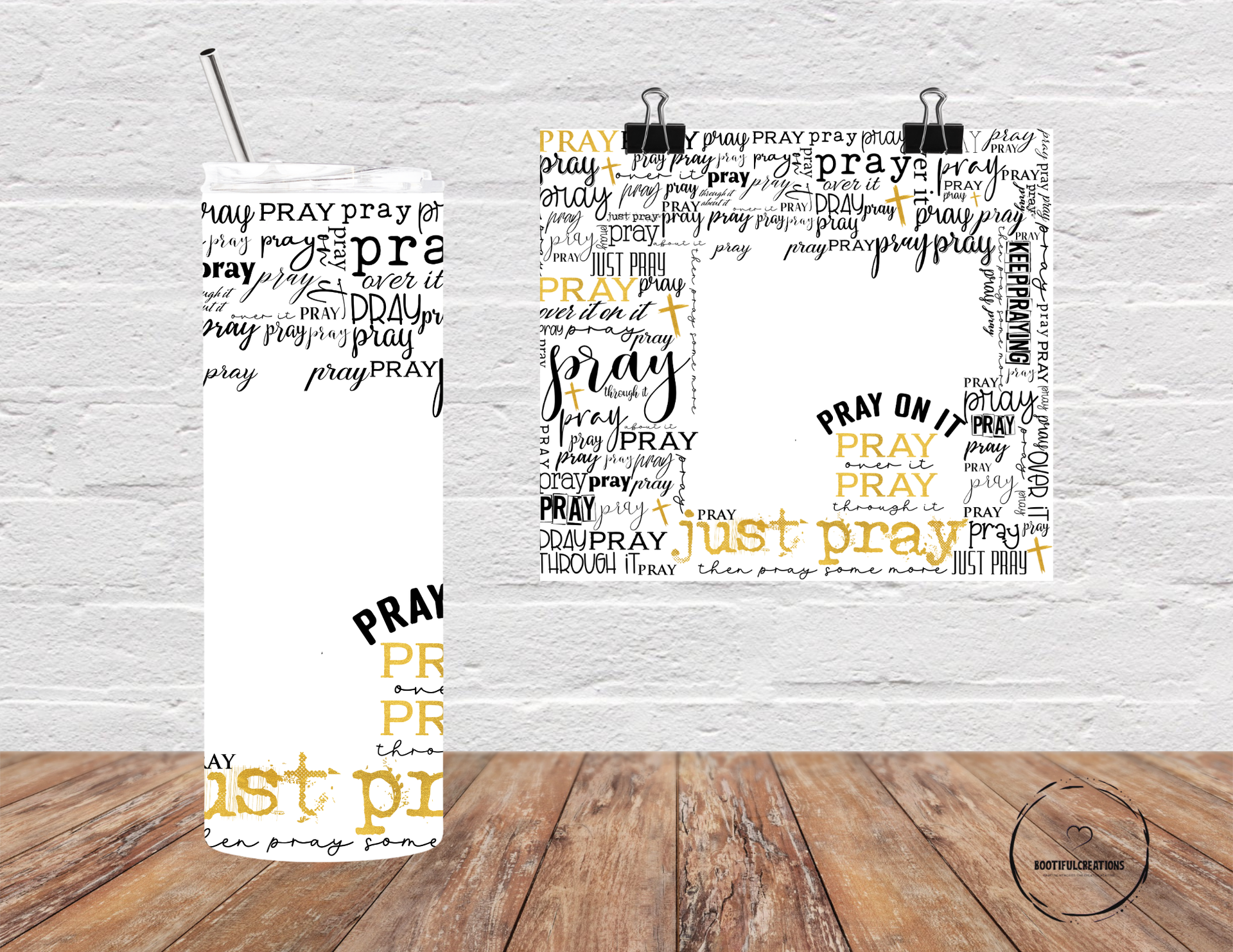 Stay inspired and hydrated on the go with our "Just Pray" Photo Tumbler. The black and gold font design on a white background exudes positivity and motivation. With space for a personal photo, it's a perfect reminder to "just pray" and persevere through challenges. Keeps drinks hot for 6 hours and cold for 24 hours. Personalize yours today!