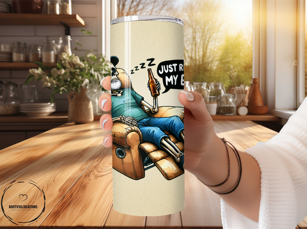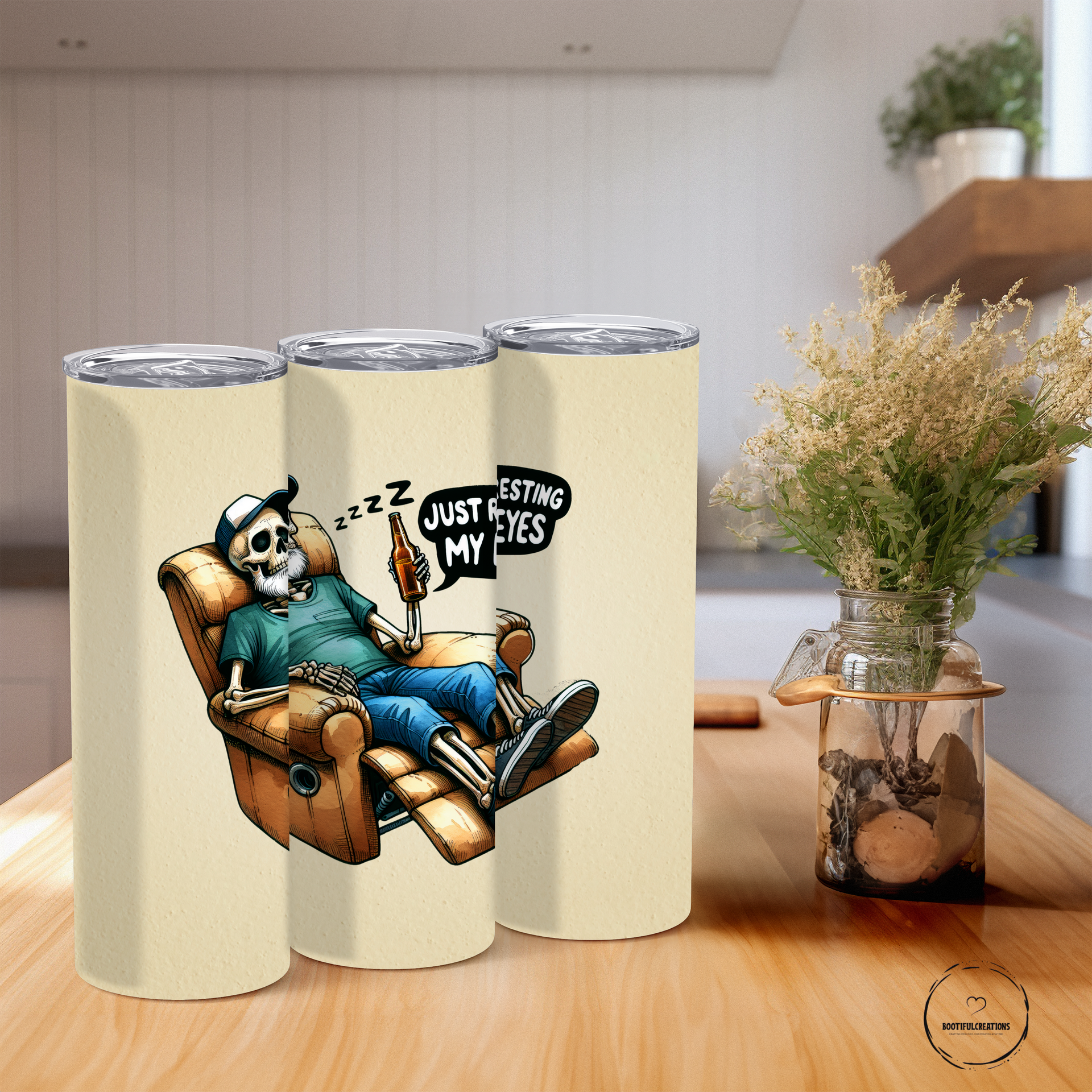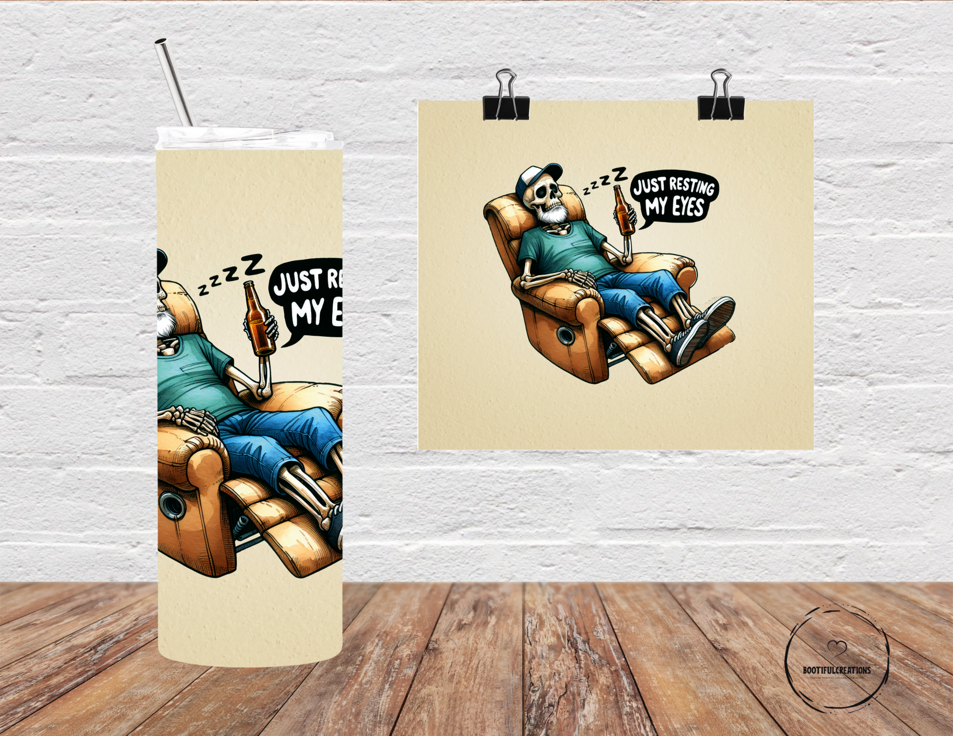 Introducing the "Just Resting My Eyes" Tumbler - perfect for keeping your drinks hot for up to 6 hours and cold for up to 24 hours. Whether it's a long day at work or a relaxing weekend, this tumbler is personalized with a name and features a humorous skeleton in a recliner. Stay hydrated in style!