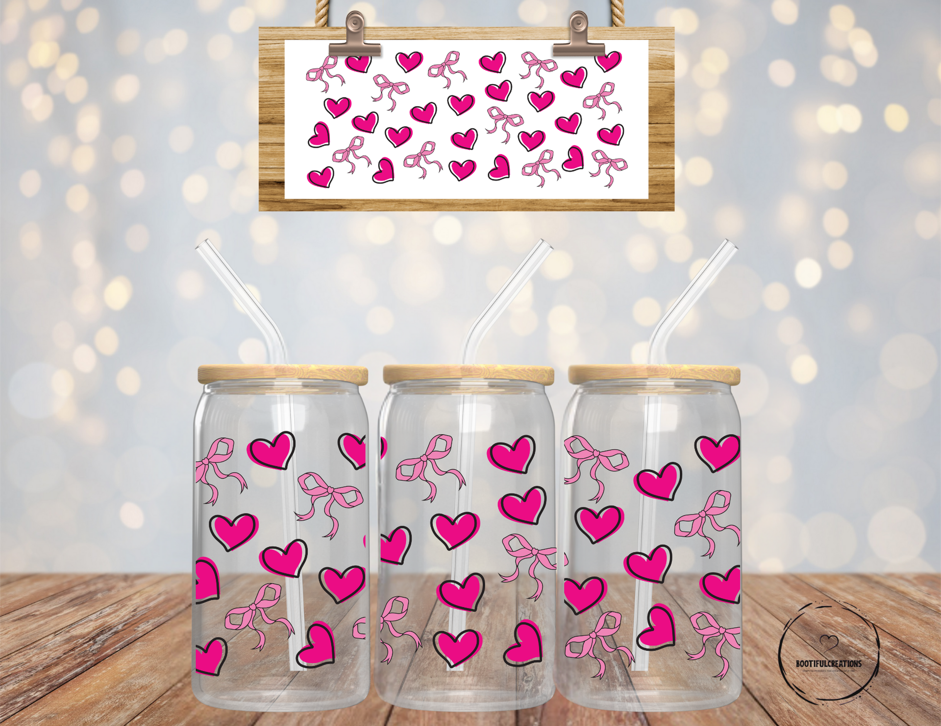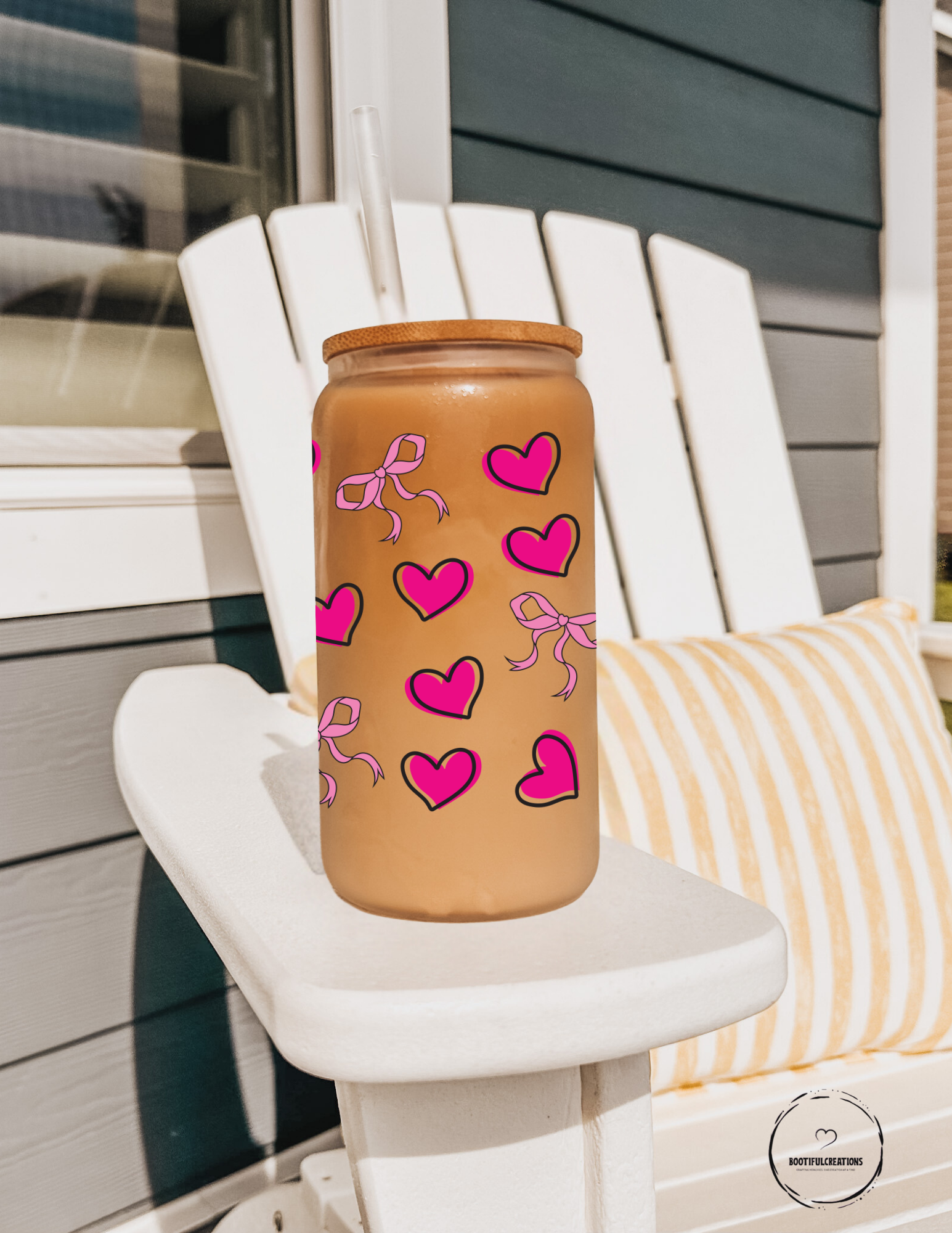 Elevate your love for pink with our glass cup adorned with light pink bows and dark pink hearts! Holds 16oz of your favorite drink, available in clear or frosted. Perfect for adding a touch of whimsy to your morning coffee or afternoon tea. Cheers to cuteness!