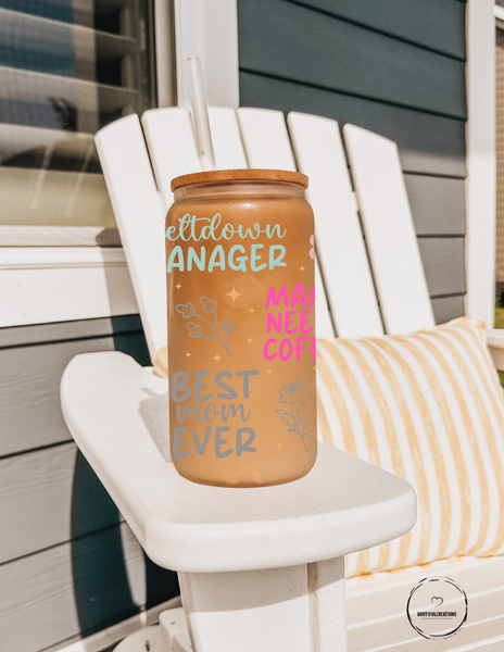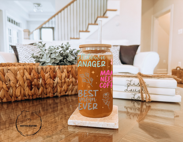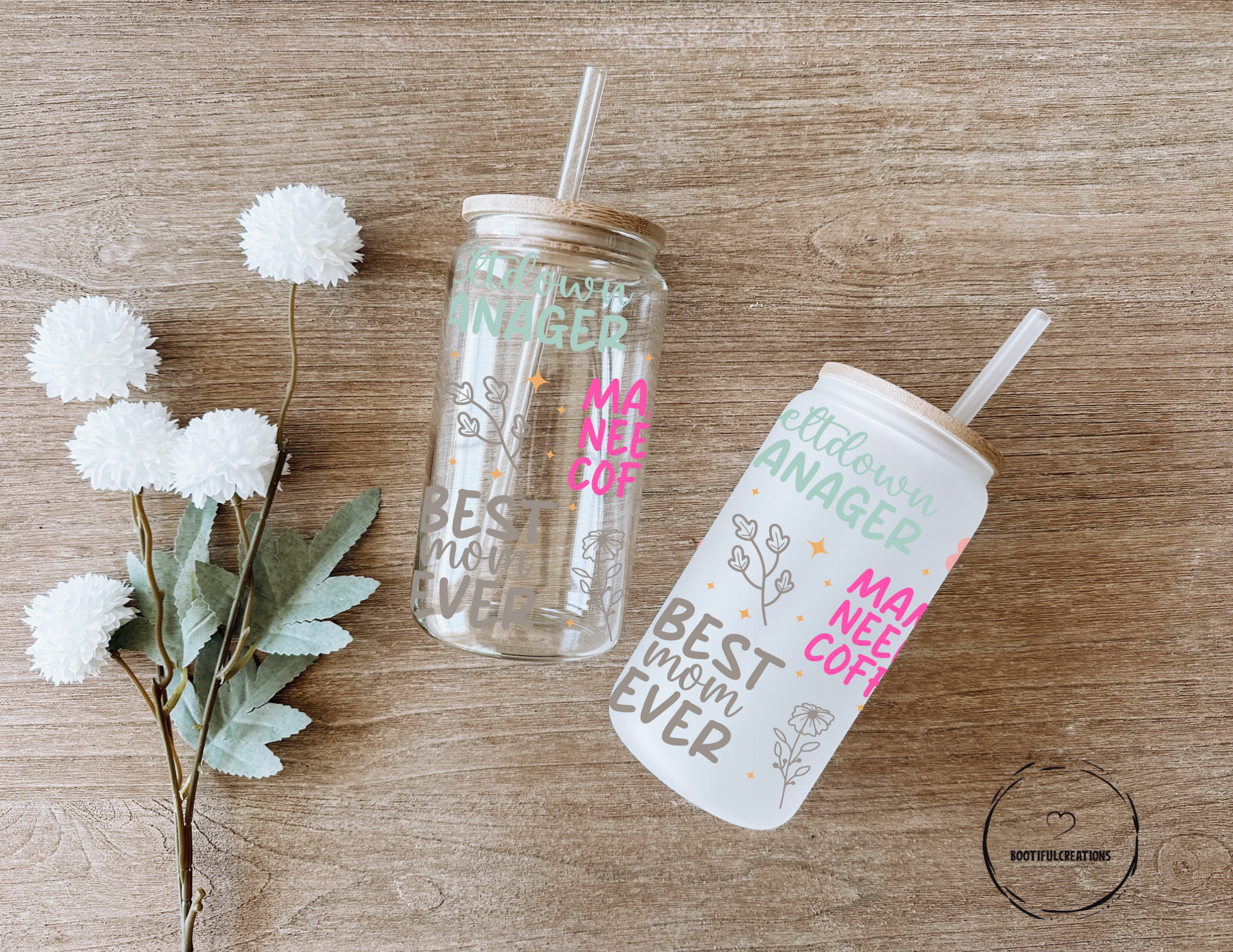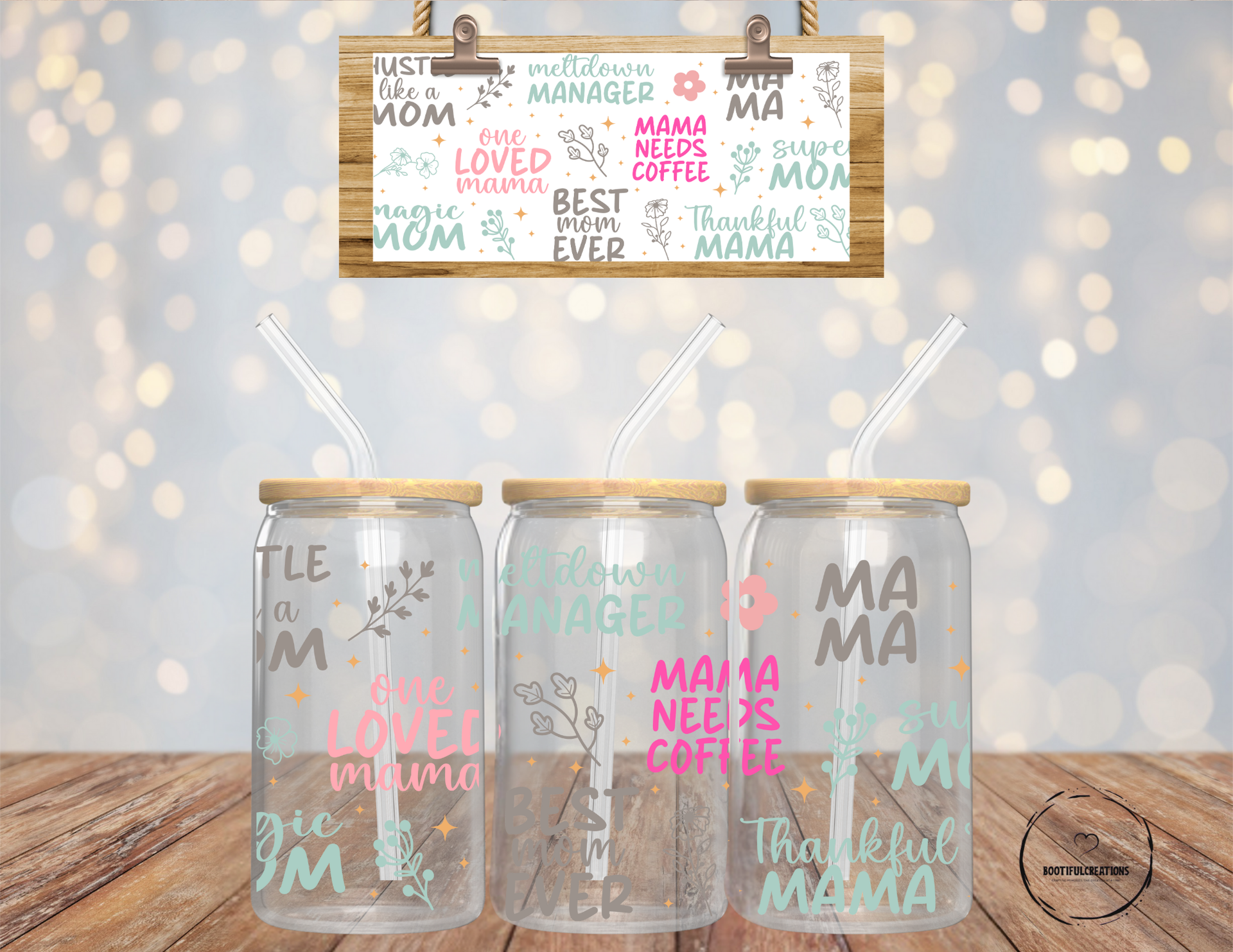 Show your mom some love with our Loving Mom Sayings Glass Cup! With phrases like "hustle like mom" and "best mom ever", this 16oz cup is perfect for any mama. Choose from clear or frosted glass to add a personal touch. Cheers to one loved mama!