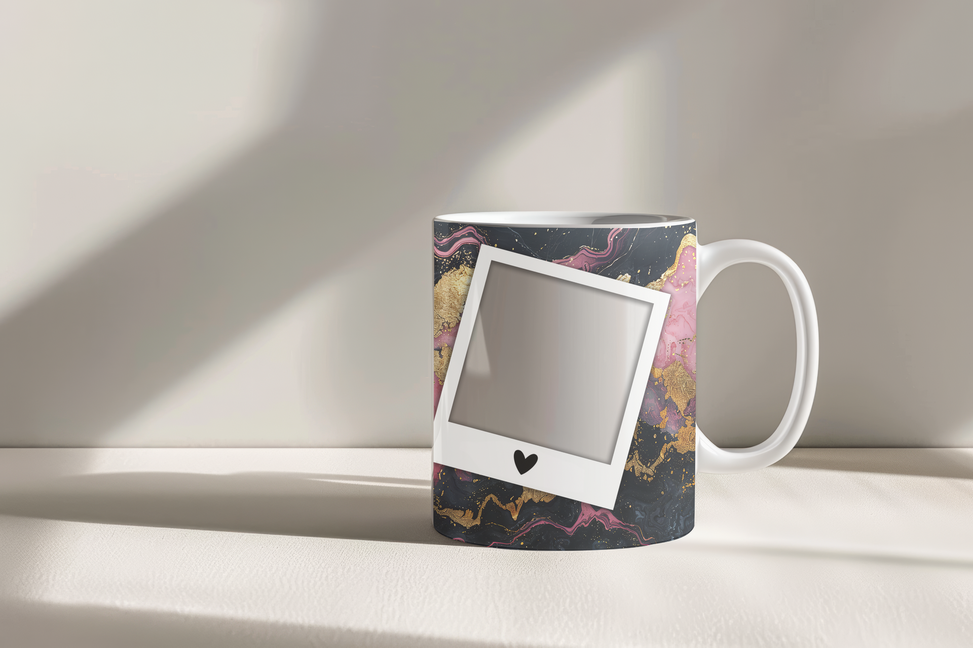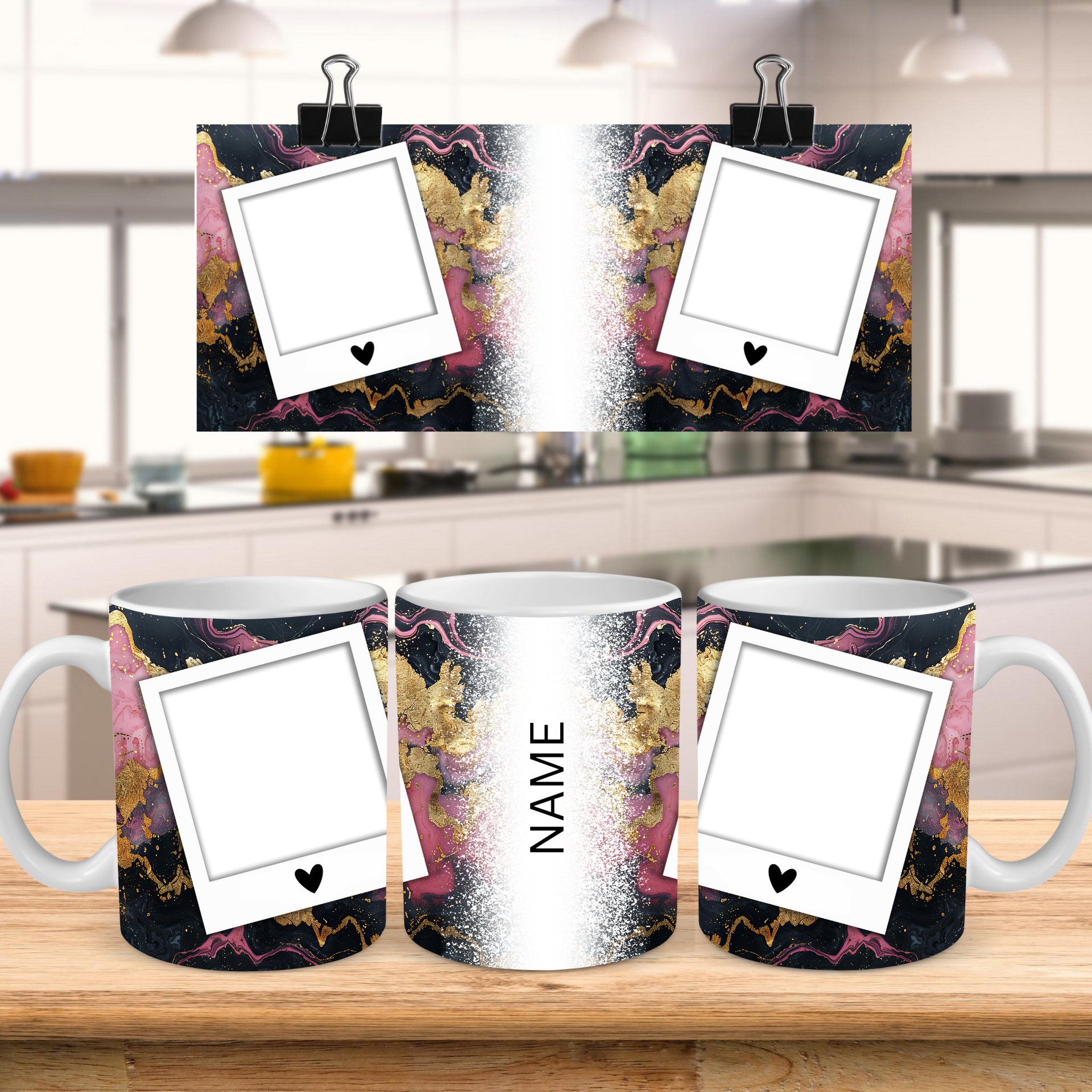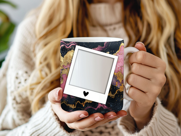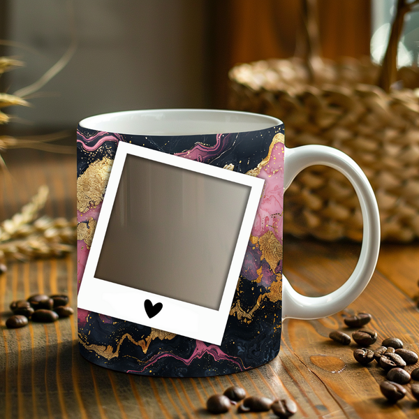 Indulge in a touch of luxury with our Luxurious Gold & Pink Abstract Personalized Photo Mug. This captivating mug features a rich, dark background infused with swirling patterns of shimmering gold and elegant pink, creating a truly artistic and high-end aesthetic. Two classic polaroid-style frames, each adorned with a subtle heart, are perfectly positioned to display your cherished photos, while the central sparkling white stripe provides a dedicated space for a personalized name. Available in both the popular 11oz and generous 15oz sizes to suit any preference.