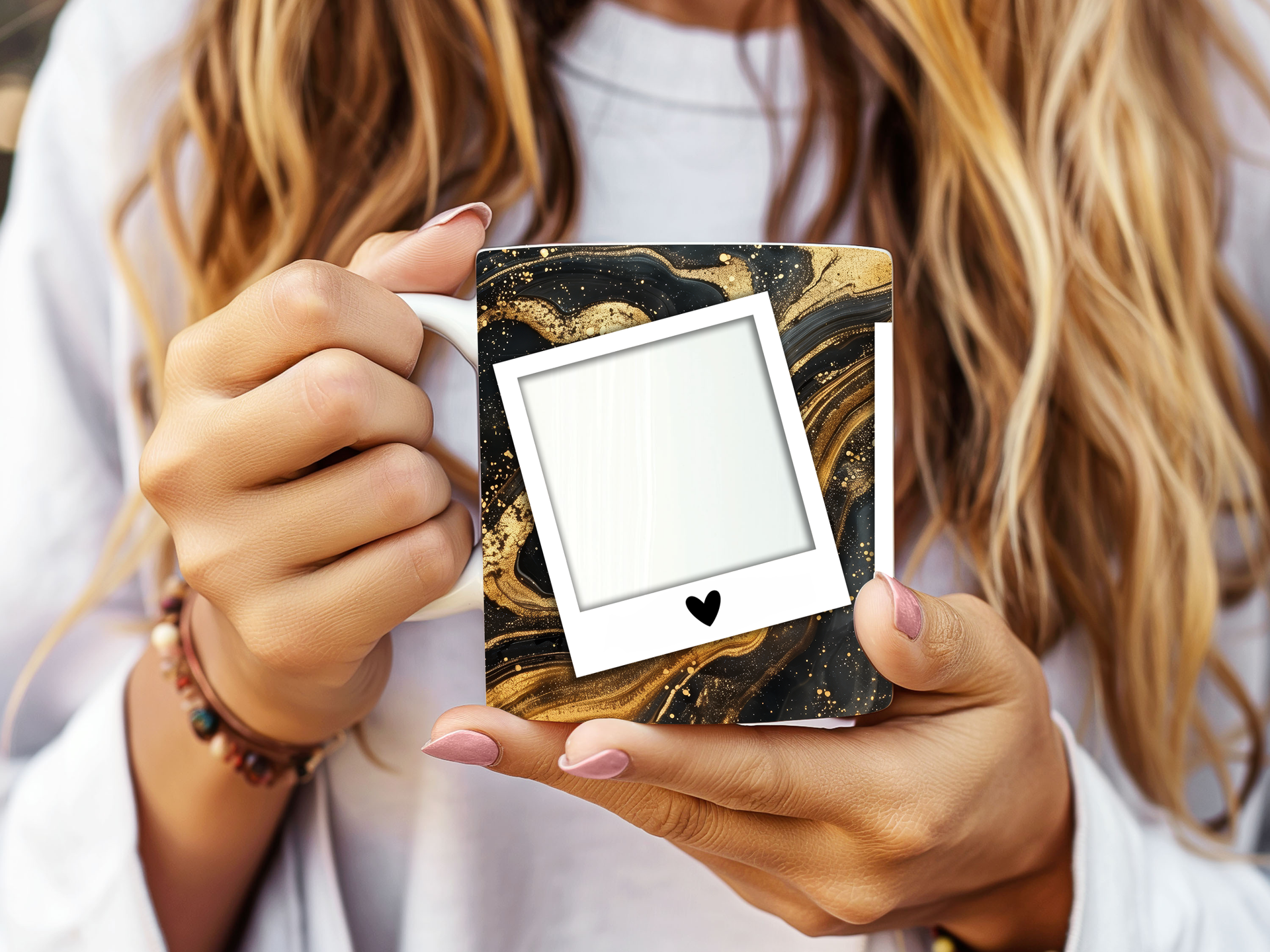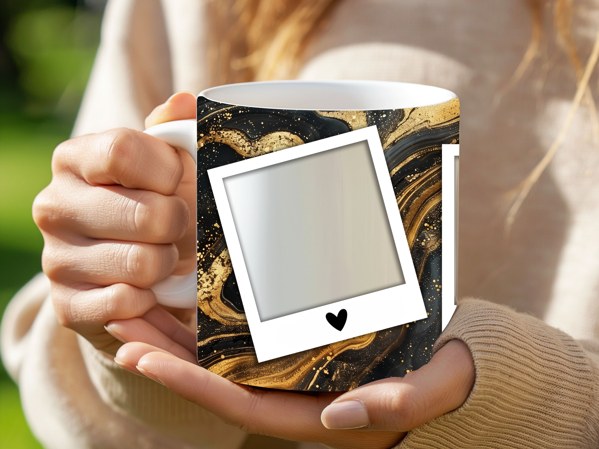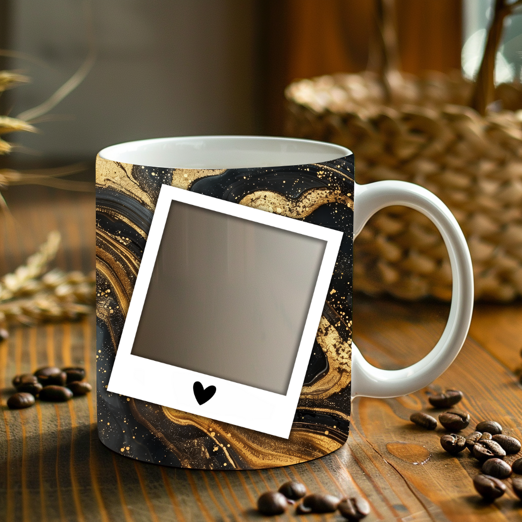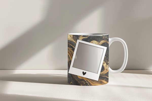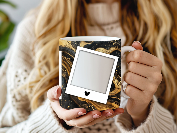 Showcase your cherished memories with our stunning customizable Photo Frame Coffee Mug! This elegant mug features a rich black marble design accented with captivating gold veining, providing a sophisticated backdrop for your favorite moments. Each mug is designed to hold three of your beloved photos within classic polaroid-style frames, each adorned with a charming heart detail. Perfect for your daily coffee or tea, this mug transforms your everyday drinkware into a unique personal keepsake or a thoughtful gift for any occasion. Available in both convenient 11oz and generous 15oz sizes to suit your preference. Simply add your desired photos to create a truly personalized and heartwarming gift!