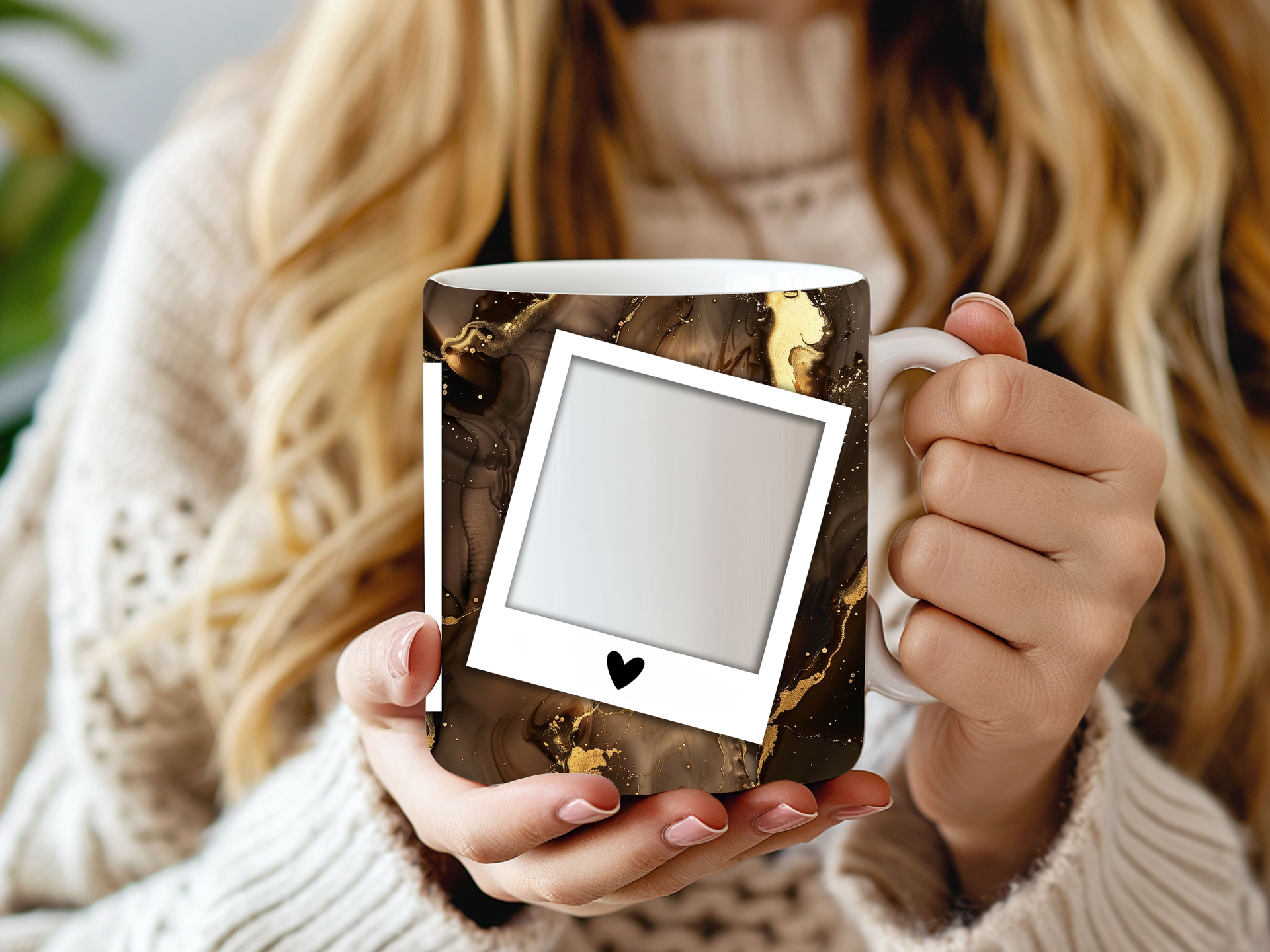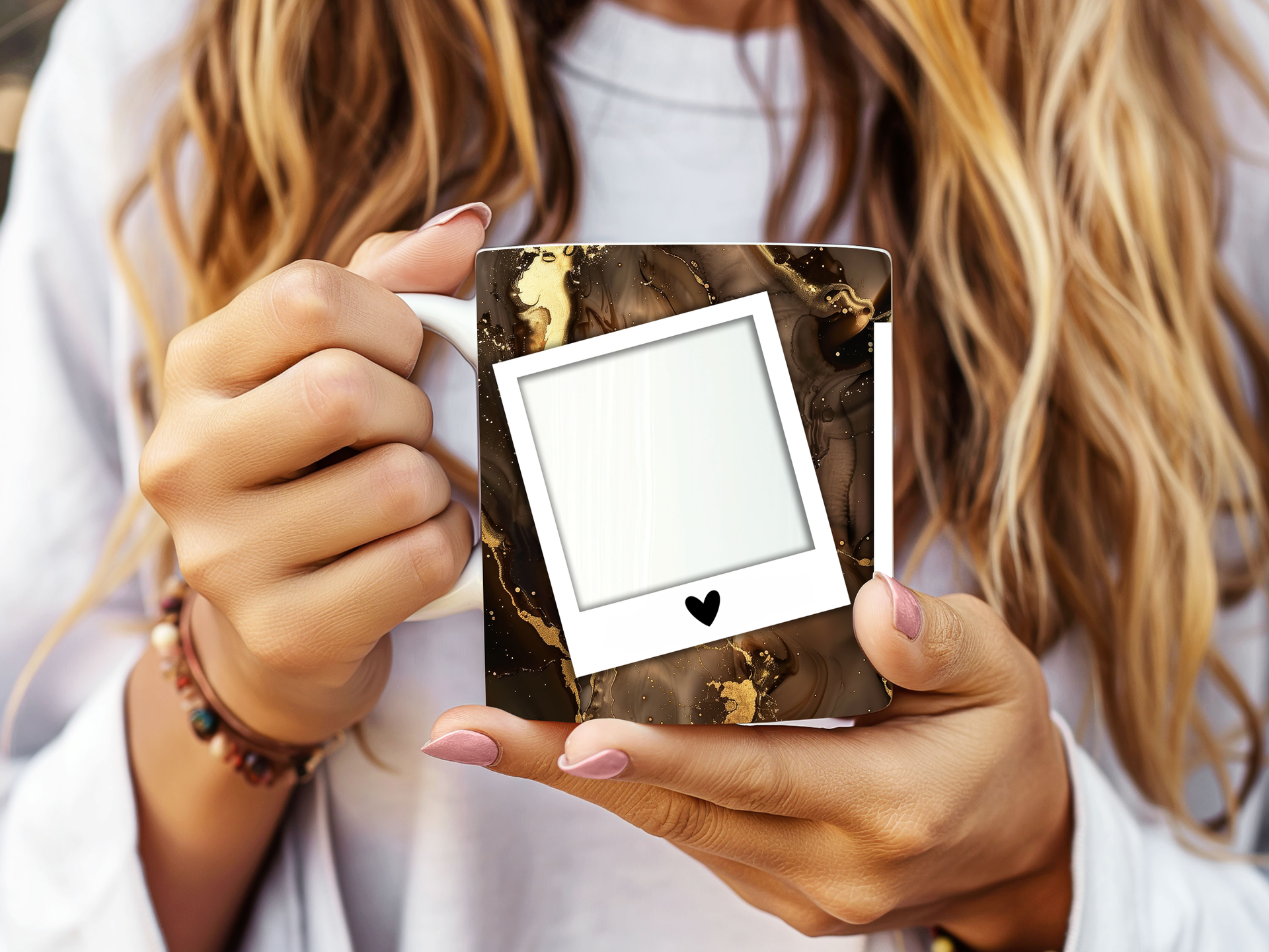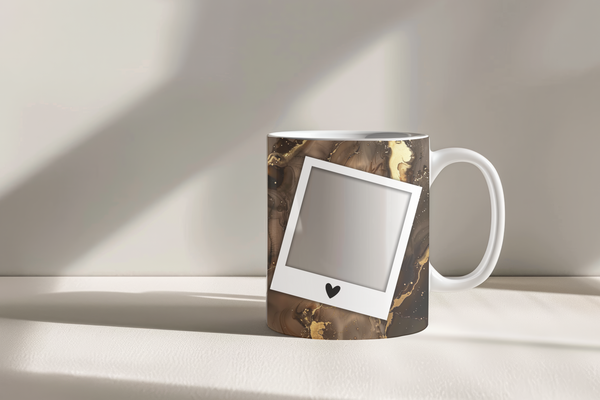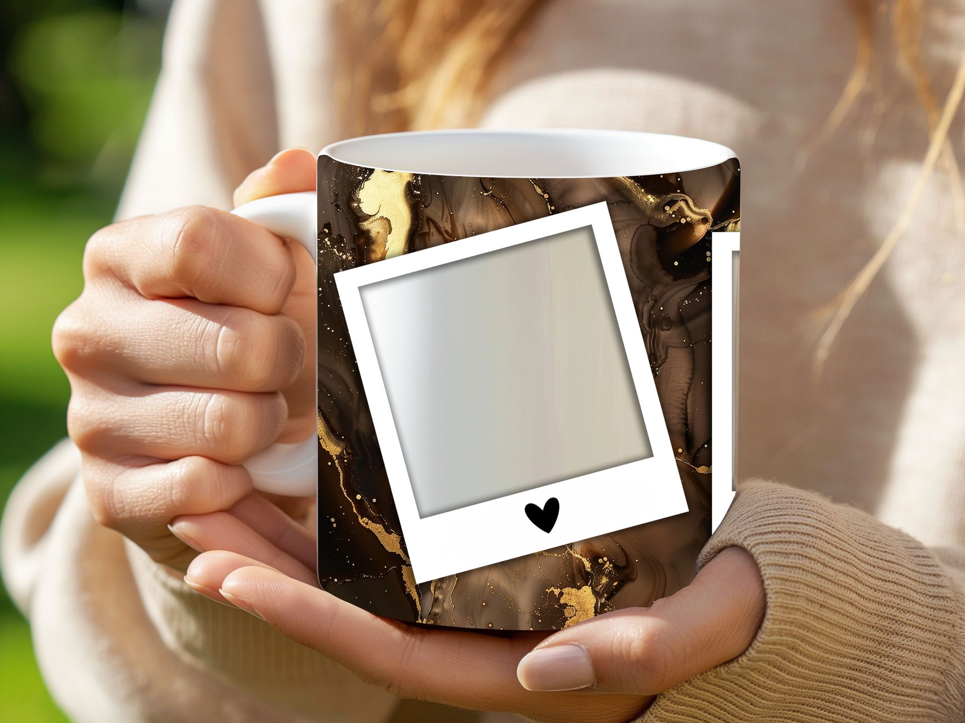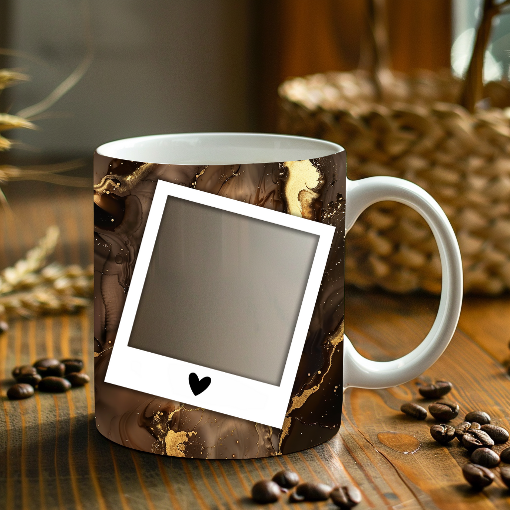 Showcase your treasured memories with our beautifully customizable Photo Frame Coffee Mug! This elegant mug features a rich, earthy brown marble design, beautifully swirled with captivating gold accents, providing a warm and sophisticated backdrop for your favorite moments. Each mug is thoughtfully designed to display three of your beloved photos within classic polaroid-style frames, each subtly adorned with a charming heart detail. Perfect for your daily coffee, tea, or any hot beverage, this mug transforms into a unique personal keepsake or a thoughtful gift for family and friends on any special occasion. It's available in both a convenient 11oz size and a more generous 15oz capacity to suit your preference. Simply add your desired photos to create a truly personalized and heartwarming mug that will be cherished for years to come!