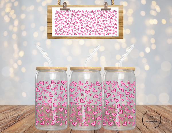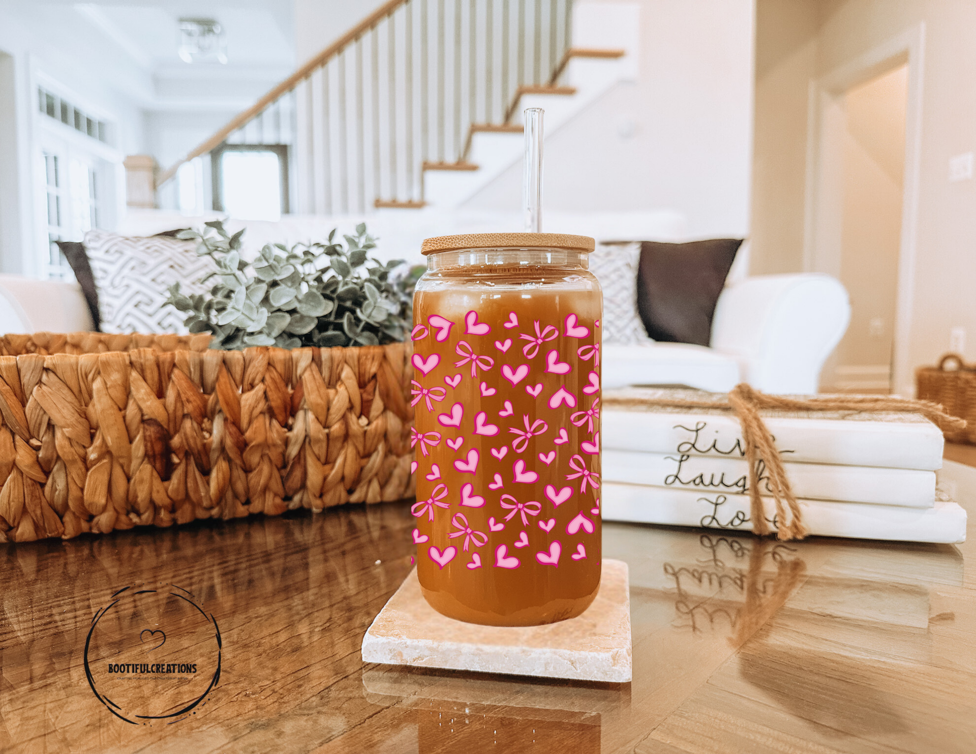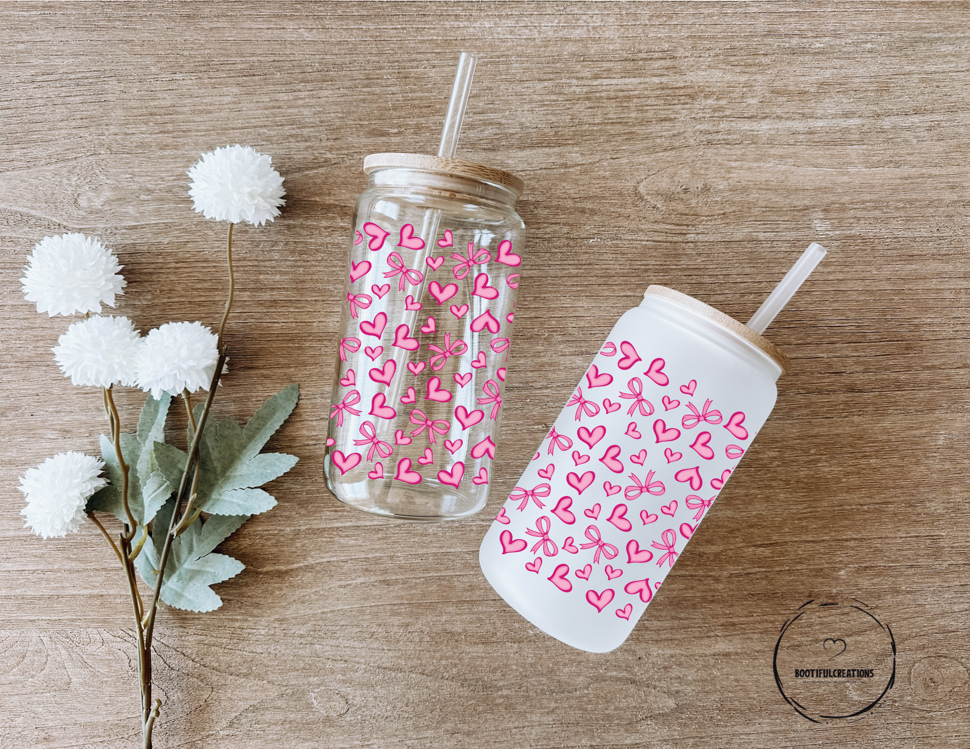 Indulge in a little luxury with our Mini Bows and Hearts Glass Cup. Adorned with a charming pattern, this 16oz cup comes in both clear and frosted options. Feel the love with every sip!