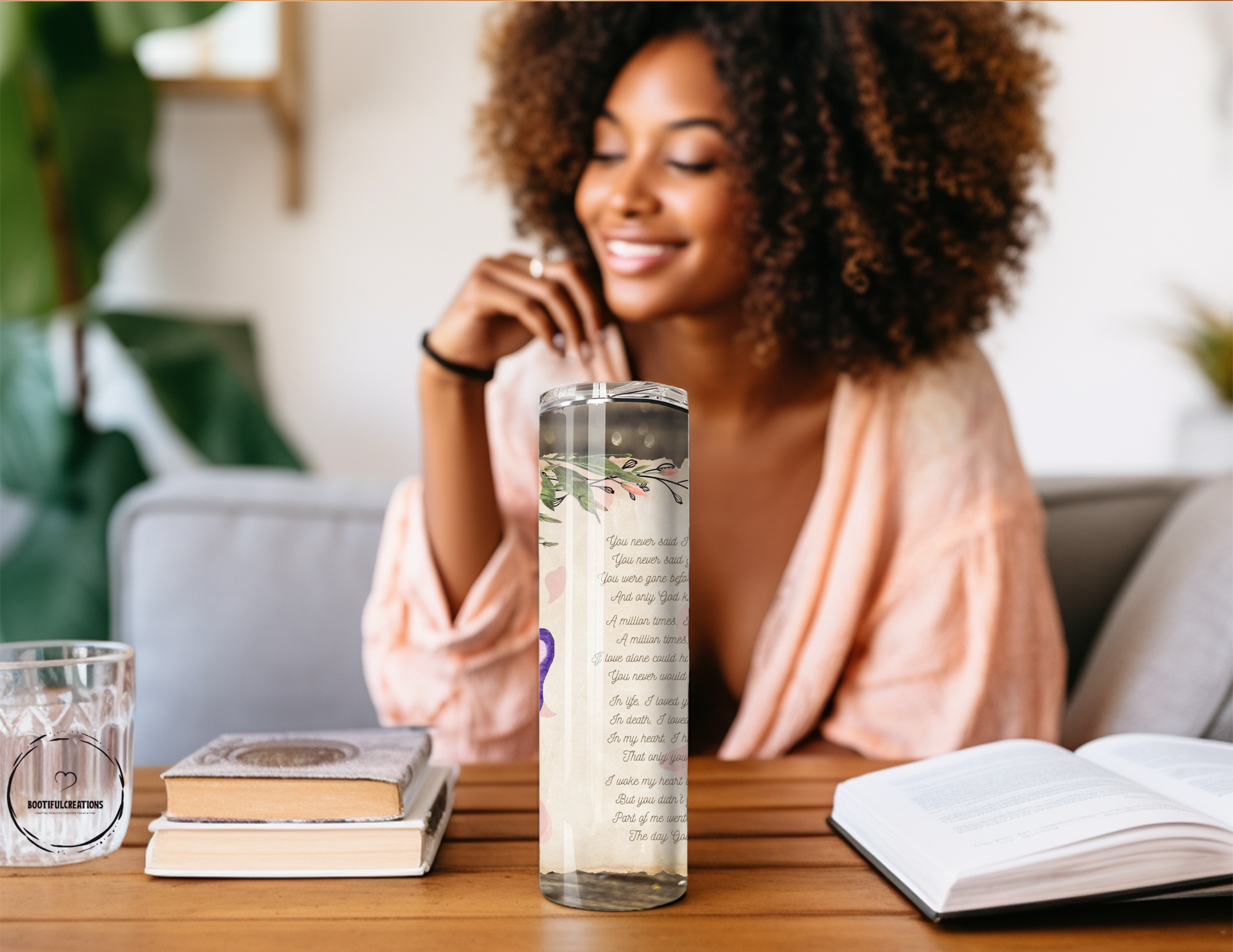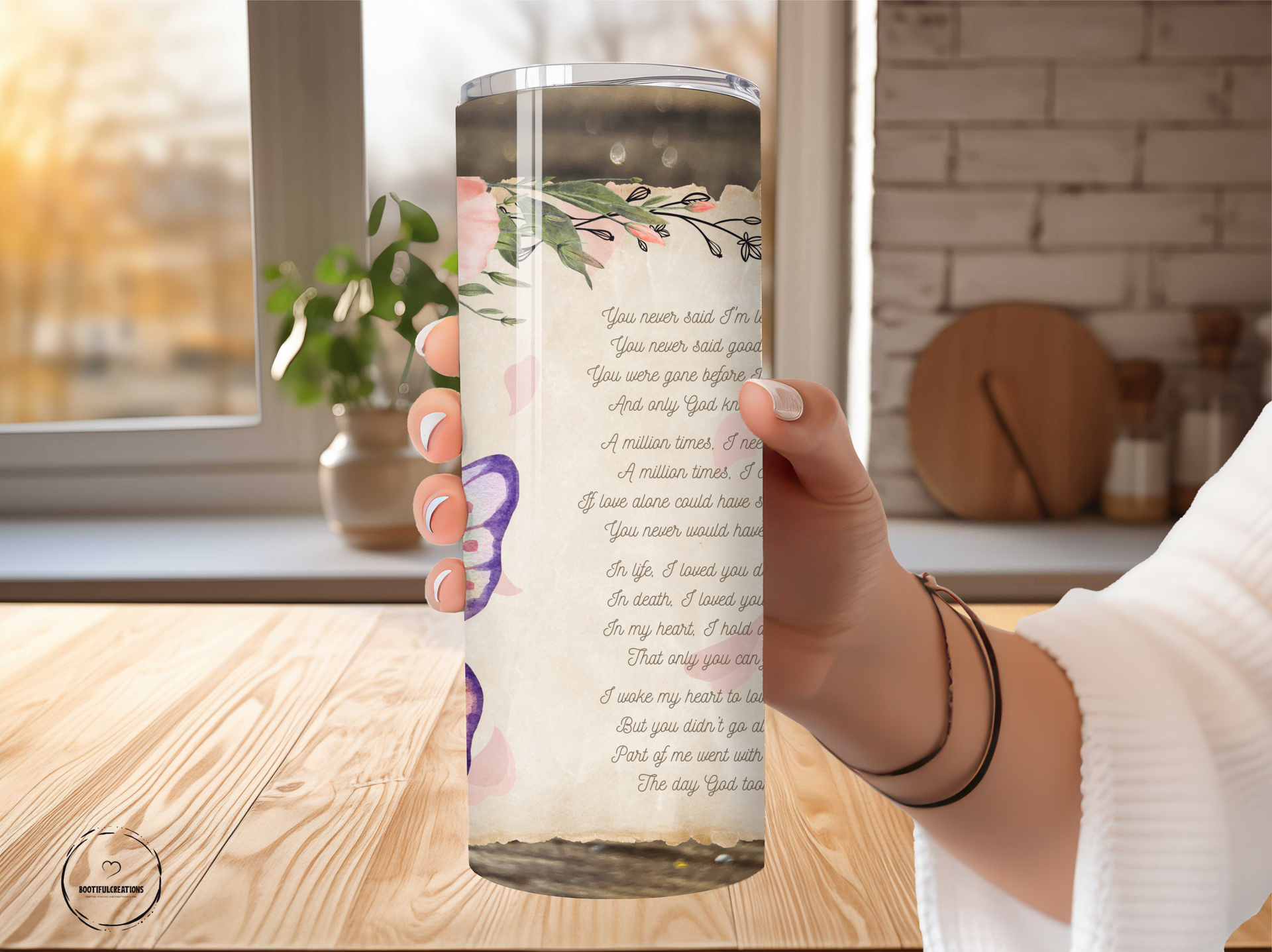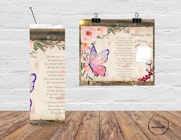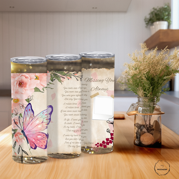 Keep your loved ones close with our Missing You Always Butterfly Photo Tumbler. Adorned with a heartfelt design and touching poem, this tumbler features a white space for a personalized photo. It can keep your drink hot for up to 6 hours and cold for up to 24 hours. Customize it with a name and hold on to cherished memories.