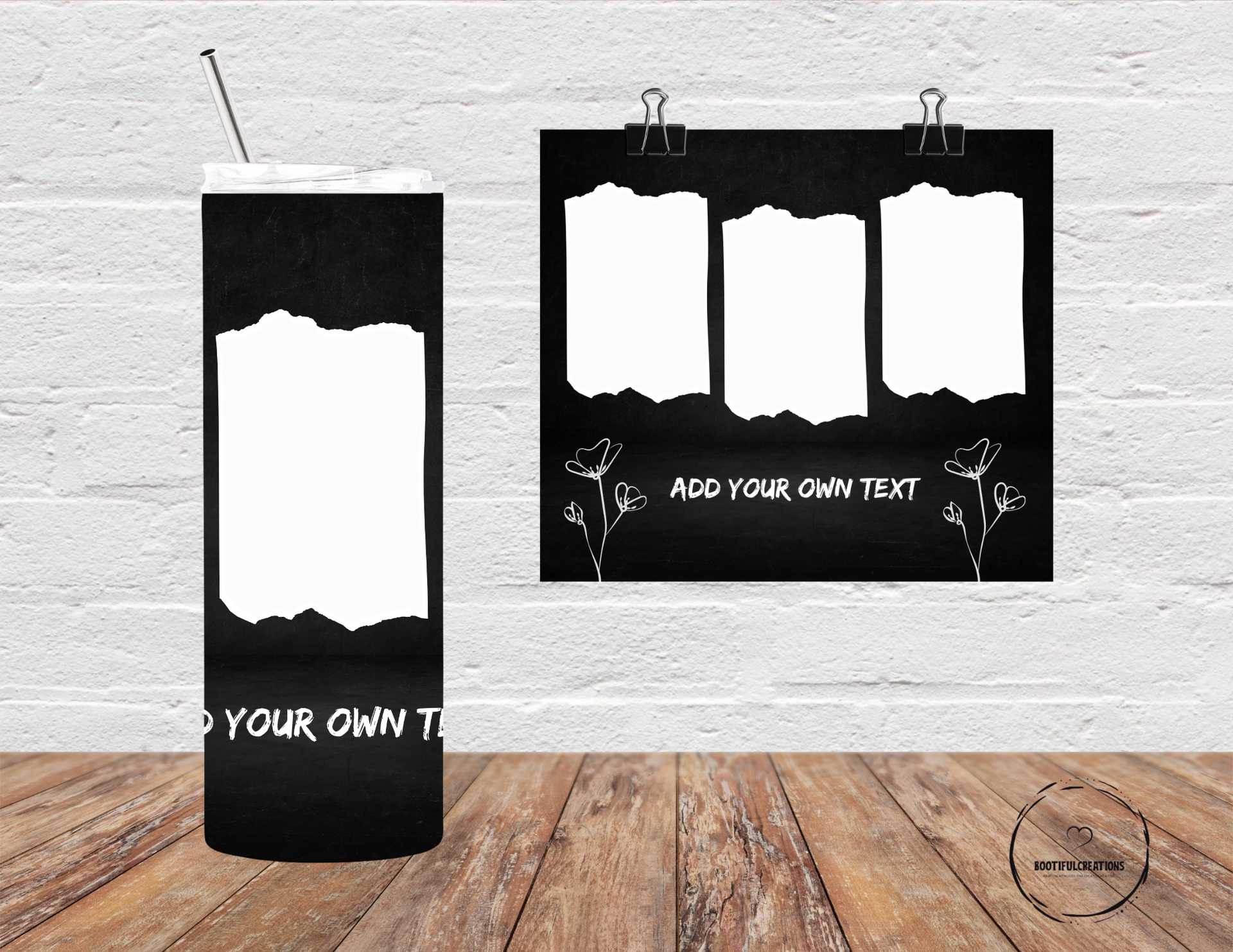 Stay hydrated in style with our Modern Minimalist Black Photo Tumbler. Featuring a unique torn paper design, customize it with your own text and showcase up to 3 photos in the white spaces. Keep your drinks hot for up to 6 hours and cold for up to 24 hours. Make it personal with a name! Order now and elevate your beverage experience!
