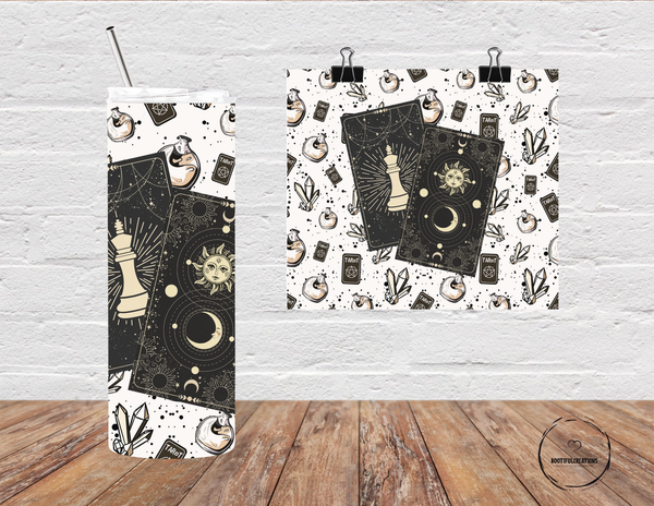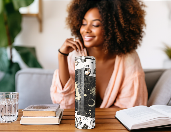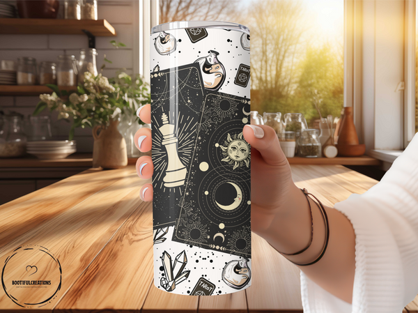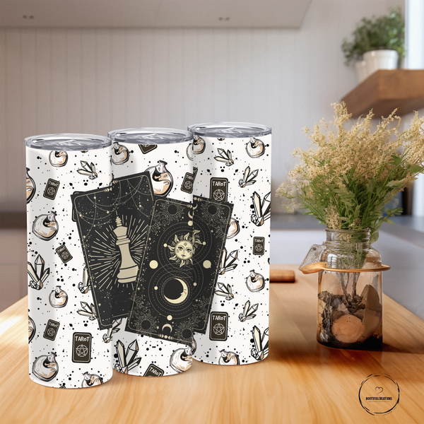 Experience the magic in every sip with our Mystical Tarot-Themed Tumbler! Adorned with tarot cards, crystals, and celestial imagery, this tumbler keeps your drink hot for up to 6 hours and cold for up to 24 hours. Personalize it with your name for a unique touch. Perfect for any mystical enthusiast!