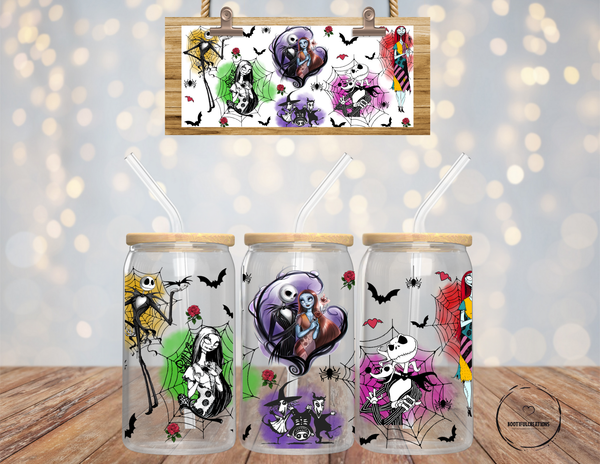 Experience the magic of Halloween and Christmas all year round! Our 16 oz glass cup features the beloved characters Sally, Jack, and Zero from the iconic movie "The Nightmare Before Christmas". Choose between a clear or frosted cup and add a touch of nostalgia to your everyday drinkware.