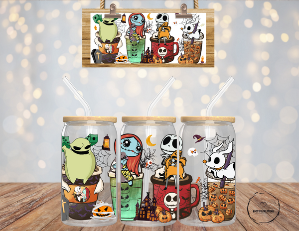 Transform your morning routine with our Nightmare Before Christmas Glass Cup! Featuring iconic characters such as Jack, Sally, and Oogie Boogie, this stunning 16oz glass cup is perfect for all your coffee needs. Choose between clear or frosted and add some spooky fun to your drinkware collection.