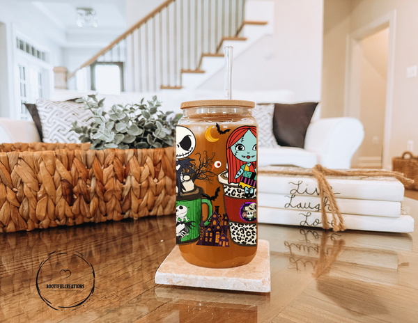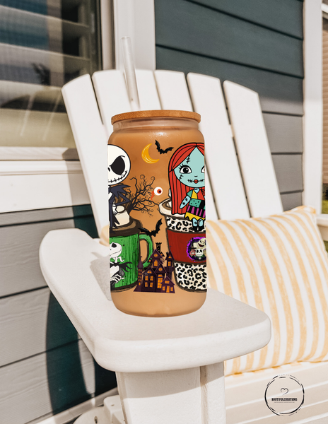 Get ready for a spooky night with our Nightmare Before Christmas 16oz glass cup! Featuring your favorite characters - Barrell, Jack, Sally, and Oogie Boogie - this cup is perfect for any fan. Choose from clear or frosted glass, and enjoy your drink in style. Don't miss out on this must-have for any Halloween party!