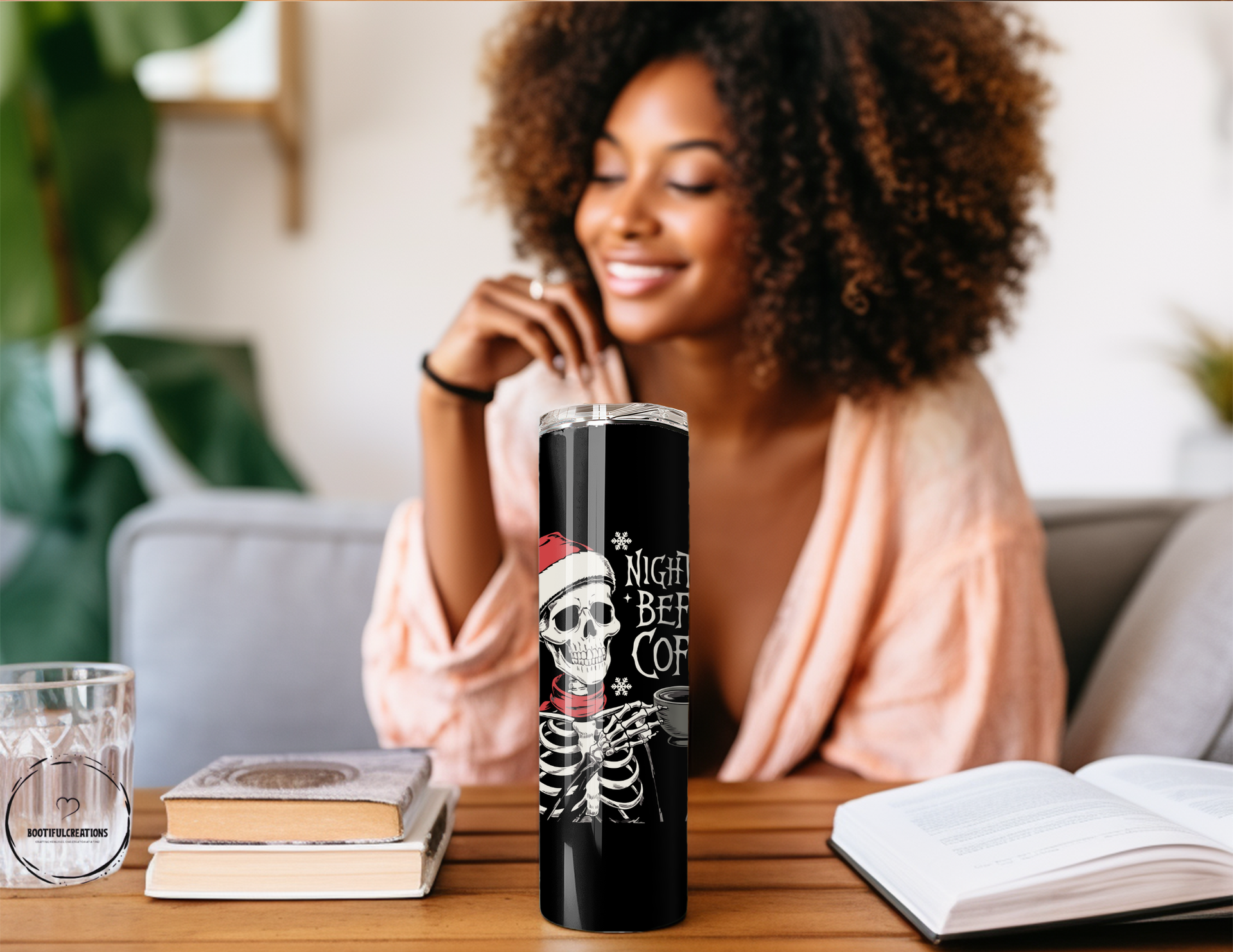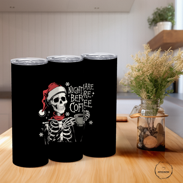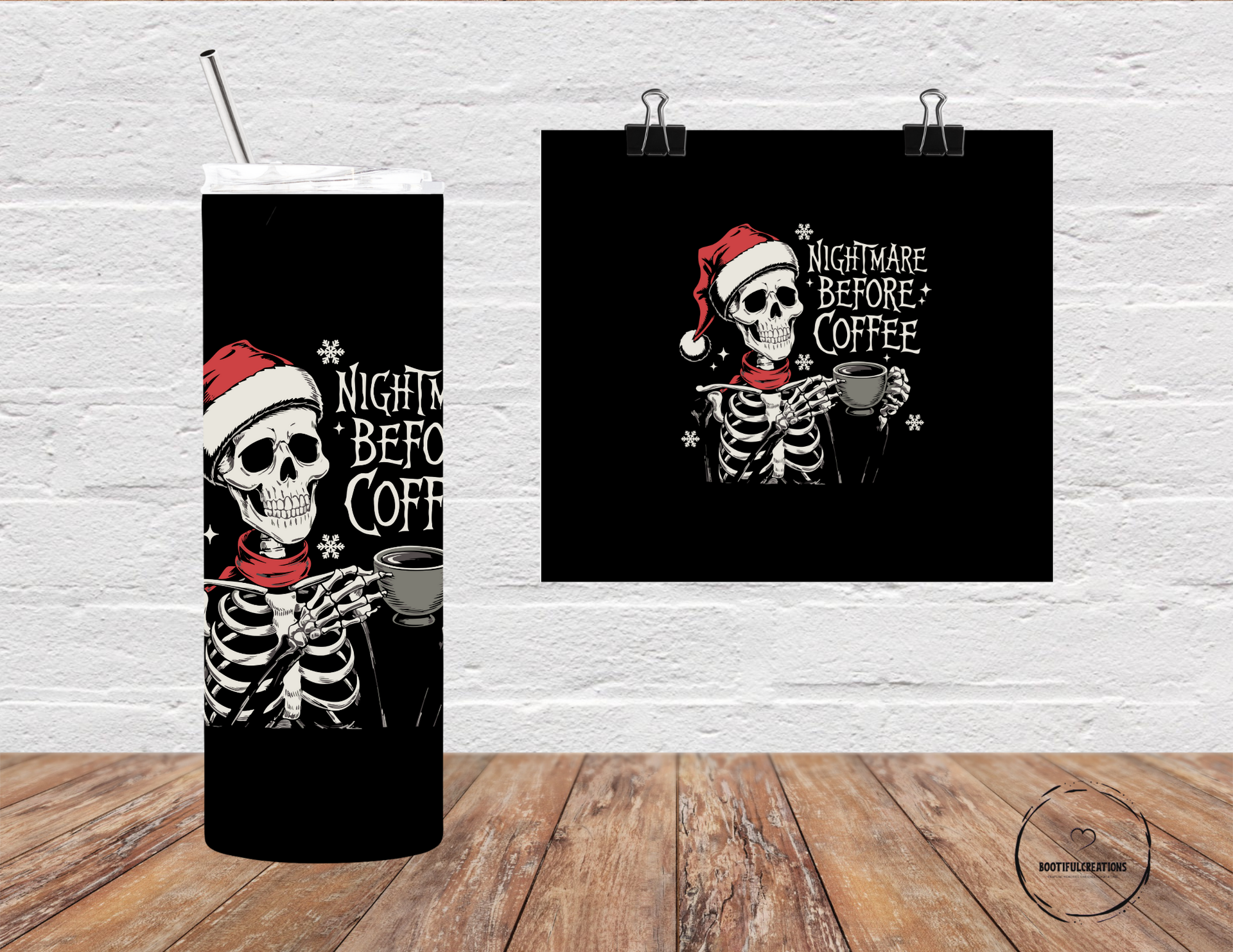 Start your day off right with our Nightmare Before Coffee Tumbler! Featuring a festive skeleton wearing a Santa hat, this tumbler will keep your drink hot for up to 6 hours and cold for up to 24 hours. Plus, it can be personalized with a name for that extra special touch. Don't let the morning blues get you down, grab your tumbler and embrace the day with a sip of happiness!