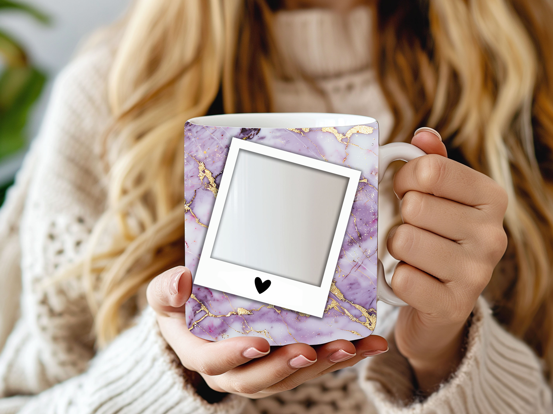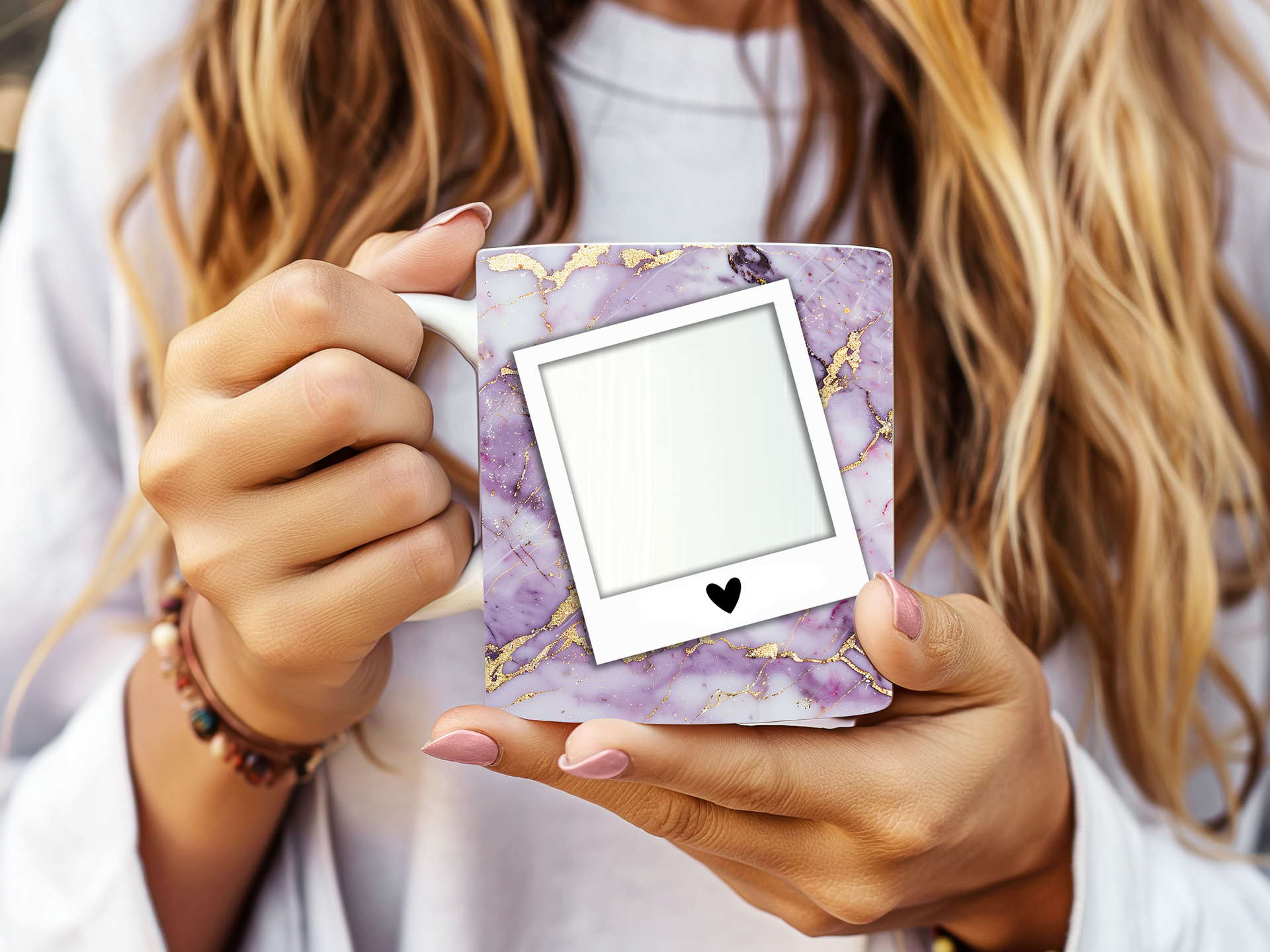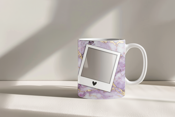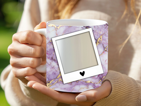 Add a touch of serene elegance and personal charm to your daily coffee or tea ritual with our Pastel Purple Marble Personalized Photo Mug. This lovely mug features a delicate blend of soft purple (lilac) and subtle gold marble patterns, creating a sophisticated and calming aesthetic. Two classic polaroid-style frames, each subtly accented with a sweet heart, are perfectly integrated and ready to display your most cherished photos. Crafted from durable ceramic and available in both the popular 11oz and generous 15oz sizes to suit any preference.
