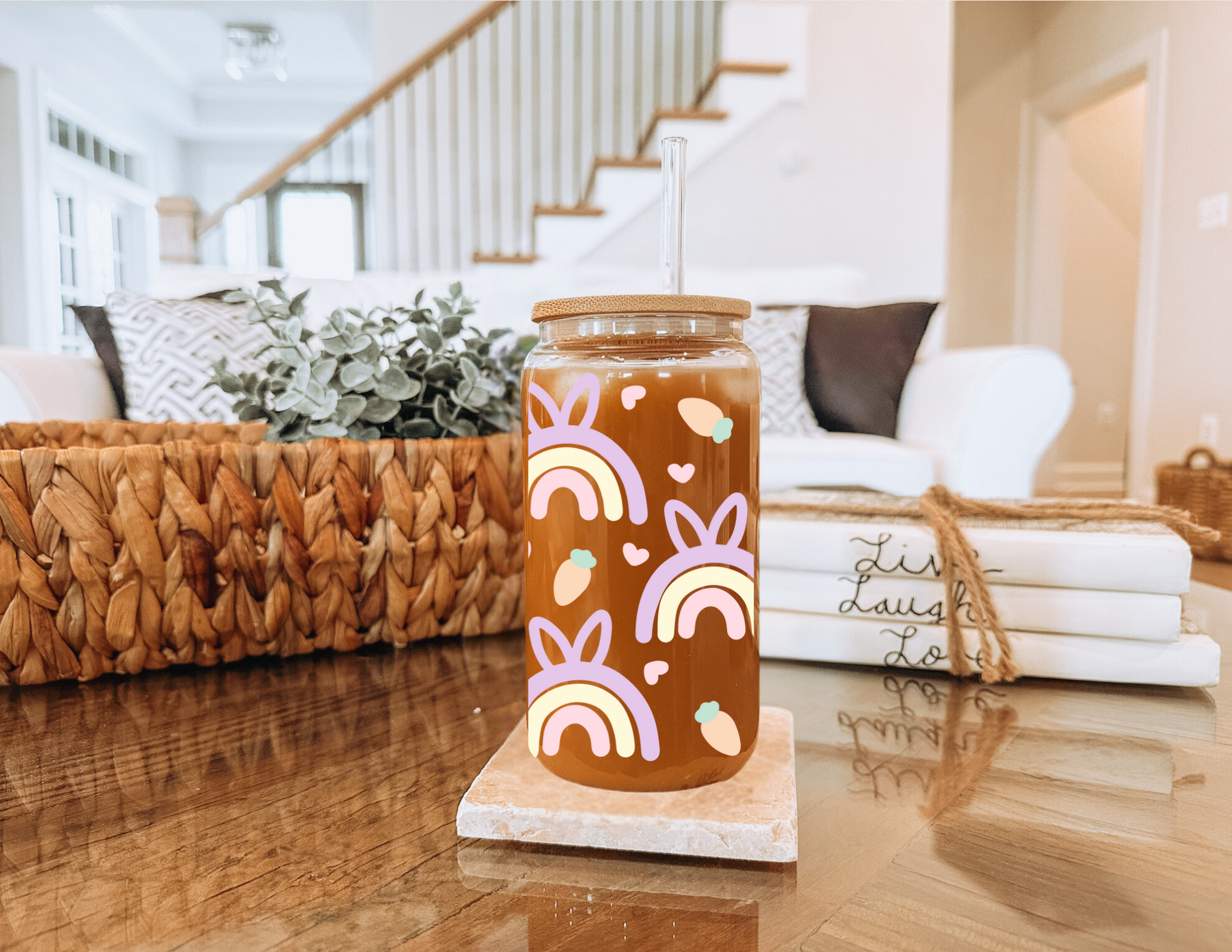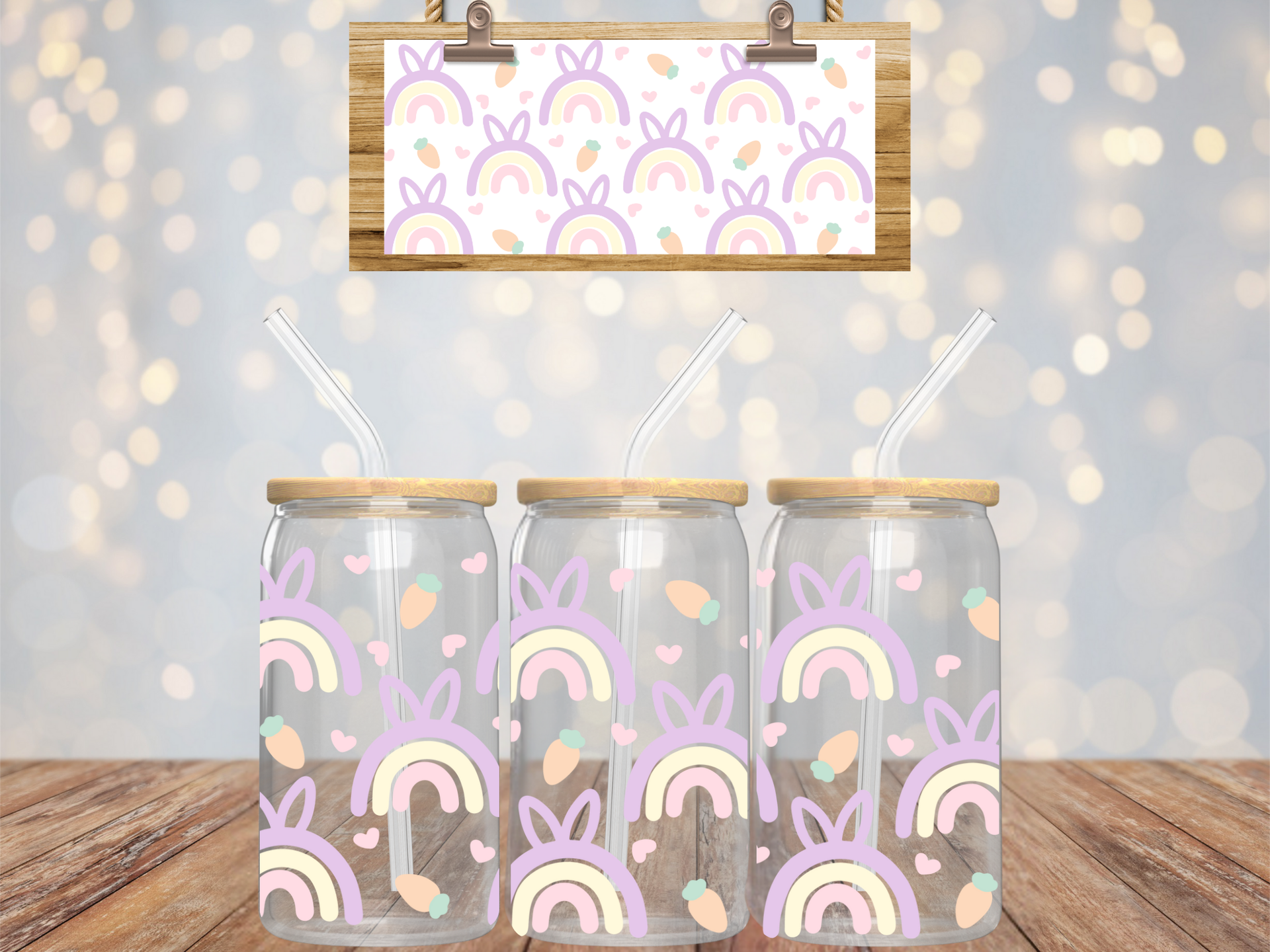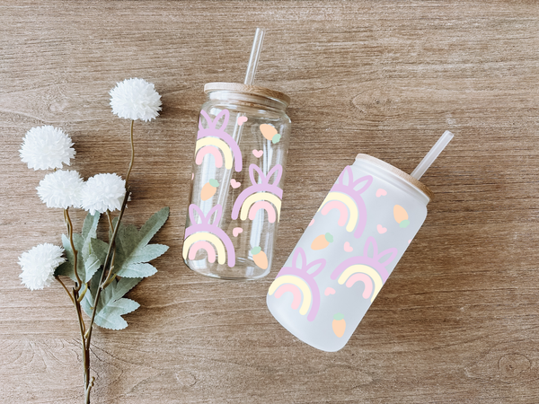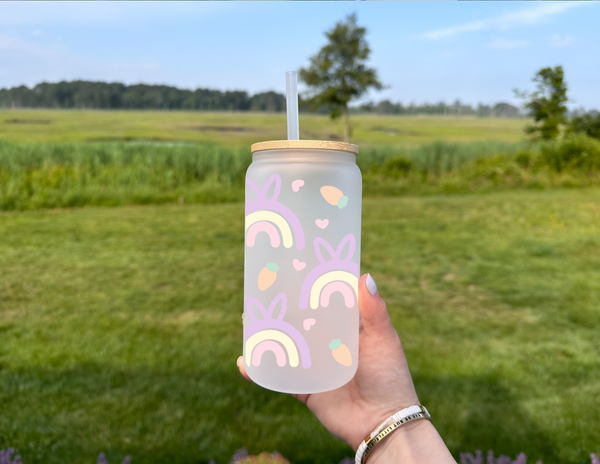 Add a pop of color to your Easter table with this quirky pastel rainbow glass cup! With a cute bunny ears pattern and a generous 16oz size, it's perfect for sipping on your favorite beverages. Hop to it and grab one now!