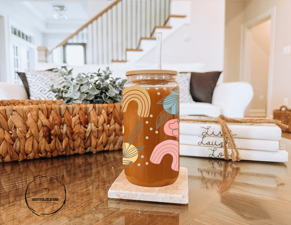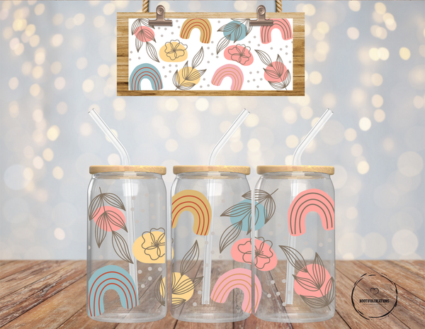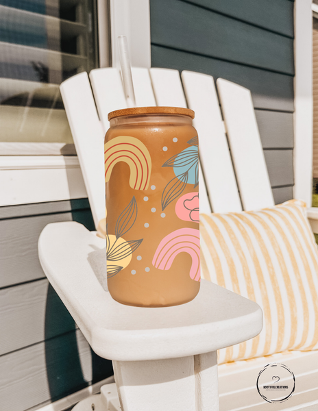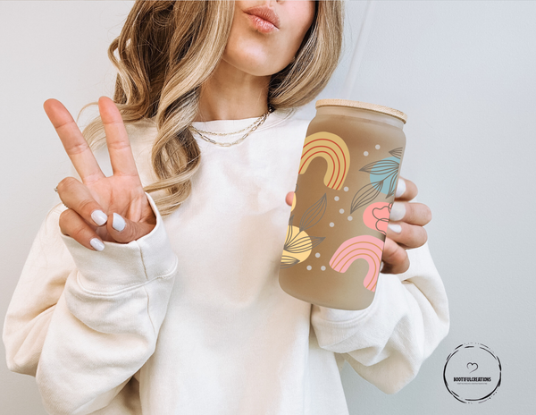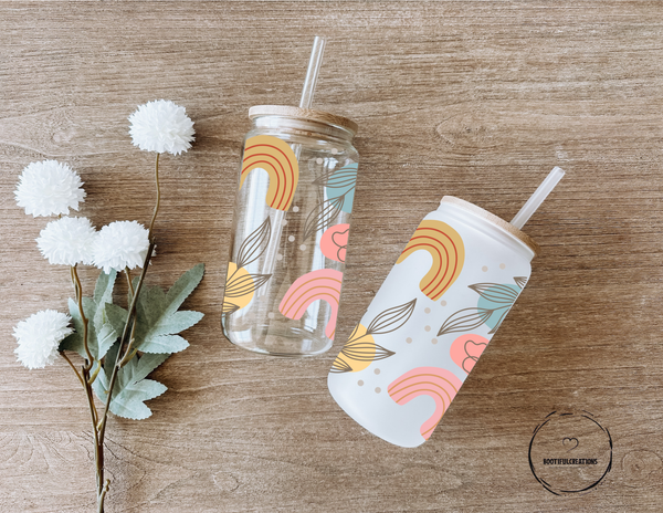Indulge in a dreamy drink experience with our Pastel Rainbows Glass Cup. Sip in style with the 16oz cup, available in clear or frosted. Let the beautiful pastel rainbows dance on your taste buds and add a touch of magic to your day!