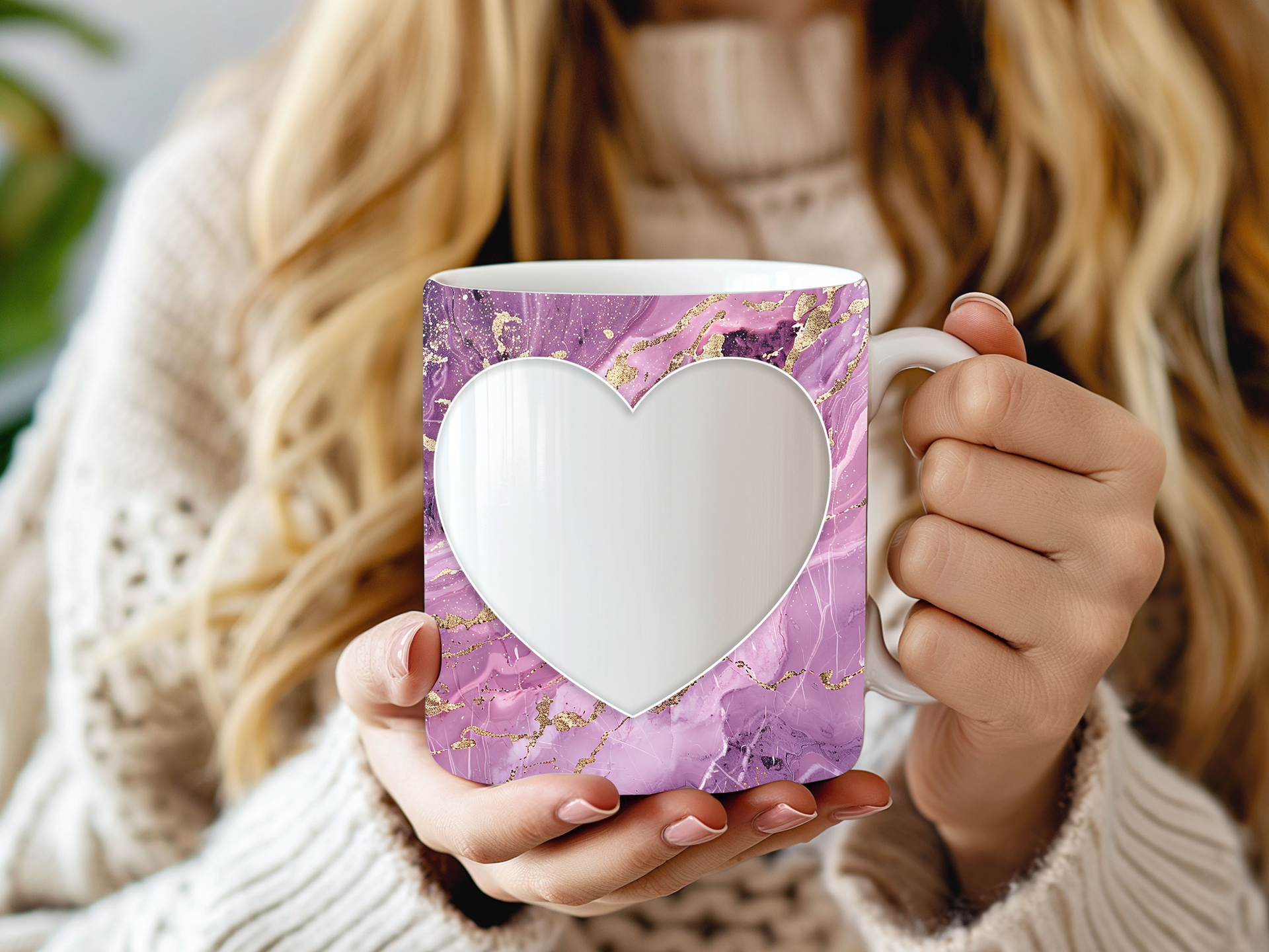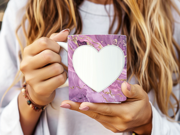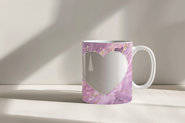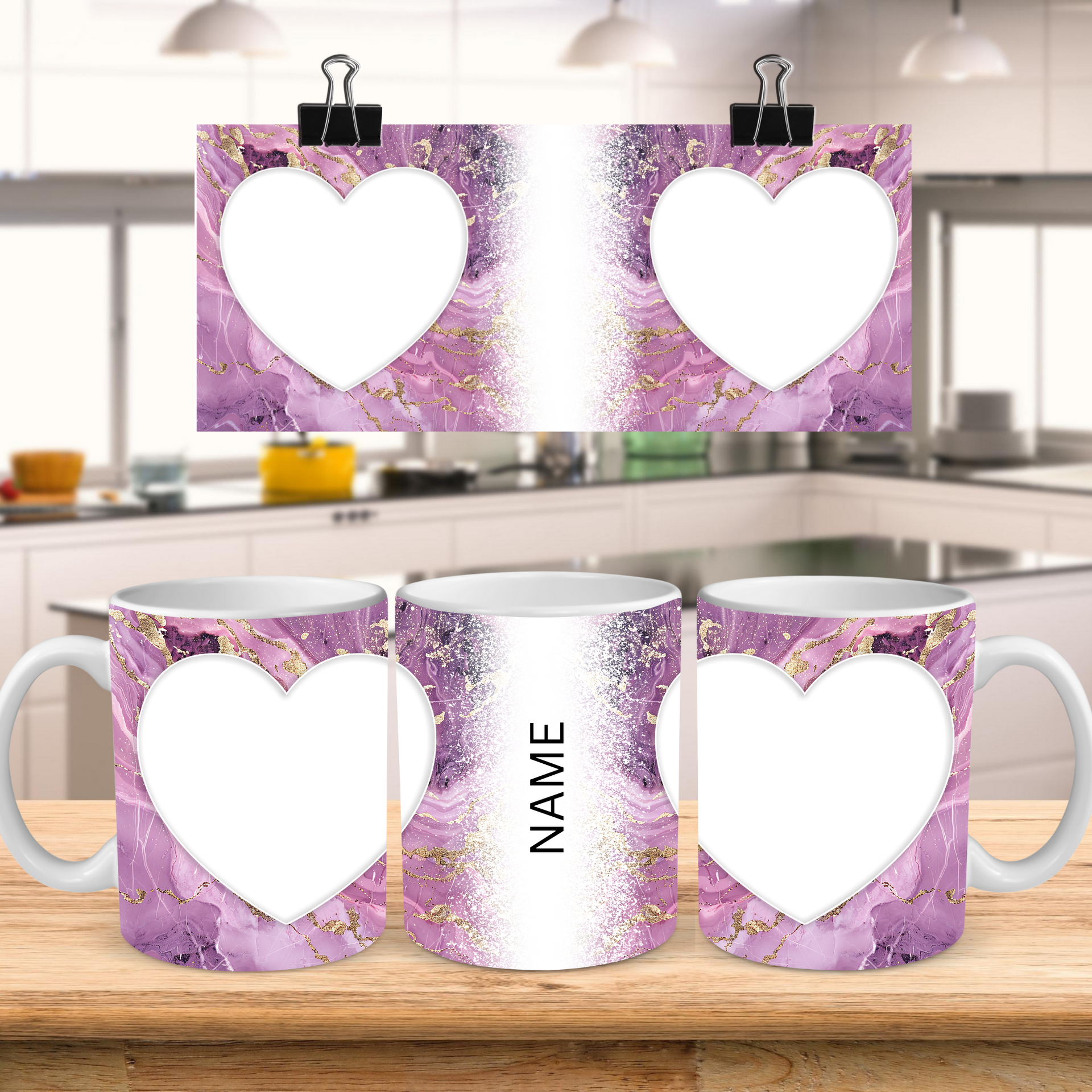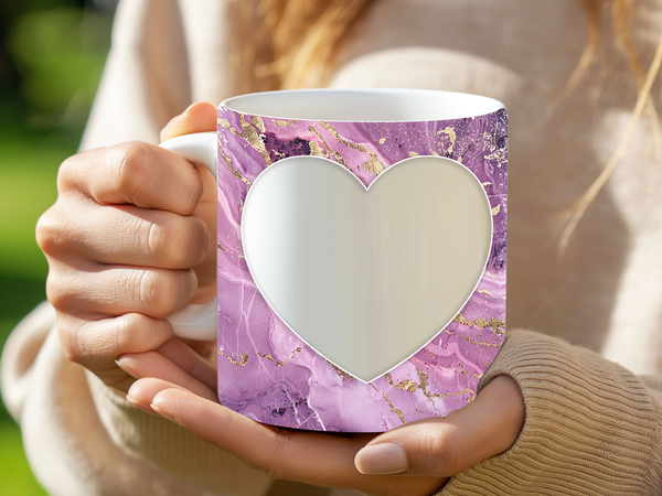 Elevate your daily coffee or tea ritual with our exquisite Personalized Amethyst Marble Heart Photo Mug. This stunning mug features a captivating blend of rich purple and delicate gold marble patterns, reminiscent of natural amethyst, creating an elegant and sophisticated design. Two prominent heart-shaped frames are perfectly integrated, ready to hold your most cherished photos, making this mug a truly heartfelt keepsake. Crafted from durable ceramic and available in both the popular 11oz and generous 15oz sizes to suit any preference.