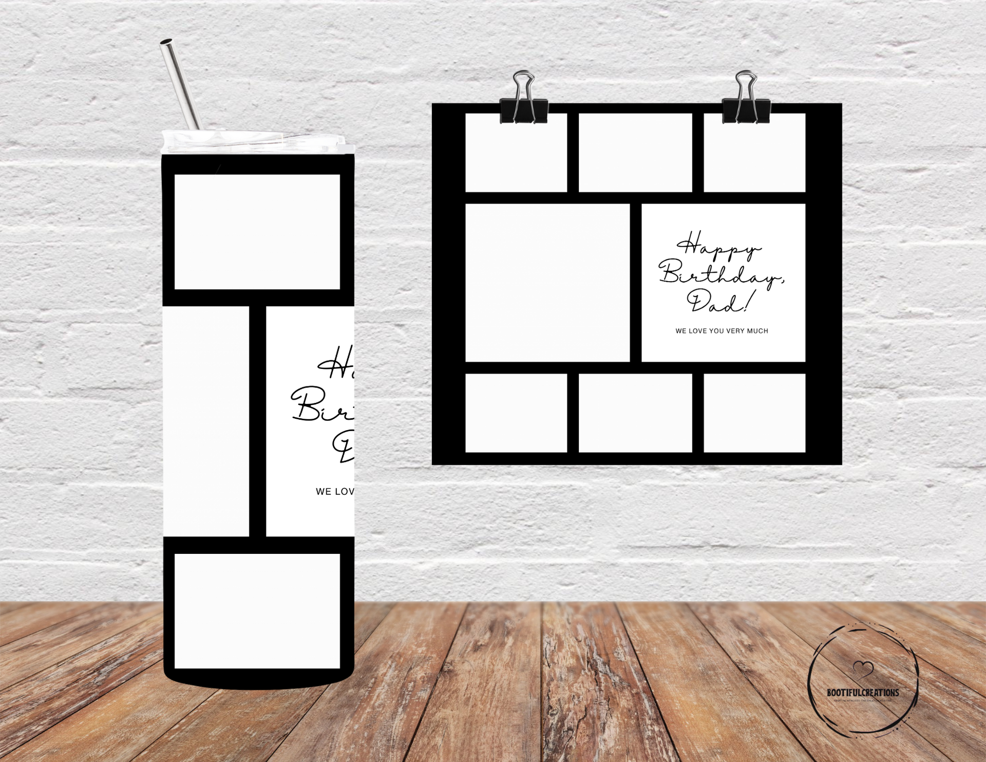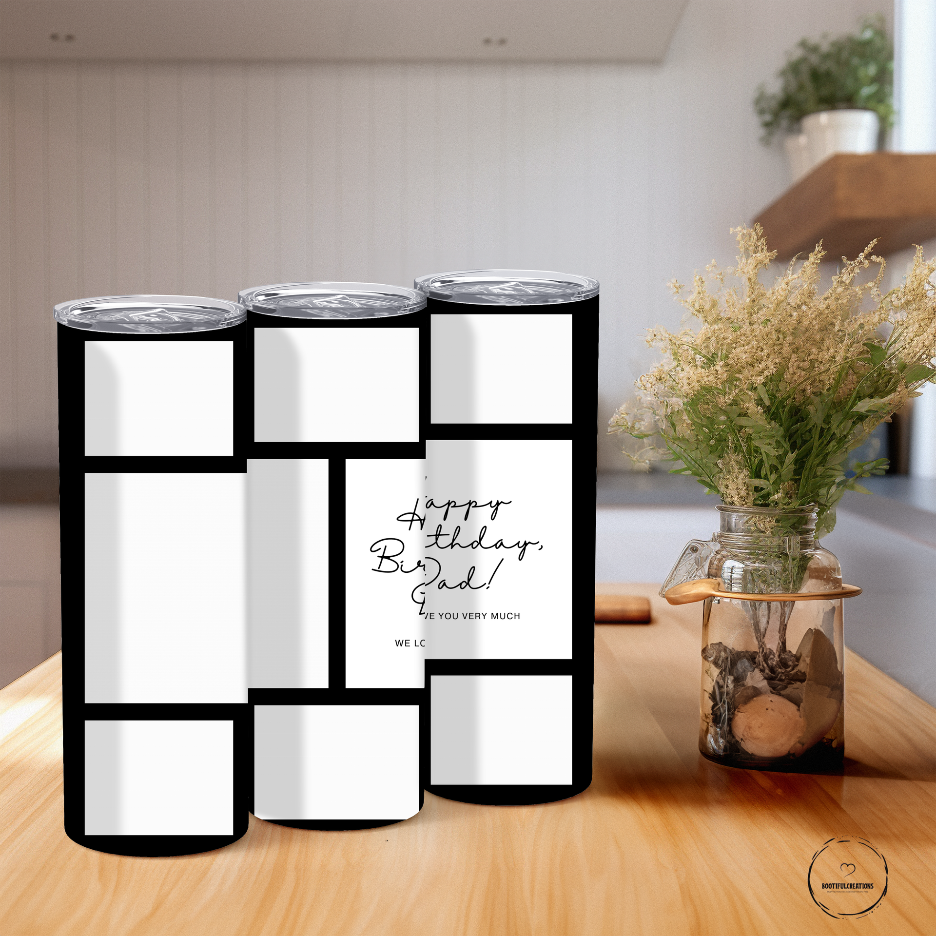 Surprise your dad with this sleek personalized tumbler featuring a "Happy Birthday, Dad!" message and space for 7 photos. Keep drinks hot for 6 hours and cold for 24 hours while showing your love in a modern black and white design. Make it even more special by adding his name.