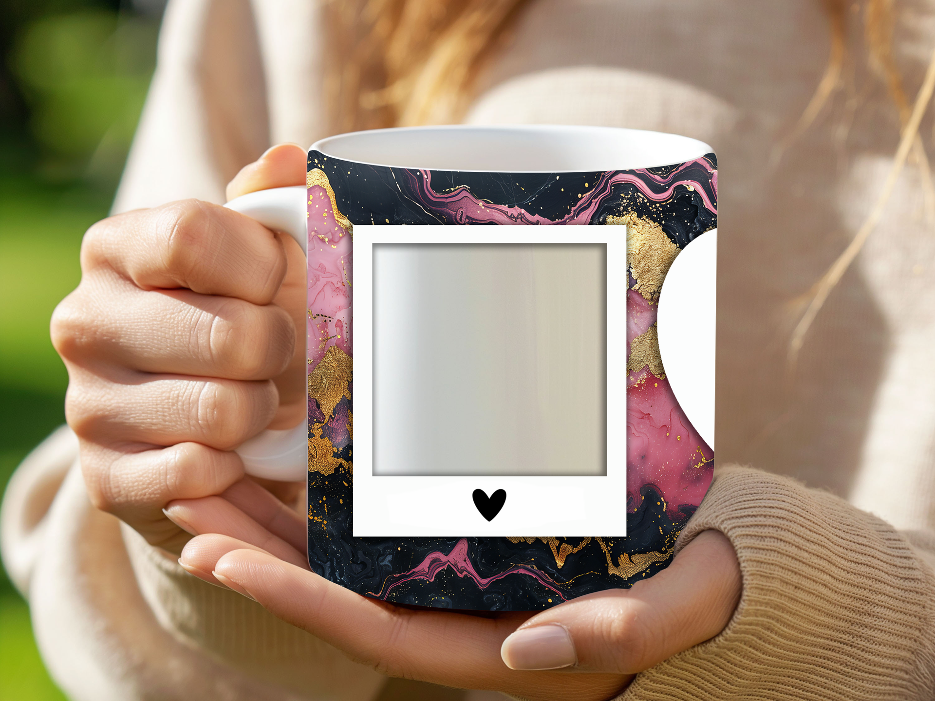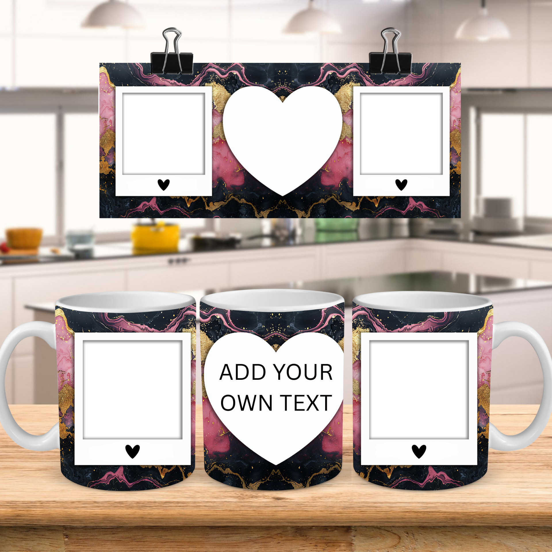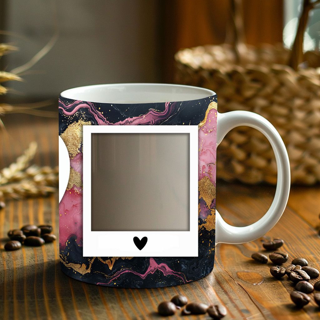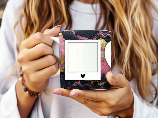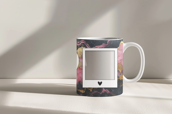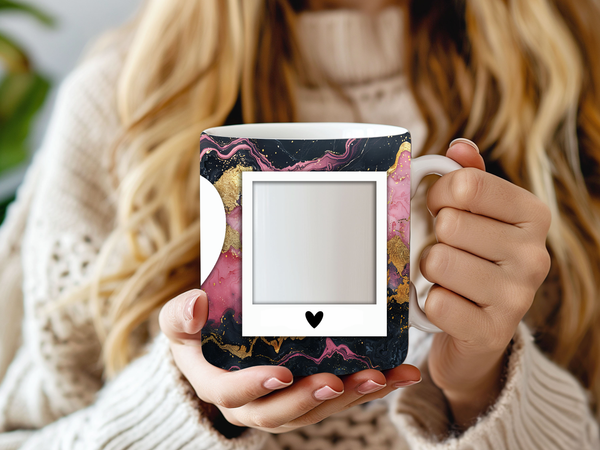 Showcase your cherished memories and heartfelt messages with our stunning customizable Photo & Text Coffee Mug! This elegant mug features a dynamic and artistic marble design, blending vibrant pinks, deep purples/blacks, and shimmering gold accents, creating a captivating backdrop for your personalization. It's thoughtfully designed to display two of your beloved photos within classic polaroid-style frames, each subtly adorned with a charming heart detail. The central heart shape is perfect for adding your own custom text, making it truly unique. Perfect for your daily coffee, tea, or any hot beverage, this mug transforms into a unique personal keepsake or a thoughtful gift for family and friends on any special occasion. It's available in both a convenient 11oz size and a more generous 15oz capacity to suit your preference. Simply add your desired photos and text to create a truly personalized and heartwarming mug that will be treasured for years to come!