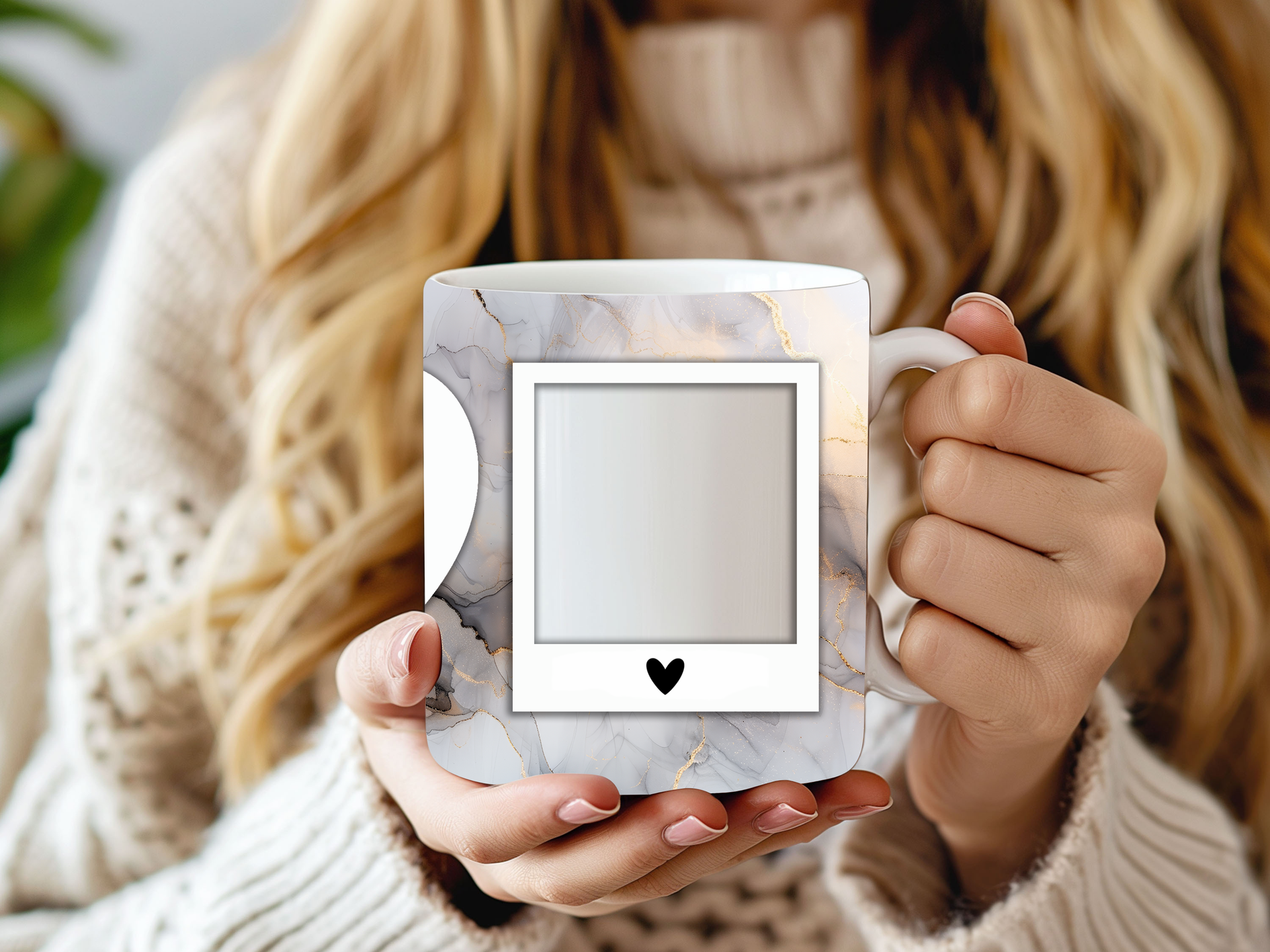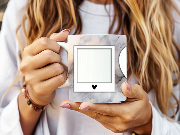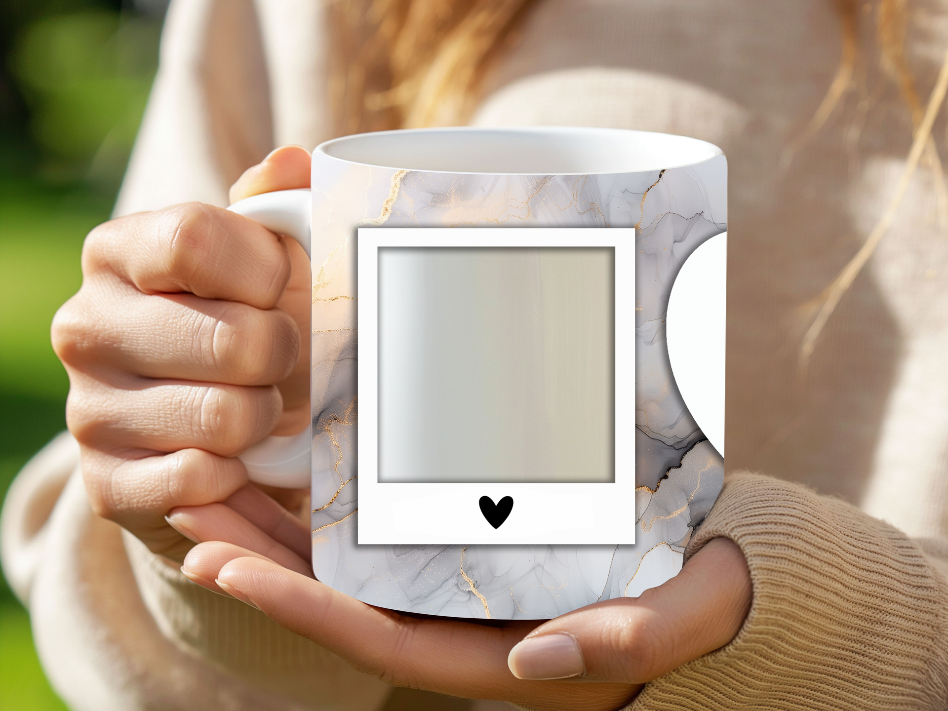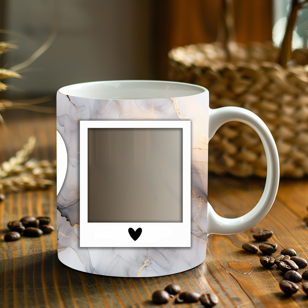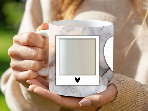 Showcase your cherished memories and heartfelt messages with our stunning customizable Photo & Text Coffee Mug! This elegant mug features a subtle light grey/white marble design, beautifully accented with delicate gold veins, creating a serene and artistic backdrop for your personalization. It's thoughtfully designed to display two of your beloved photos within classic polaroid-style frames, each subtly adorned with a charming heart detail. The central heart shape is perfect for adding your own custom text, making it truly unique. Perfect for your daily coffee, tea, or any hot beverage, this mug transforms into a unique personal keepsake or a thoughtful gift for family and friends on any special occasion. It's available in both a convenient 11oz size and a more generous 15oz capacity to suit your preference. Simply add your desired photos and text to create a truly personalized and heartwarming mug that will be treasured for years to come!