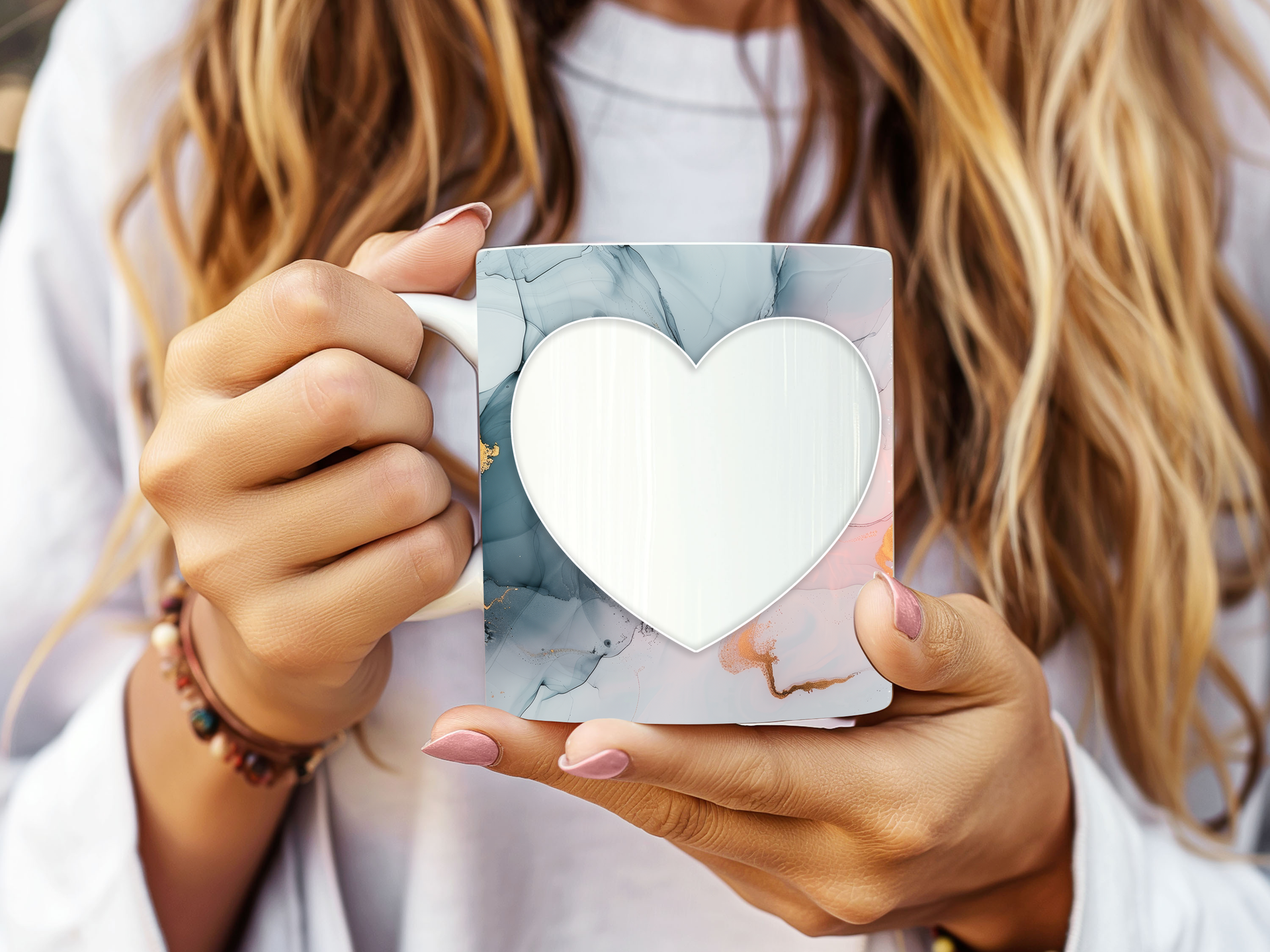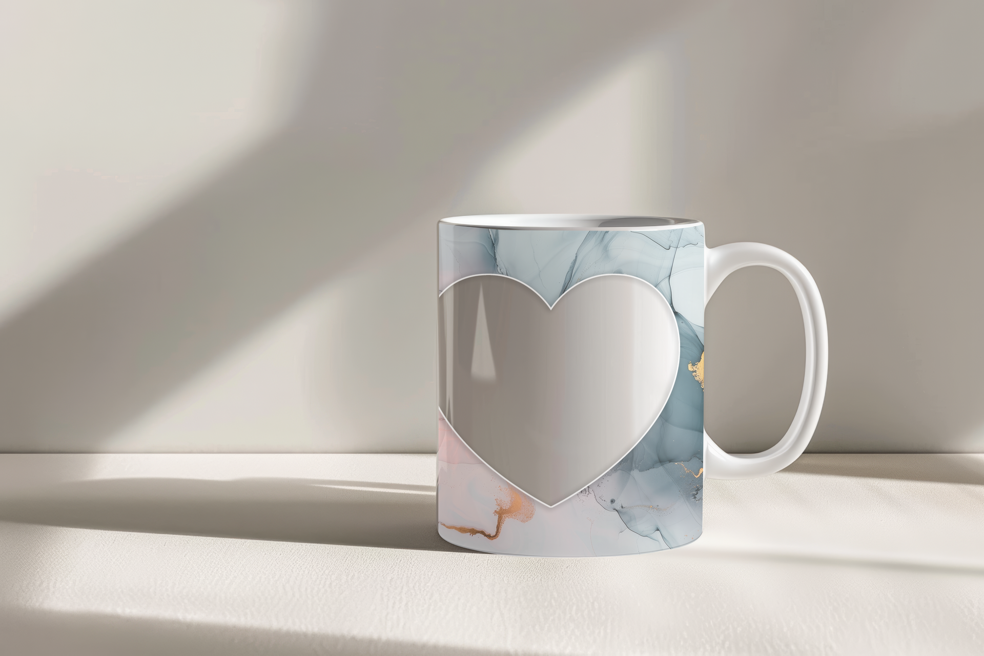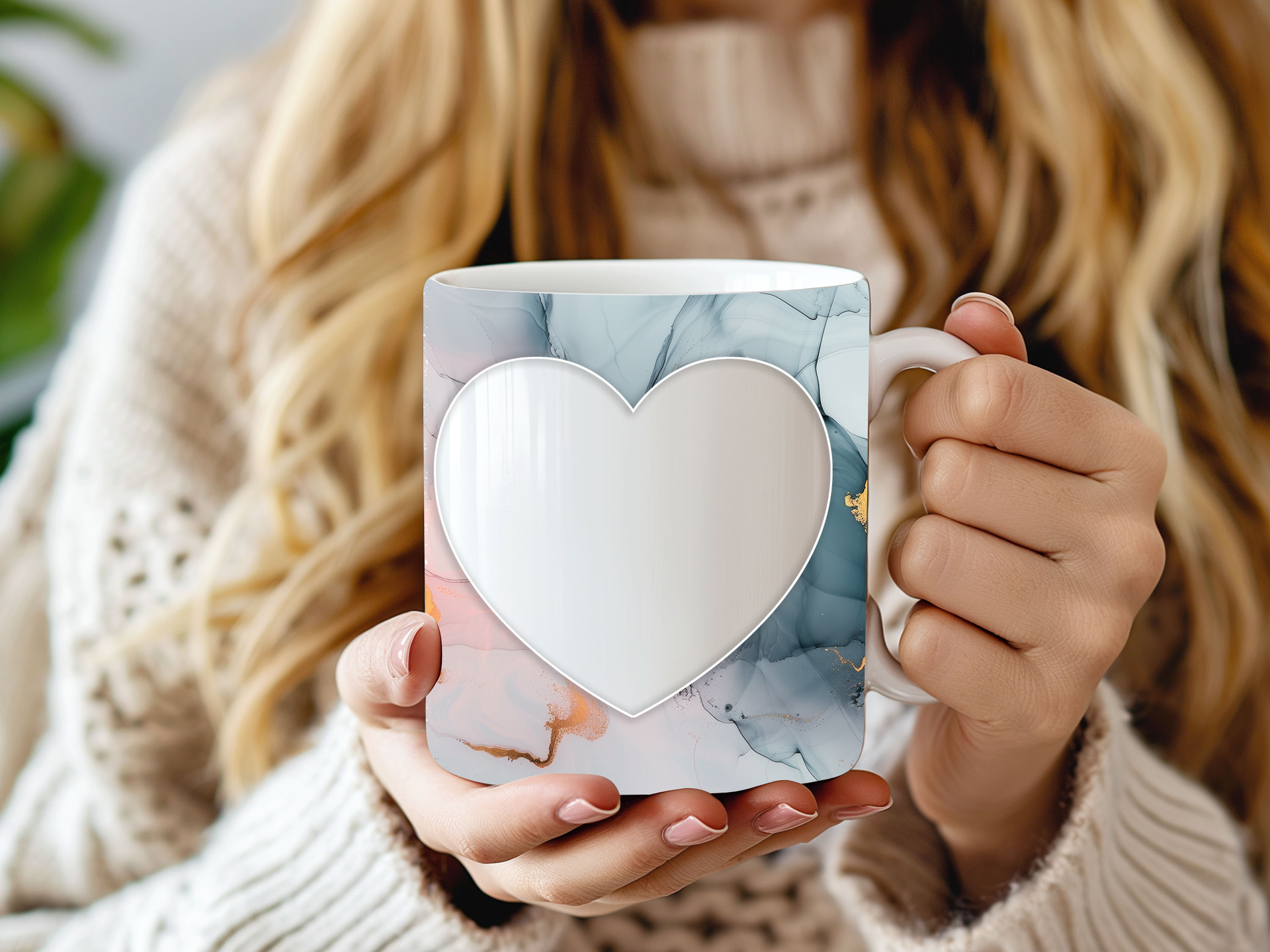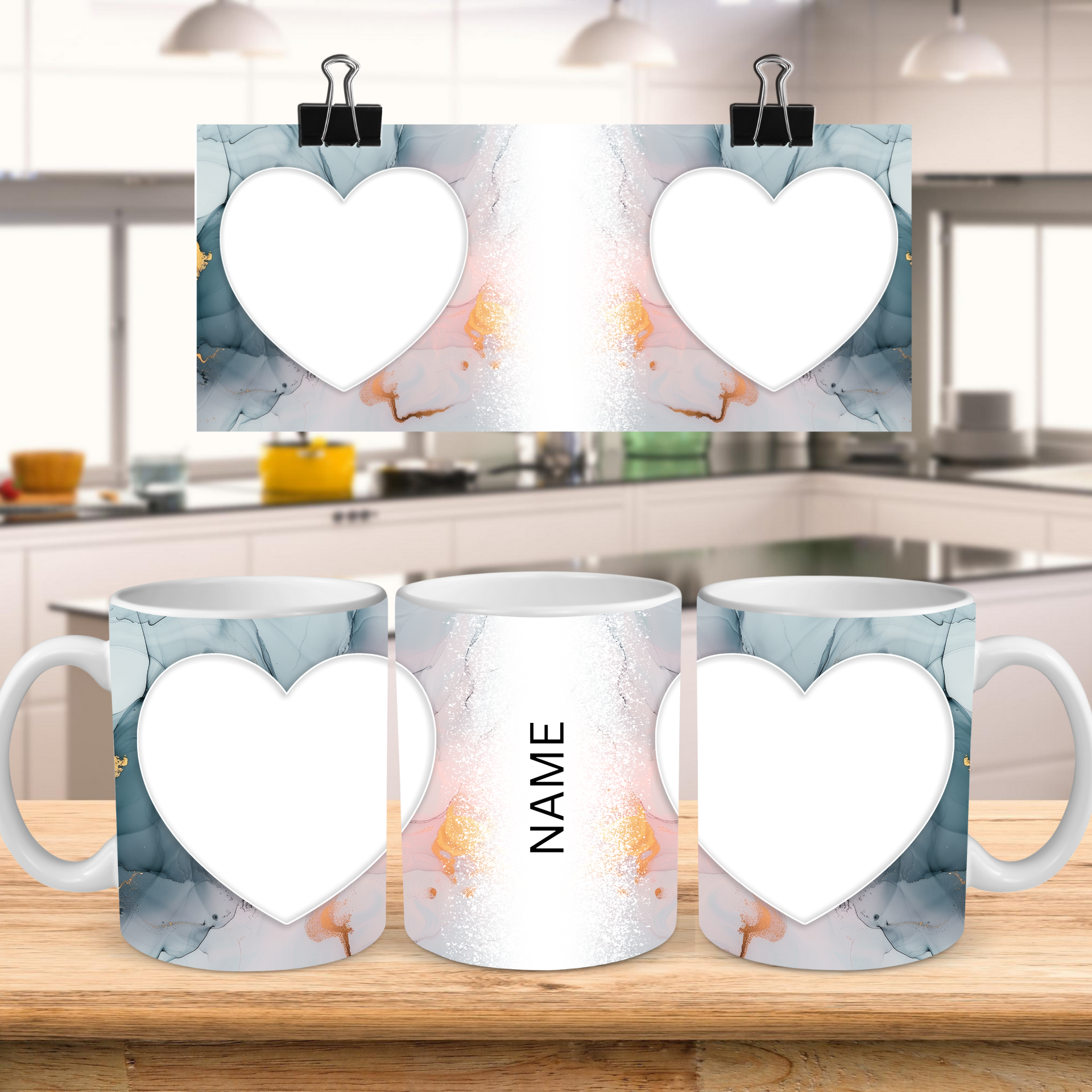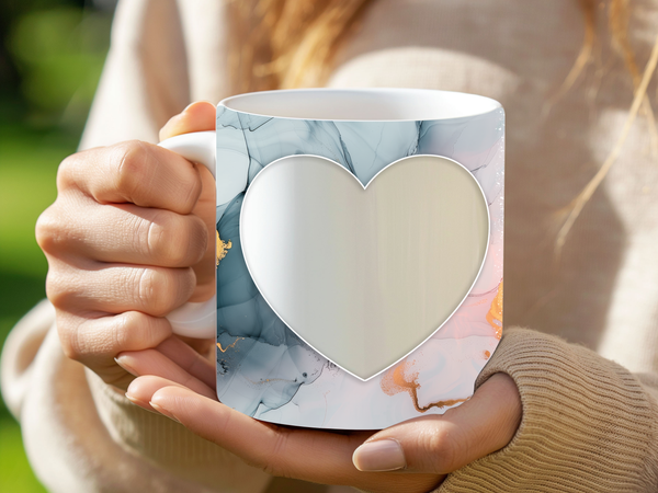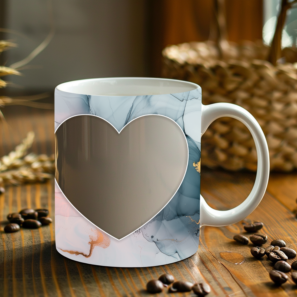 Showcase your cherished memories and a special name with our stunning customizable Photo & Name Coffee Mug! This elegant mug features a serene pastel marble design, beautifully blending soft blues, gentle pinks, and delicate gold accents, creating a calming and artistic backdrop for your personalization. It's thoughtfully designed to display two of your beloved photos within classic heart-shaped cutouts, symbolizing love and connection. The central design features a prominent vertical space for adding a custom name, making it truly unique and personal. Perfect for your daily coffee, tea, or any hot beverage, this mug transforms into a unique personal keepsake or a thoughtful gift for family and friends on any special occasion. It's available in both a convenient 11oz size and a more generous 15oz capacity to suit your preference. Simply add your desired photos and name to create a truly personalized and heartwarming mug that will be treasured for years to come!