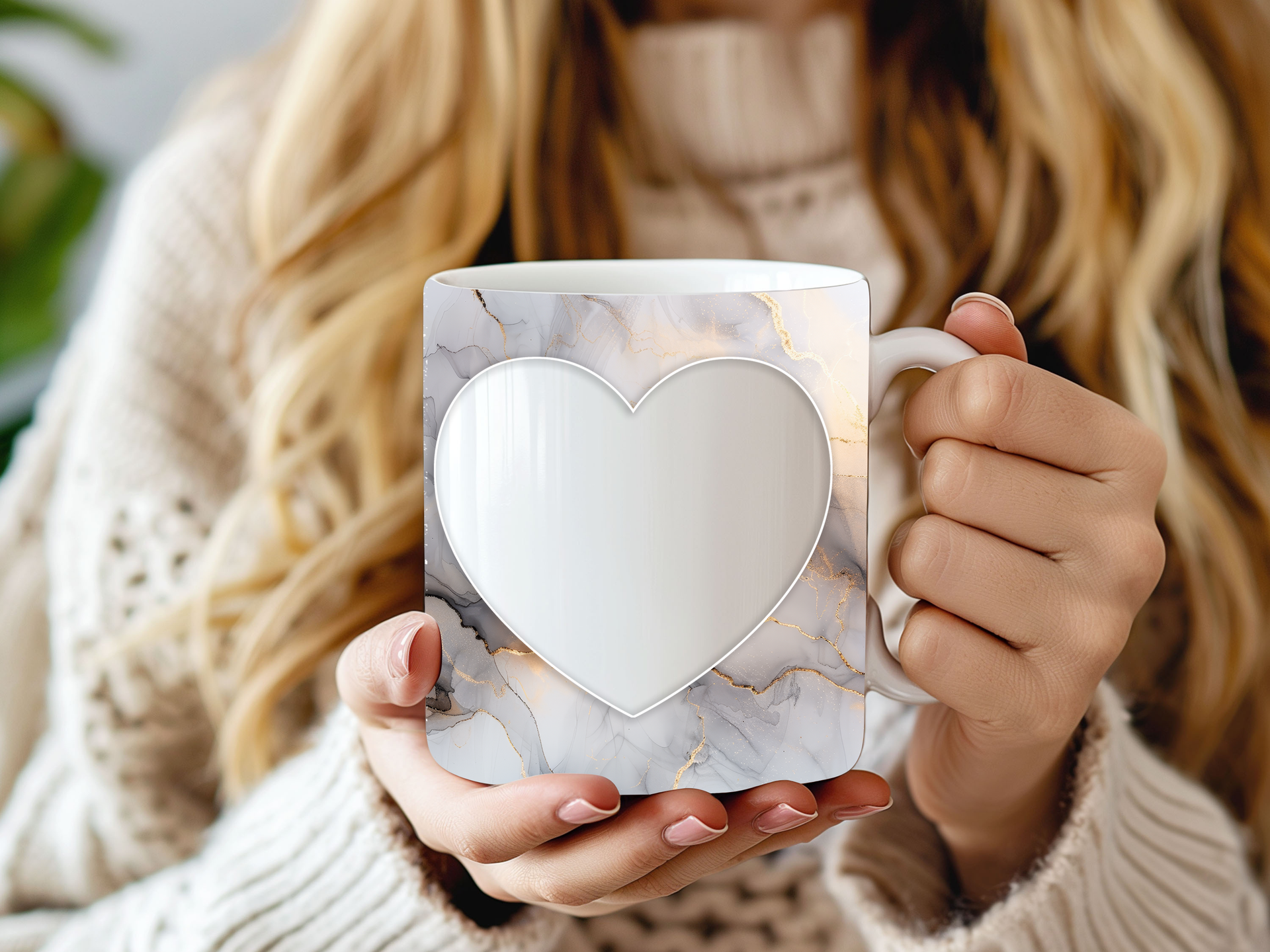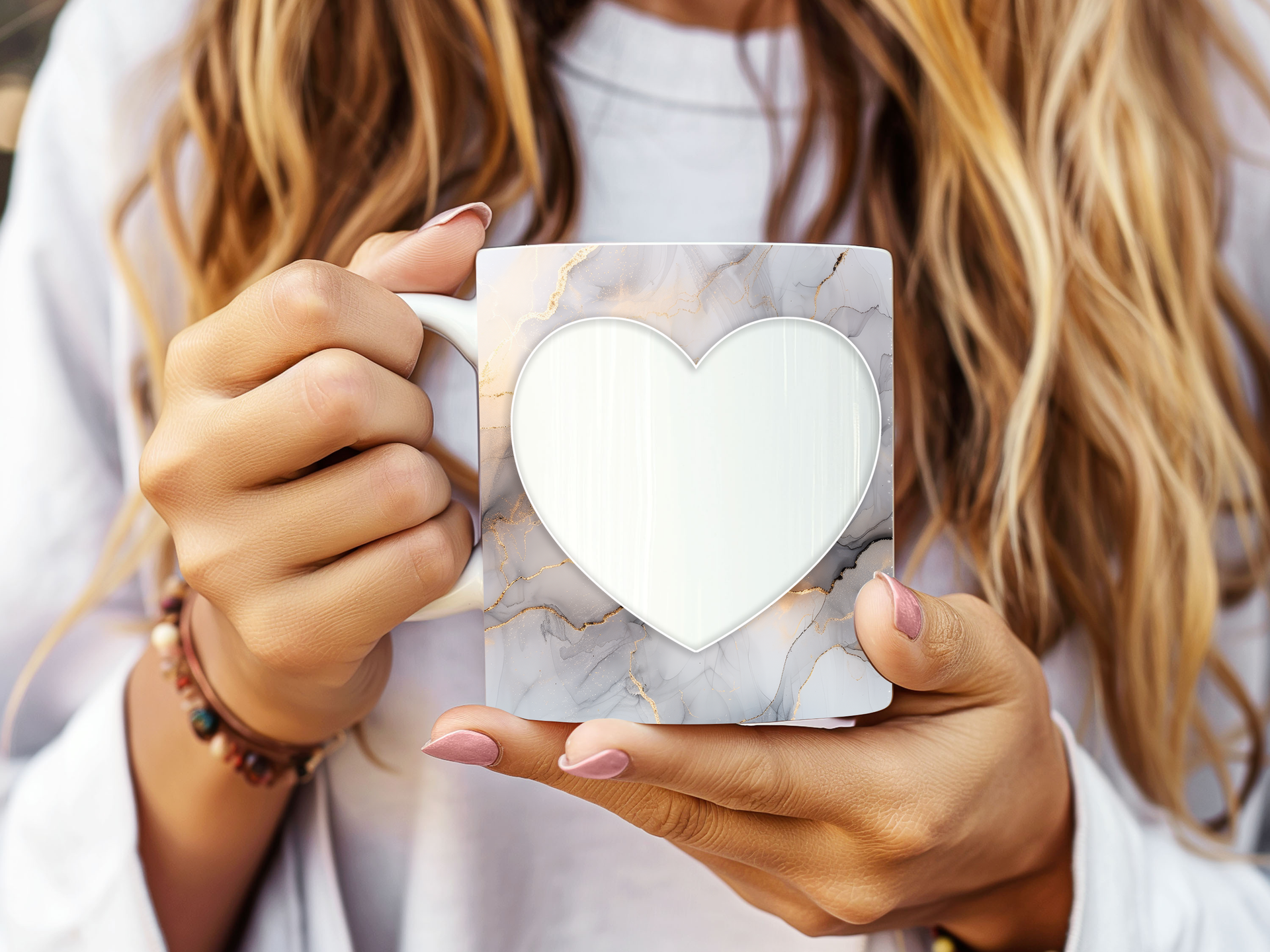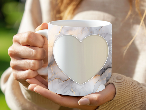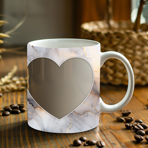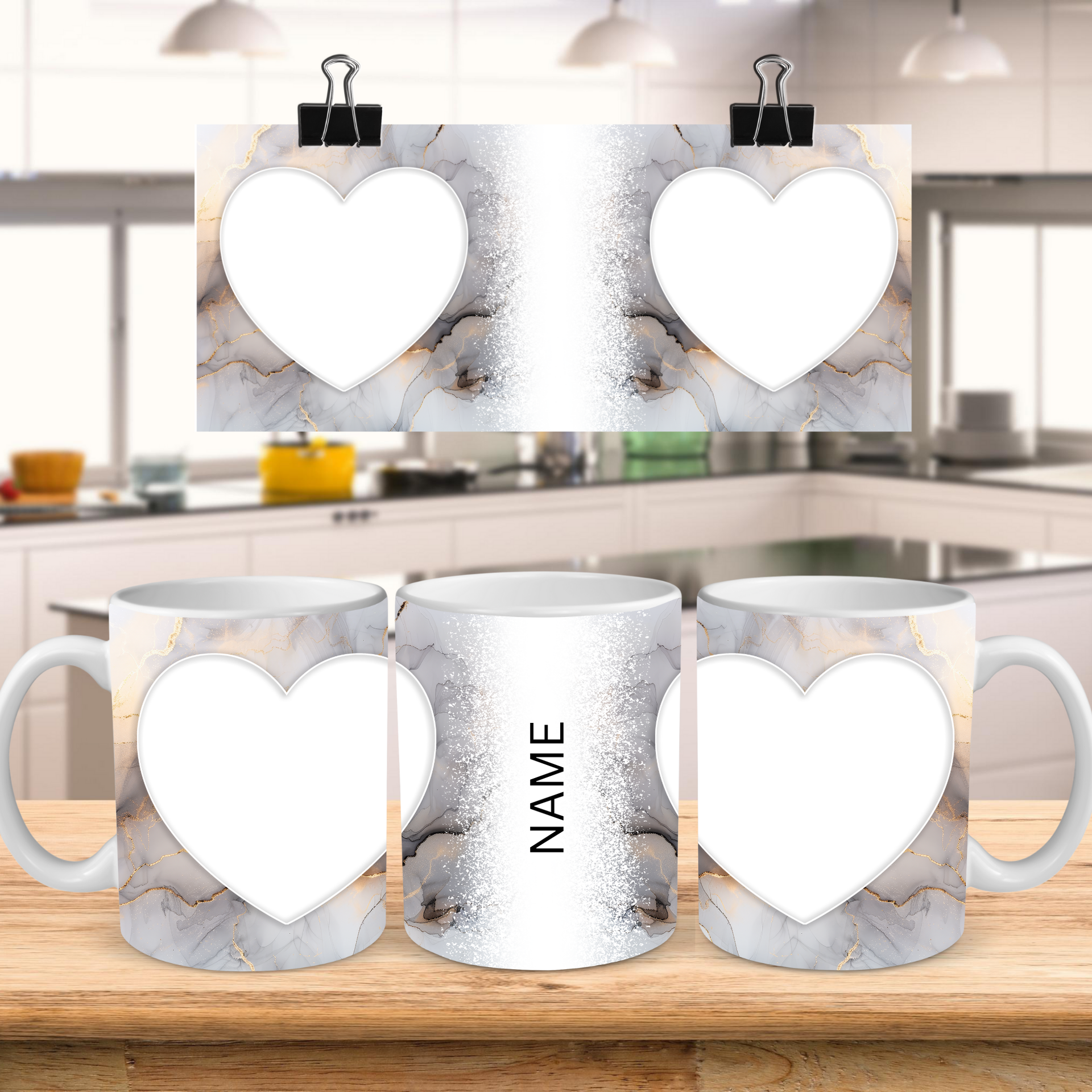 Showcase your cherished memories and a special name with our stunning customizable Photo & Name Coffee Mug! This elegant mug features a beautiful light grey marble design, gracefully accented with sophisticated darker tones and shimmering gold veins, creating a luxurious and artistic backdrop for your personalization. It's thoughtfully designed to display two of your beloved photos within classic heart-shaped cutouts, symbolizing love and connection. The central design features a prominent vertical space for adding a custom name, making it truly unique and personal. Perfect for your daily coffee, tea, or any hot beverage, this mug transforms into a unique personal keepsake or a thoughtful gift for family and friends on any special occasion. It's available in both a convenient 11oz size and a more generous 15oz capacity to suit your preference. Simply add your desired photos and name to create a truly personalized and heartwarming mug that will be treasured for years to come!