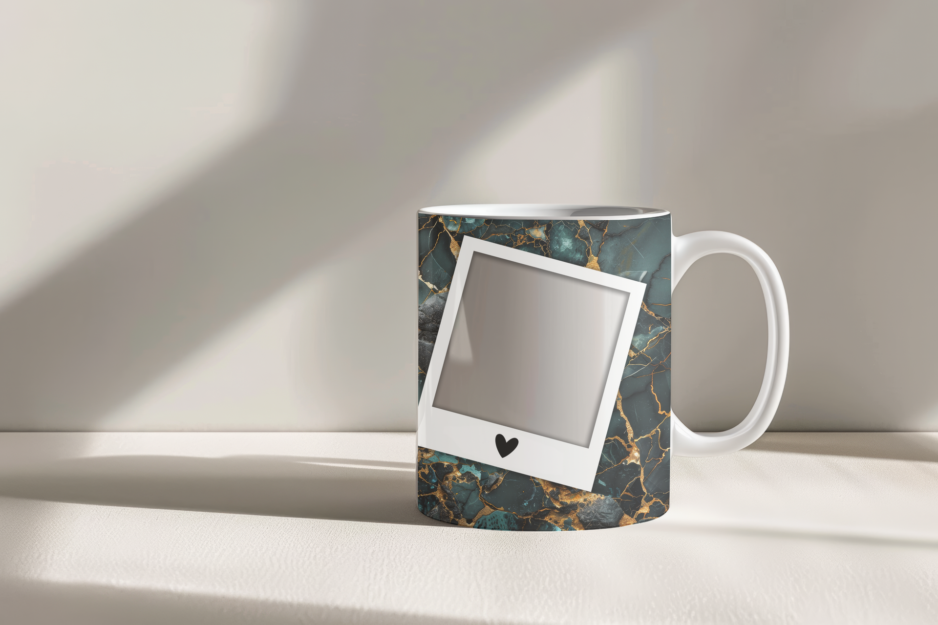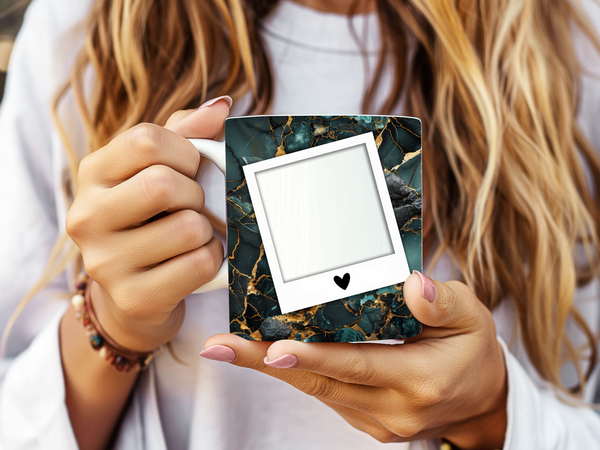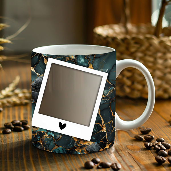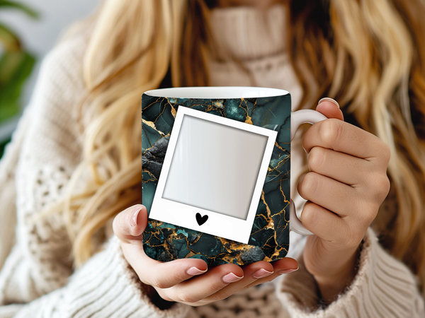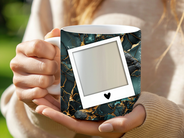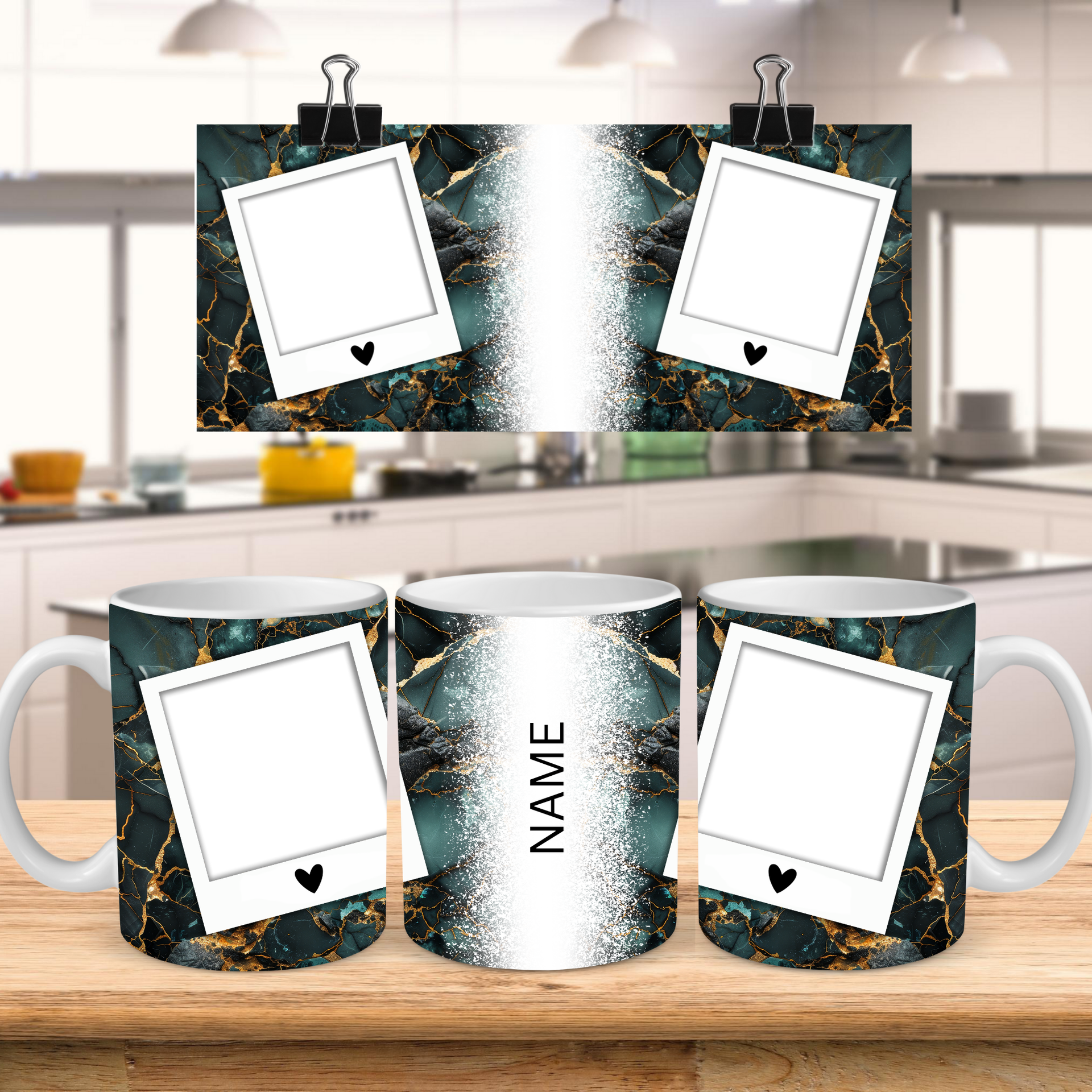 Showcase your cherished memories and a special name with our stunning customizable Photo & Name Coffee Mug! This elegant mug features a rich teal/green marble design, beautifully swirled with captivating gold accents, creating a luxurious and artistic backdrop for your personalization. It's thoughtfully designed to display two of your beloved photos within classic polaroid-style frames, each subtly adorned with a charming heart detail. The central design features a prominent vertical space for adding a custom name, making it truly unique and personal. Perfect for your daily coffee, tea, or any hot beverage, this mug transforms into a unique personal keepsake or a thoughtful gift for family and friends on any special occasion. It's available in both a convenient 11oz size and a more generous 15oz capacity to suit your preference. Simply add your desired photos and name to create a truly personalized and heartwarming mug that will be treasured for years to come!