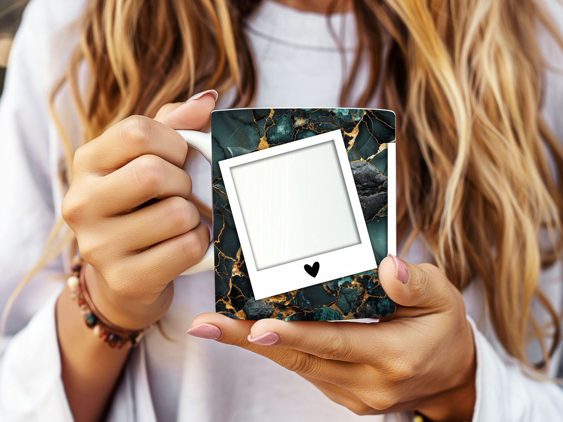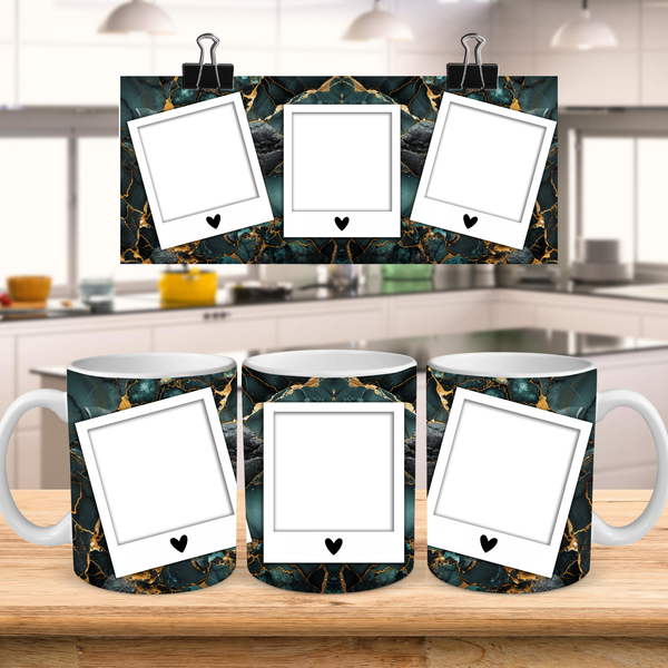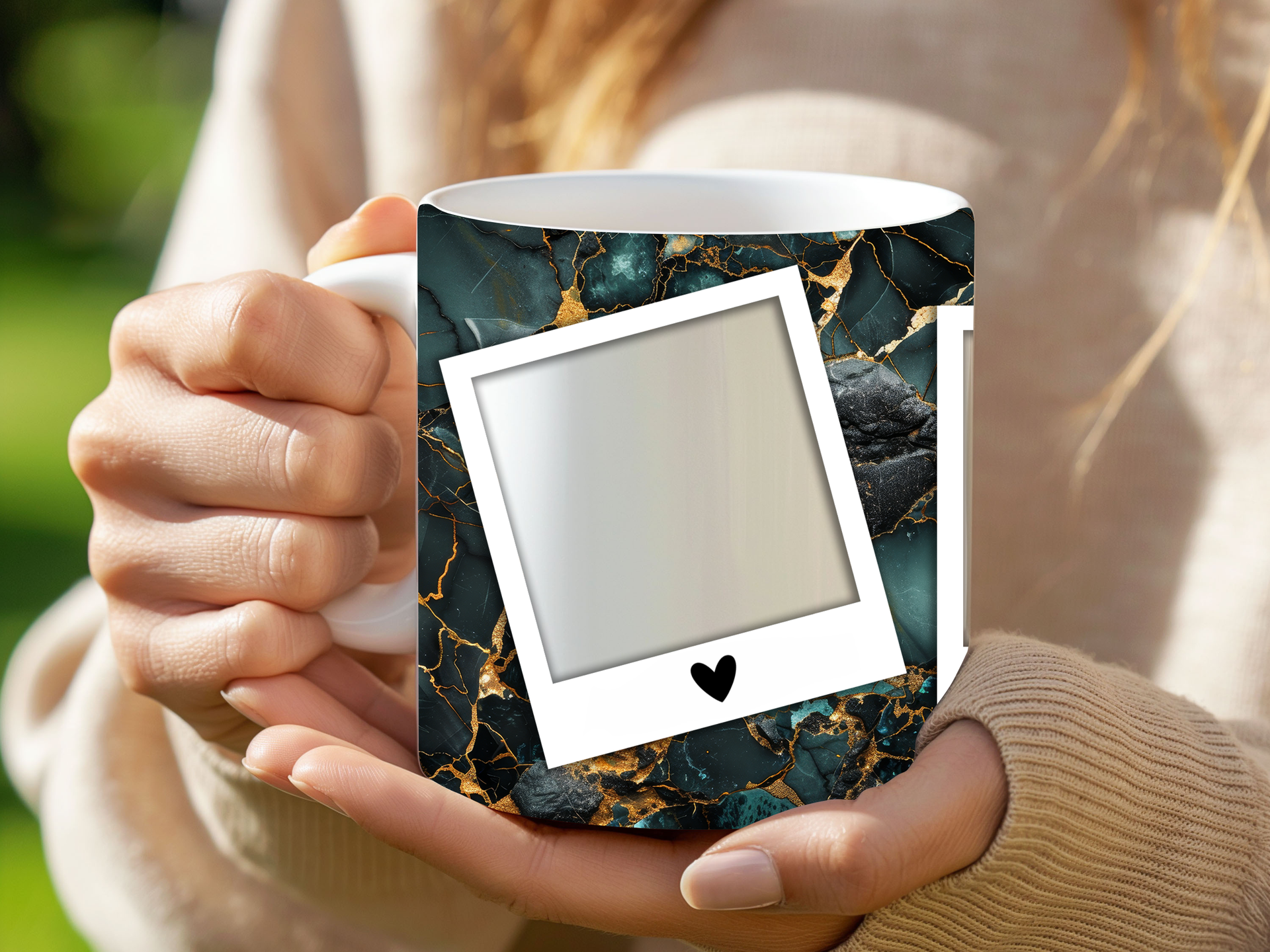 Cherish your favorite memories with our customizable Photo Frame Coffee Mug! This elegant mug features a sophisticated dark marble design with luxurious gold veining, providing a stunning backdrop for your cherished photos. Each mug allows you to display three of your beloved pictures within stylish polaroid-inspired frames, complete with a sweet heart detail. Perfect for daily coffee or tea, this mug transforms your drinkware into a personalized keepsake or a thoughtful gift for friends and family. Available in both 11oz and 15oz sizes to suit your preference. Just add your photos to create a truly unique and heartwarming mug!