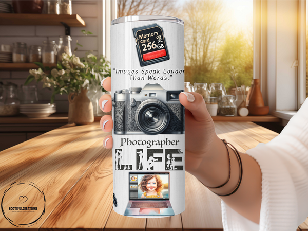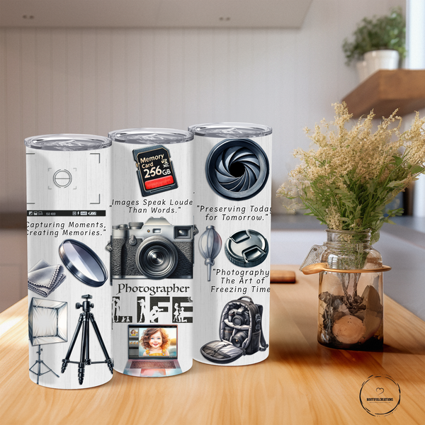 Stay refreshed and energized on-the-go with our Photographer Life Tumbler! This tumbler keeps your drinks hot for up to 6 hours and cold for up to 24 hours, perfect for long photoshoots. Personalize your tumbler with your name for that extra special touch. Fuel your passion for photography wherever you go!