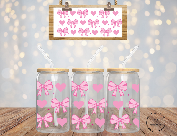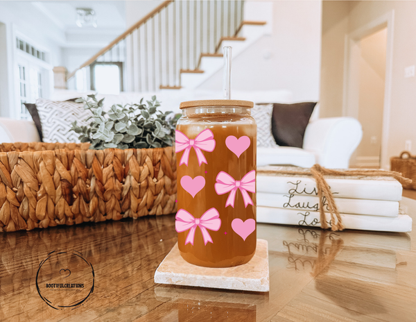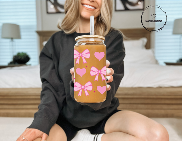 Express your love with our Pink Bows and Hearts Glass Cup! This 16oz cup is adorned with cute pink bows and hearts, available in clear or frosted. Perfect for any beverage and adds a touch of sweetness to your day. Drink in style and spread joy with every sip!