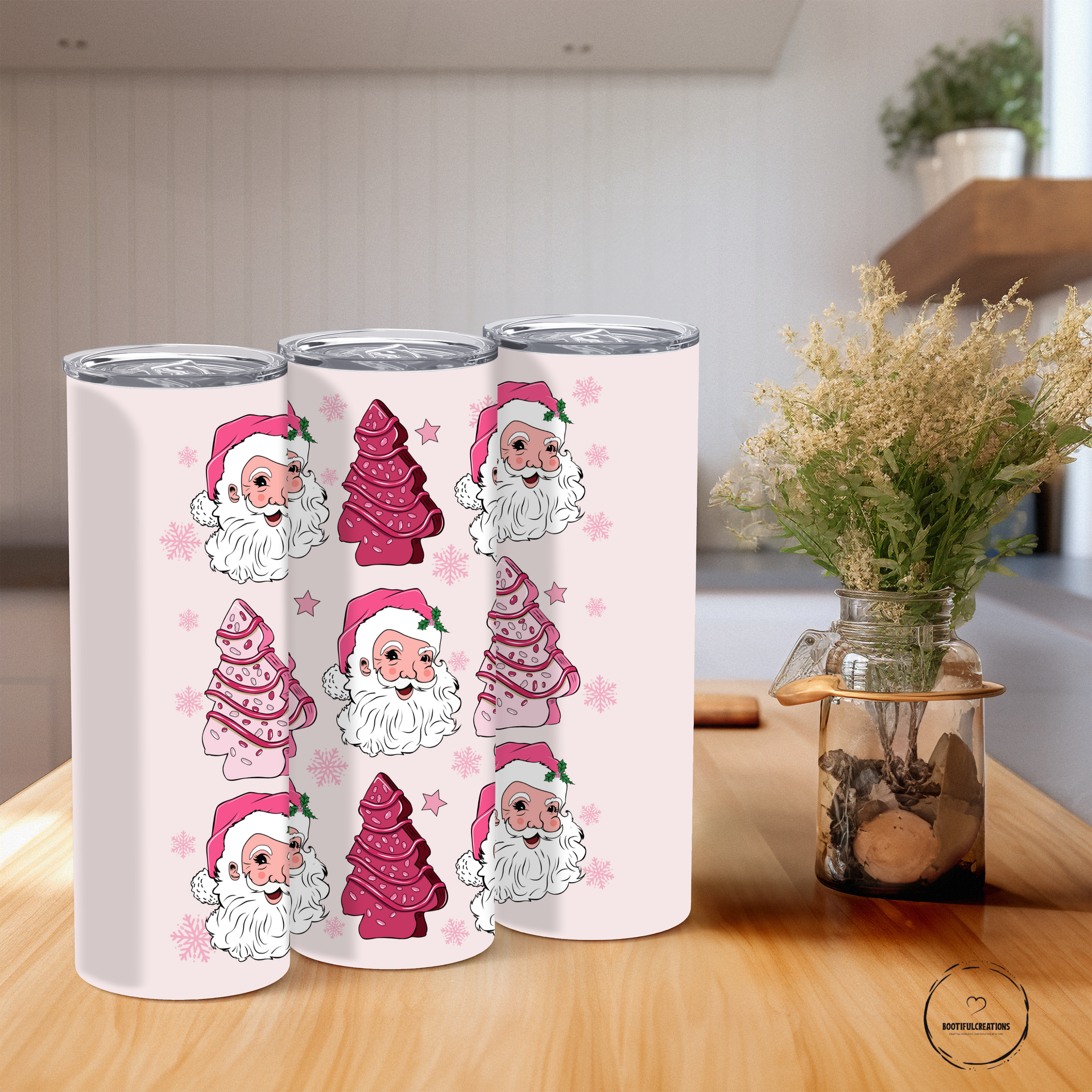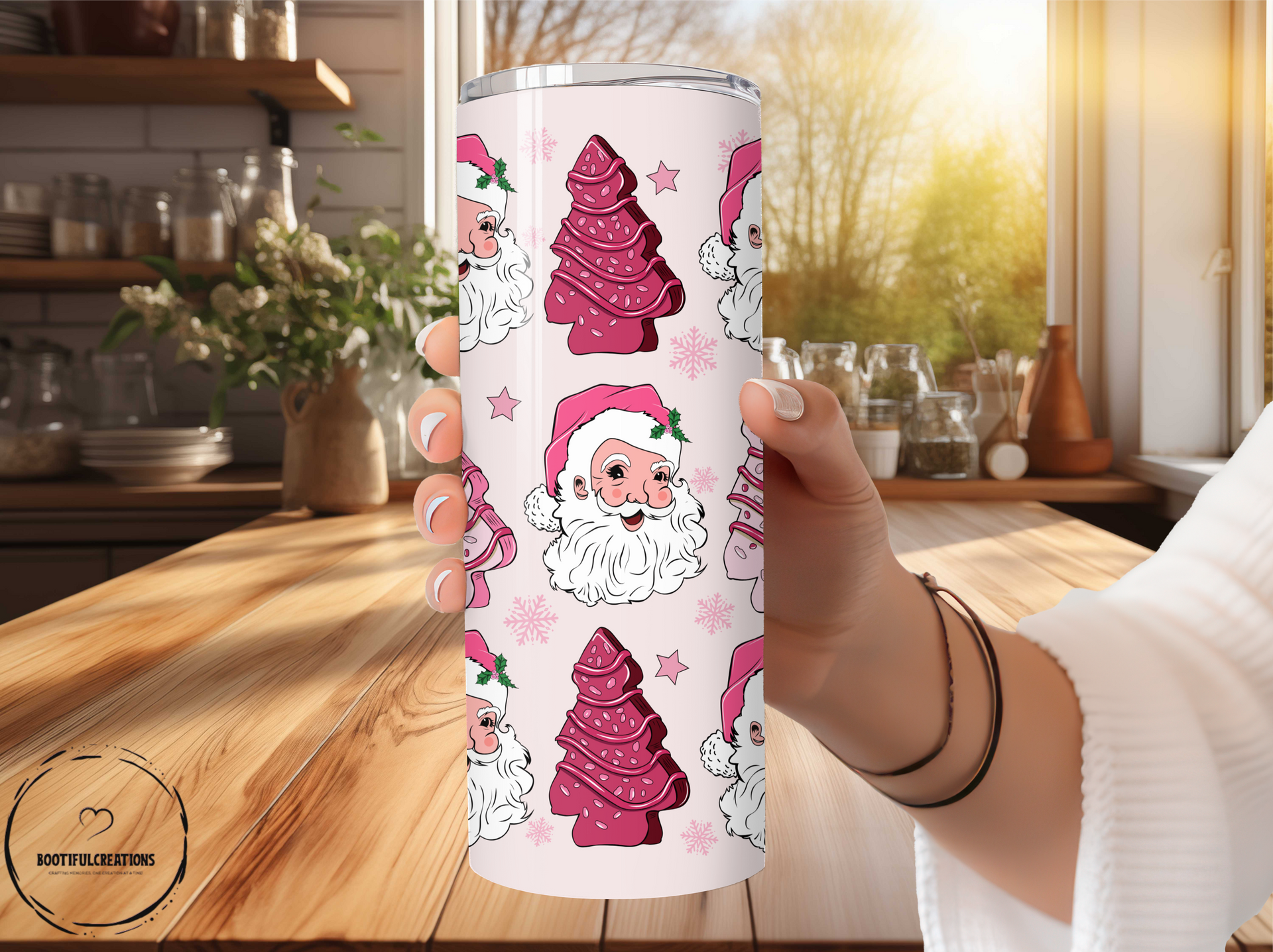 The Pink Santa & Cake Tumbler - perfect for those who want to stay refreshed and stylish! With its festive pattern and ability to keep drinks hot for up to 6 hours and cold for up to 24 hours, this tumbler is a must-have for on-the-go. Personalize it with a name for a truly unique touch!