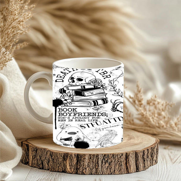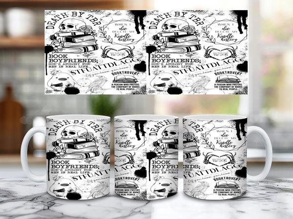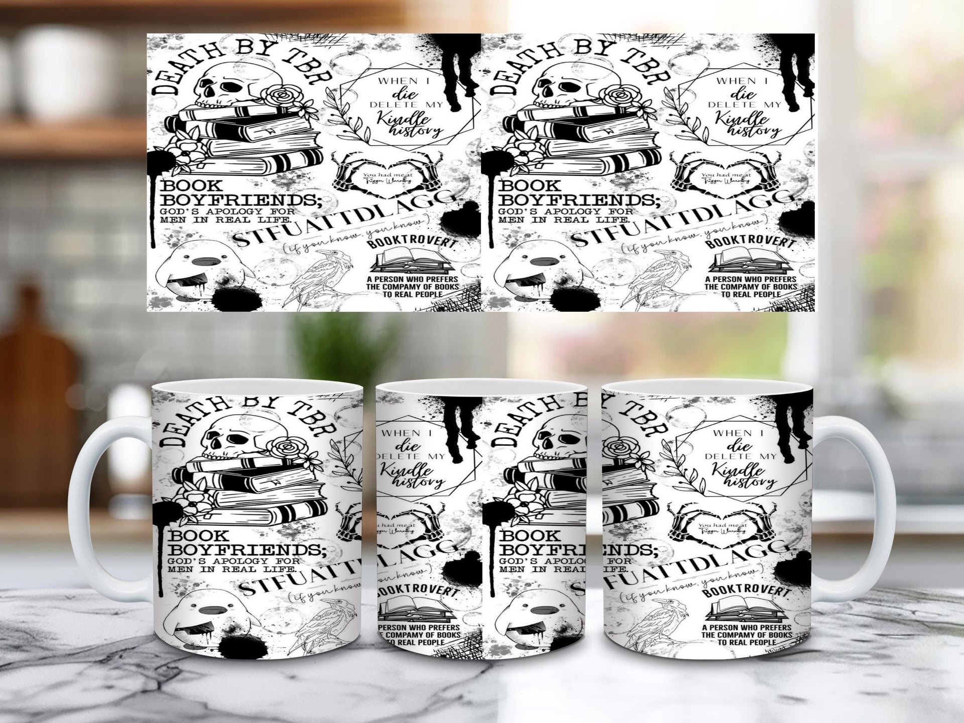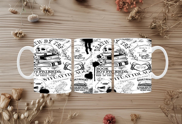 Design: Full-wrap, high-quality print featuring a collage of funny, relatable book-themed graphics and text in a classic black and white.
