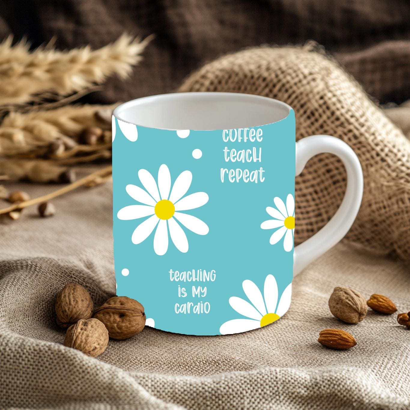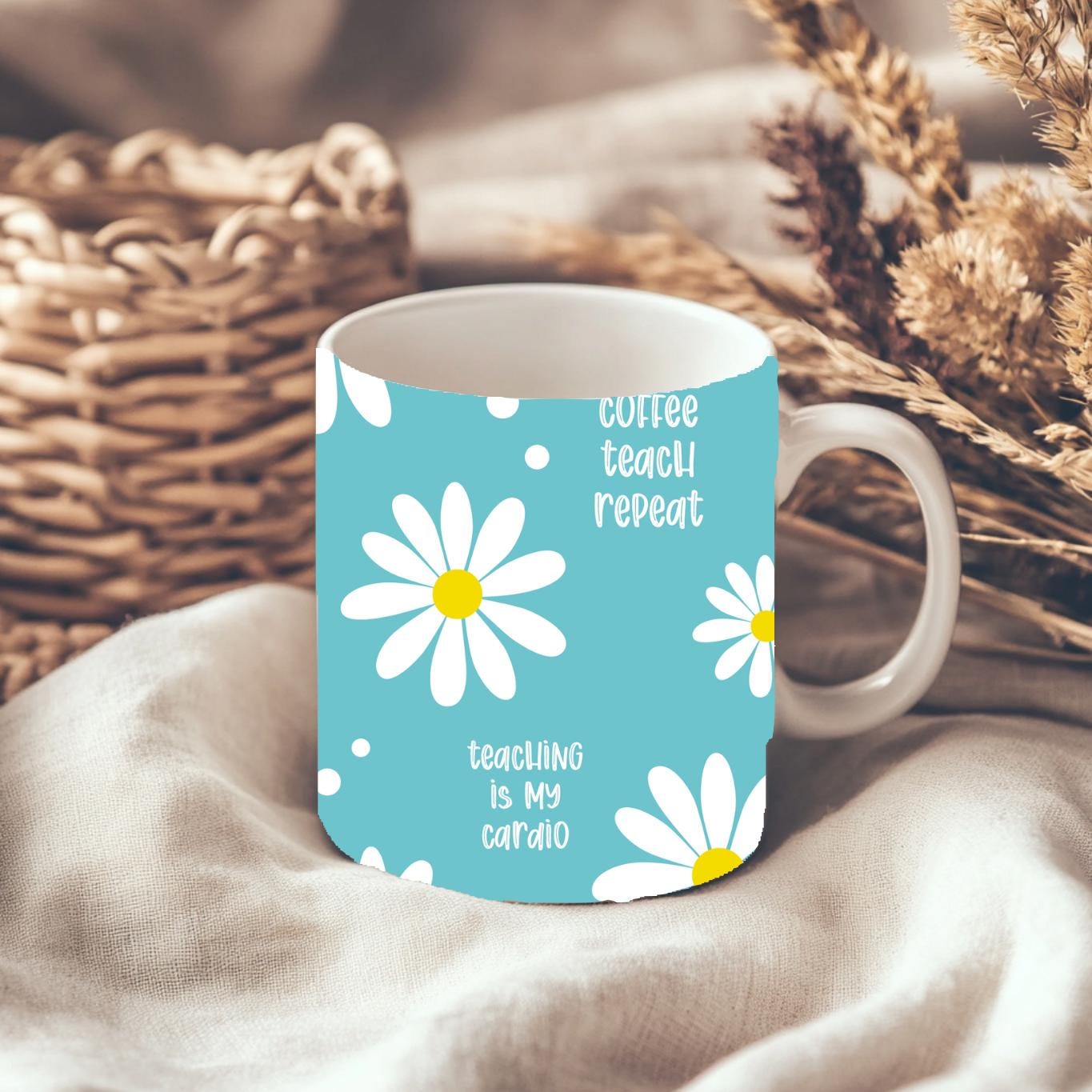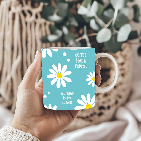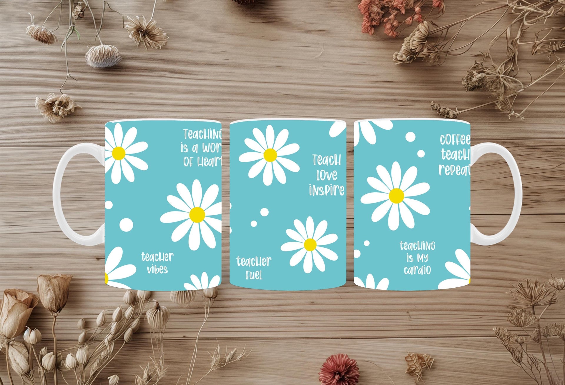 Show your appreciation for the amazing educators in your life with our charming "Coffee Teach Repeat" Daisy Teacher Mug! This delightful mug features a vibrant light blue background adorned with cheerful white daisies, creating a bright and uplifting design. Sprinkled among the flowers are heartwarming and humorous phrases perfect for any teacher: "Teaching is a Work of Heart," "Teach Love Inspire," "Teacher Vibes," "Teacher Fuel," "Coffee Teach Repeat," and "Teaching is My Cardio." Available in both a convenient 11oz and a more generous 15oz size to fit every preference.