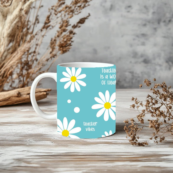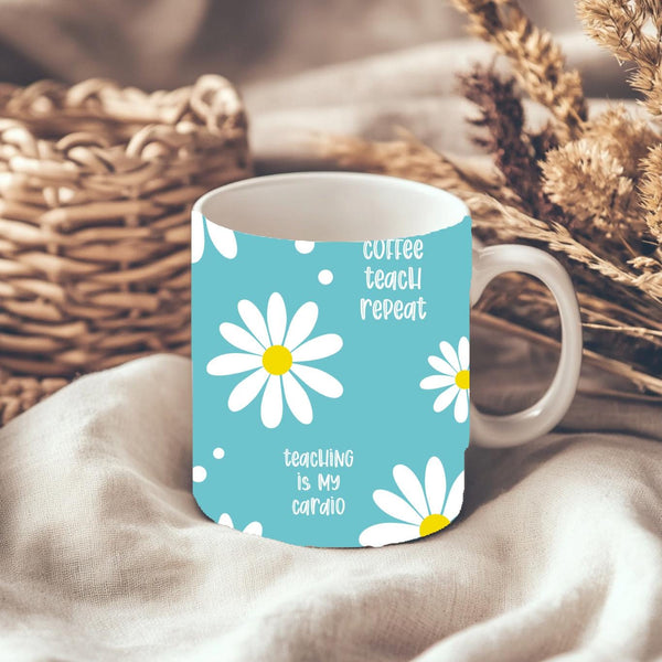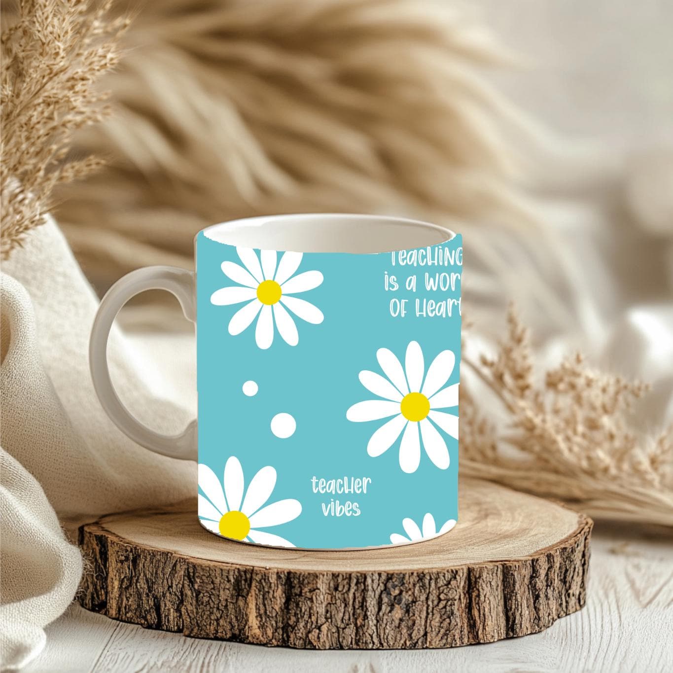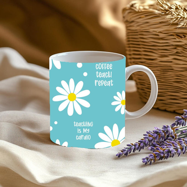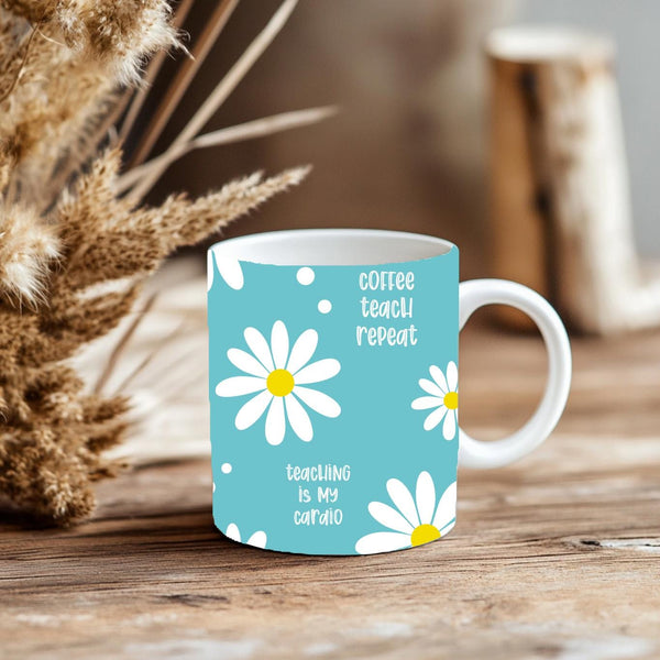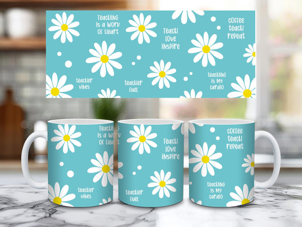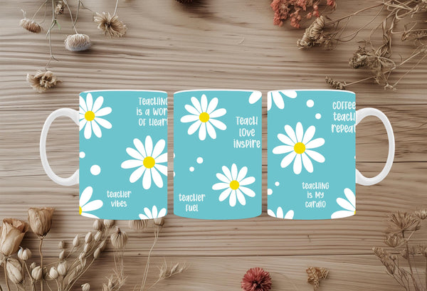 Show your appreciation for the amazing educators in your life with our charming "Coffee Teach Repeat" Daisy Teacher Mug! This delightful mug features a vibrant light blue background adorned with cheerful white daisies, creating a bright and uplifting design. Sprinkled among the flowers are heartwarming and humorous phrases perfect for any teacher: "Teaching is a Work of Heart," "Teach Love Inspire," "Teacher Vibes," "Teacher Fuel," "Coffee Teach Repeat," and "Teaching is My Cardio." Available in both a convenient 11oz and a more generous 15oz size to fit every preference.