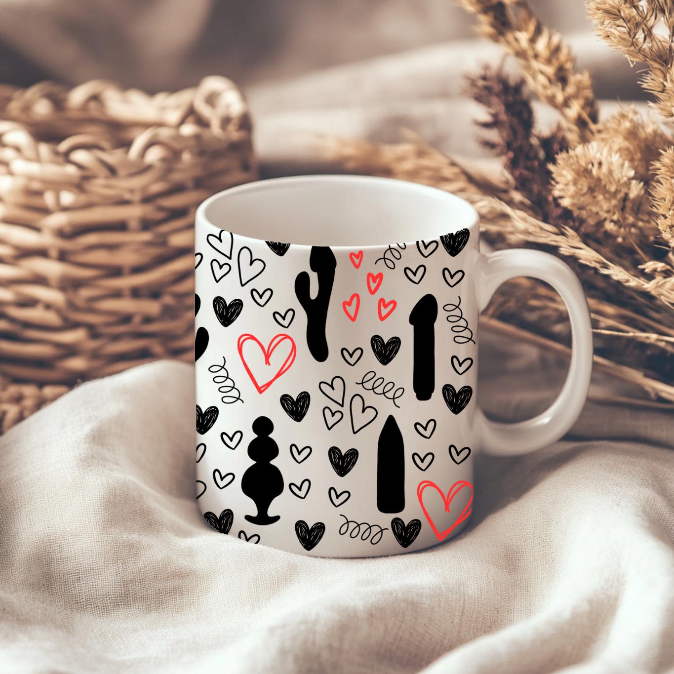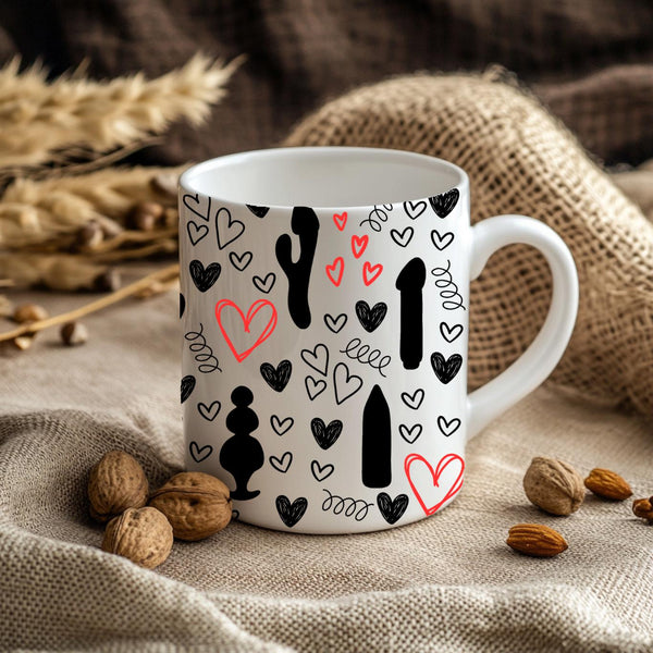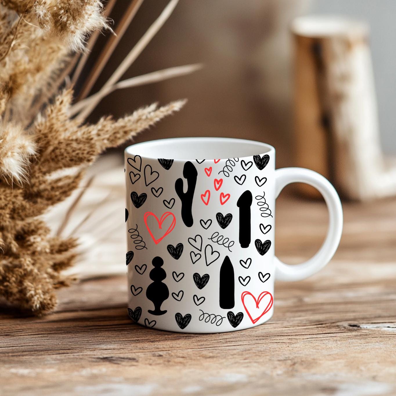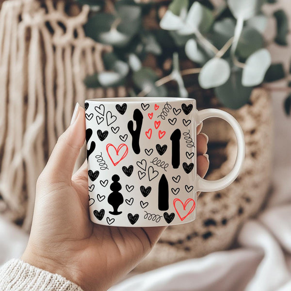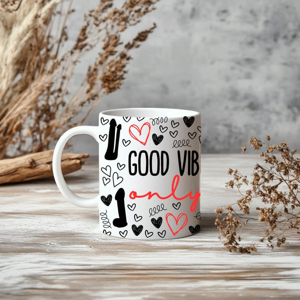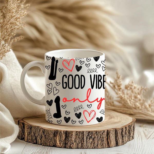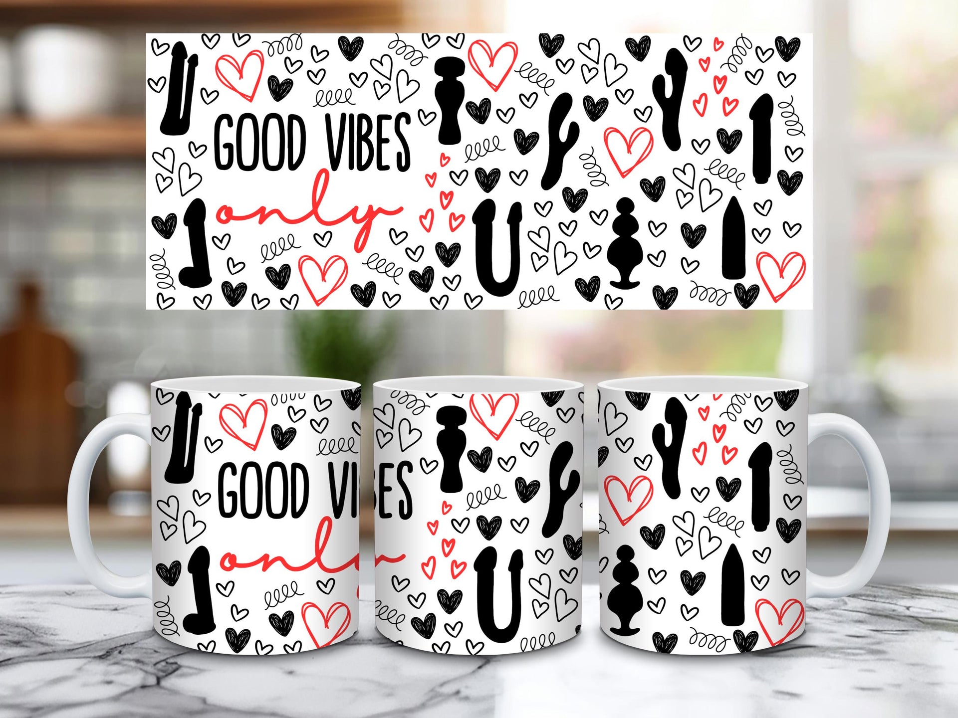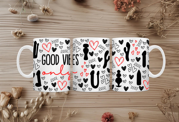 Bring some playful energy (and maybe a few laughs) to your morning routine with this hilarious and cheeky coffee mug! Featuring the encouraging message "GOOD VIBES only" surrounded by a playful, whimsical doodle pattern of hearts and adult novelty shapes, this mug is a fun statement piece.