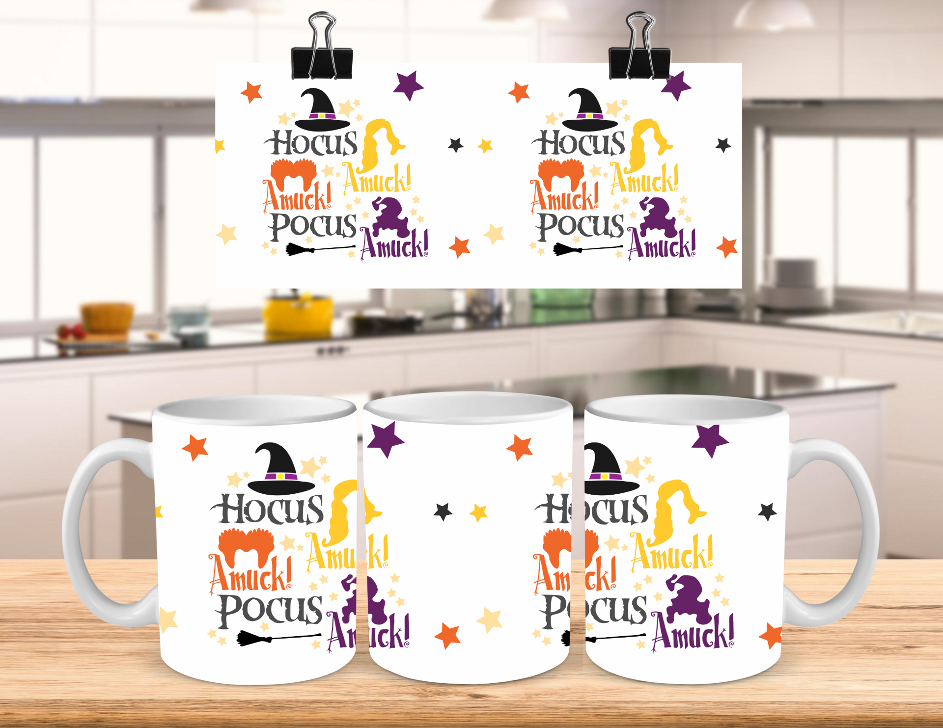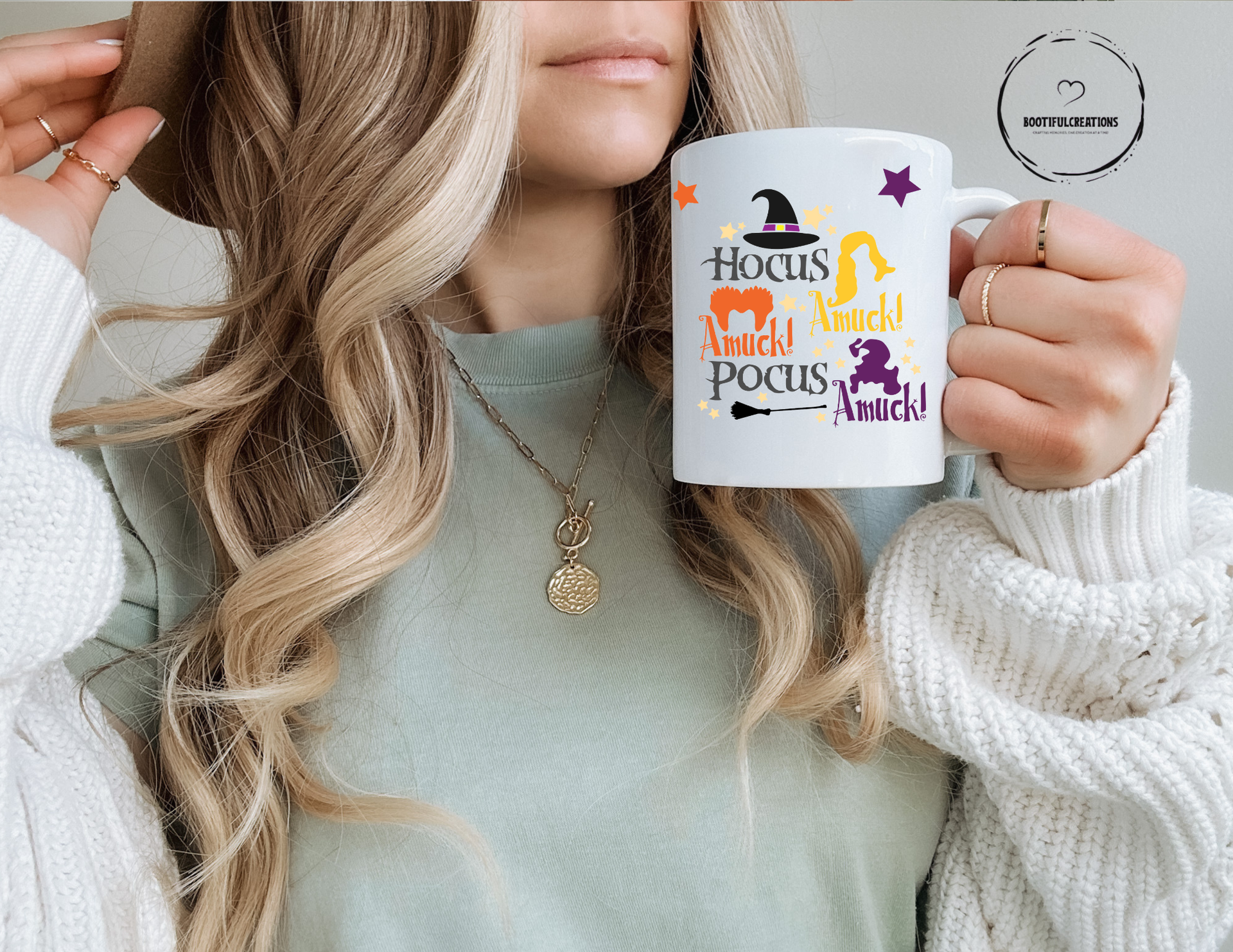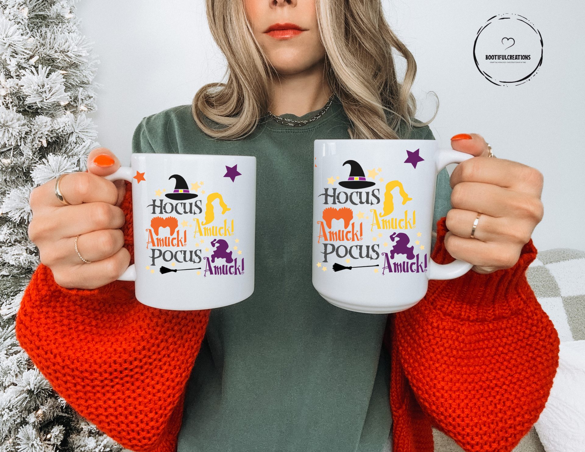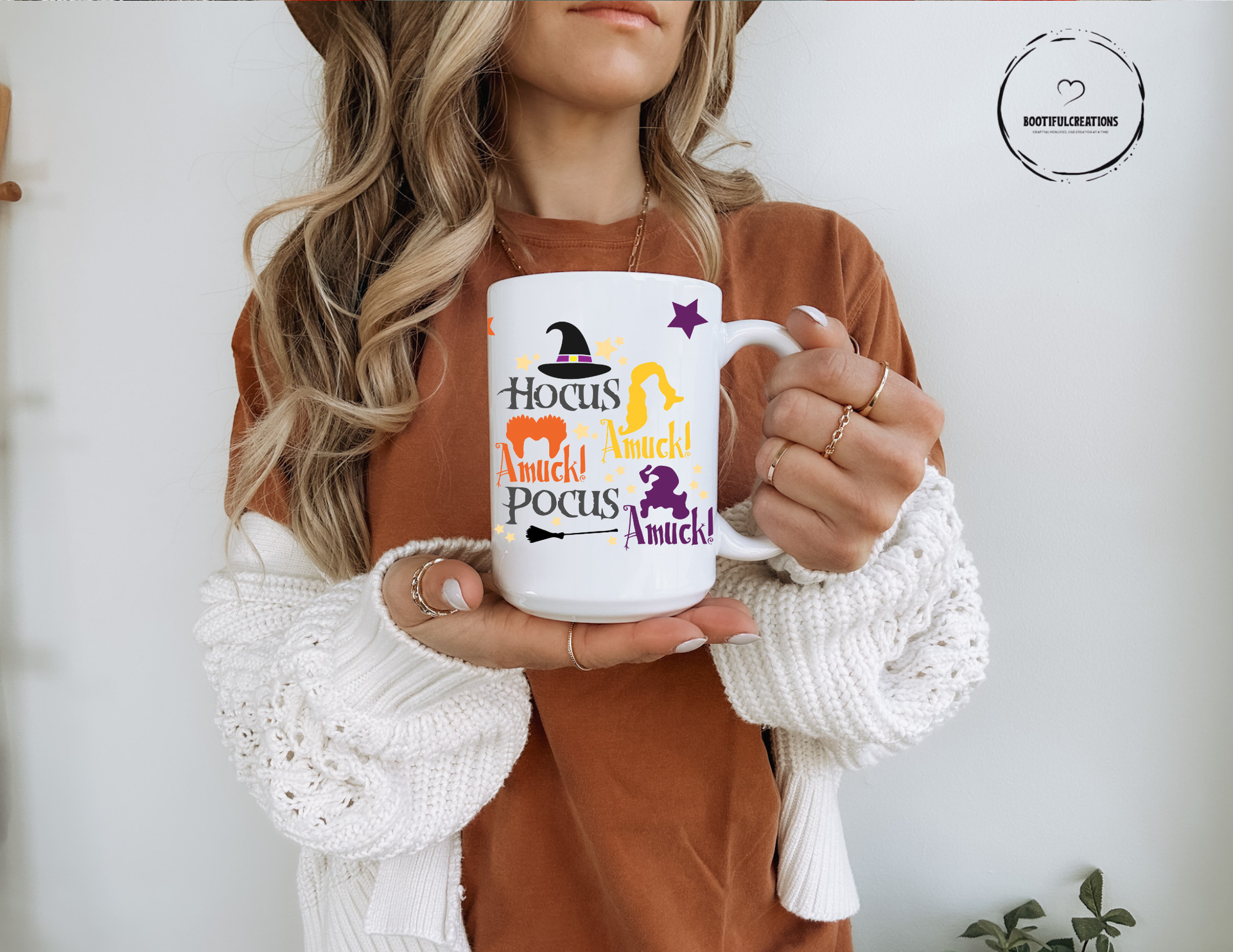Get bewitched by your morning brew with our Hocus Pocus coffee mug. Made of durable ceramic and available in 11oz or 15oz sizes, this mug features the iconic quote "Amuck! Amuck! Amuck!" to add some magic to your day. Perfect for any fan of the classic film, this mug is sure to delight and enchant.