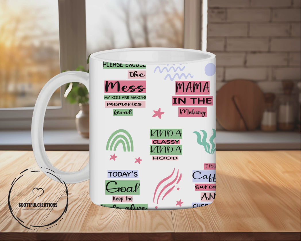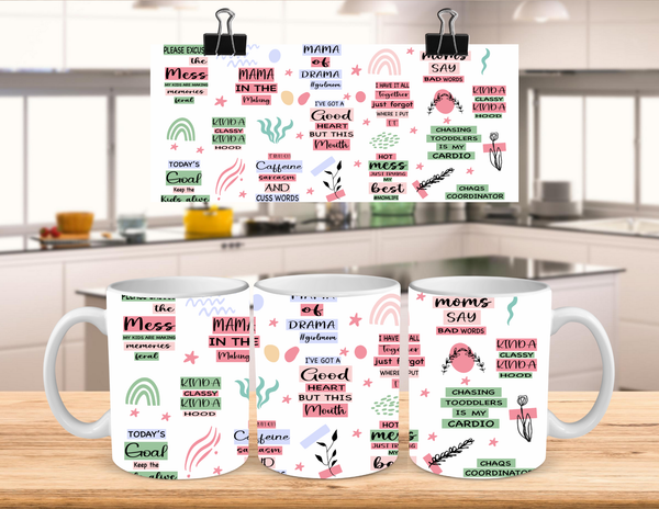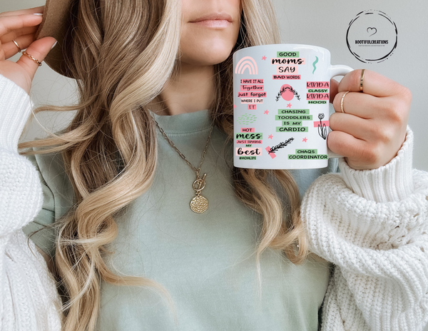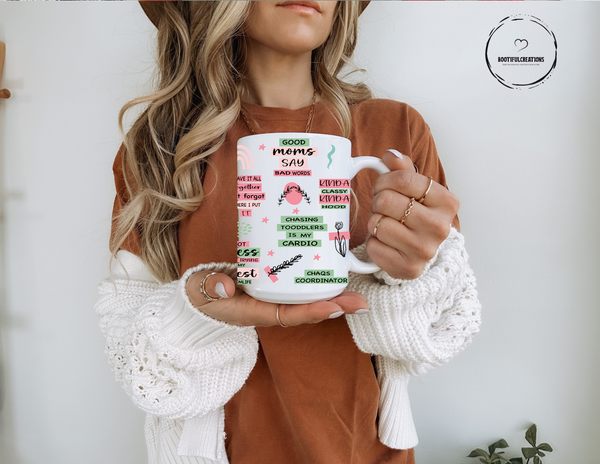 Keep up with the chaos of motherhood with our ceramic coffee mug! Featuring fun and relatable phrases like 'chasing toddlers is my cardio' and 'moms say bad words', this mug is a must-have for any mama in the making. Available in 11oz or 15oz, it's the perfect way to fuel your days of making memories and keeping the kids alive!