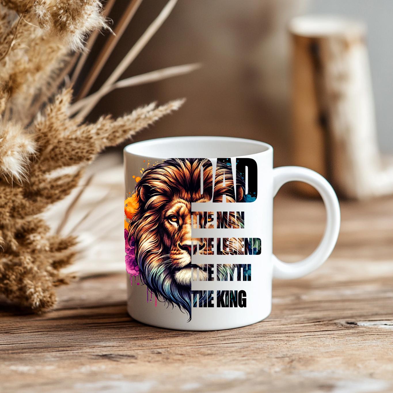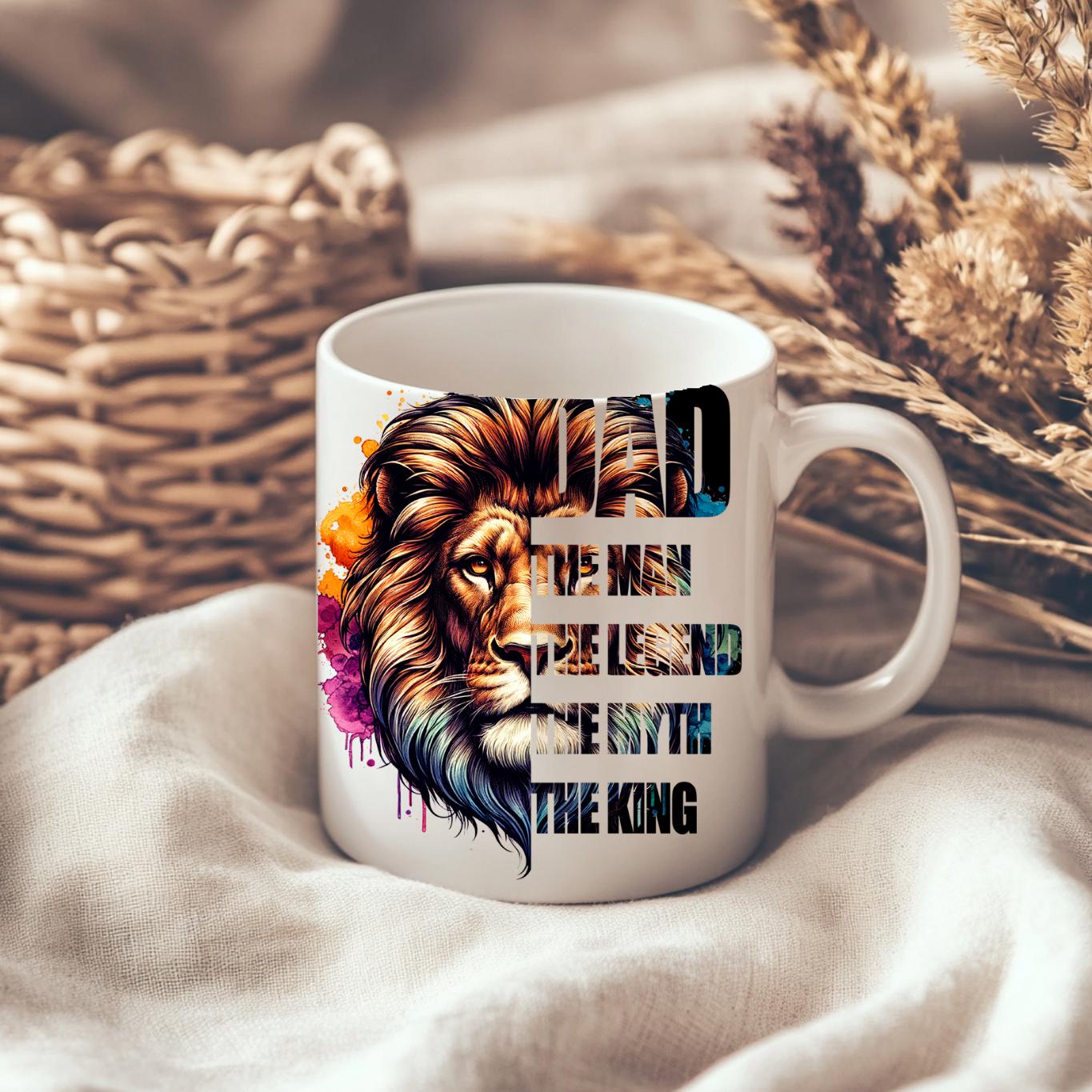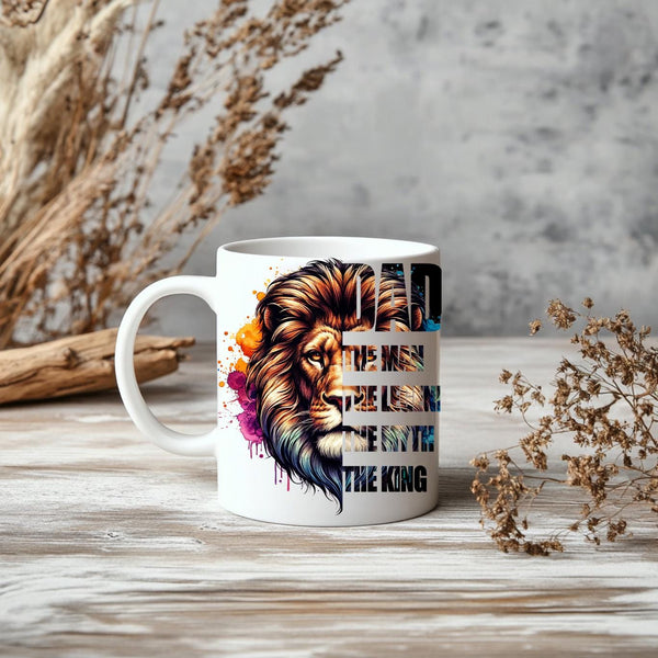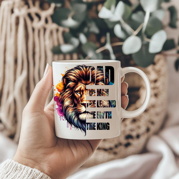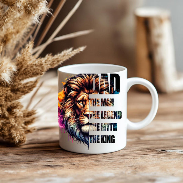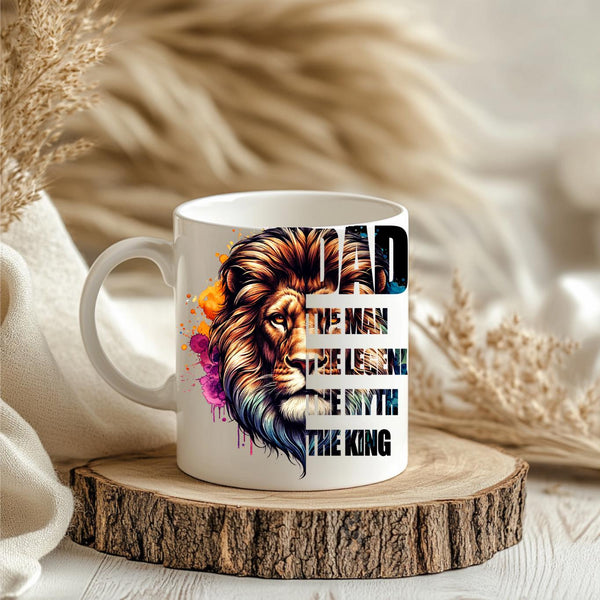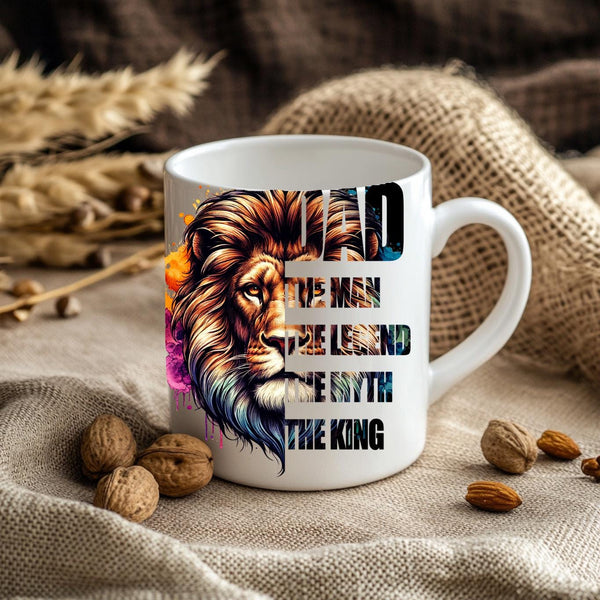 Honor the king of your family with this majestic "DAD: The Man, The Legend, The Myth, The King" Coffee Mug! This striking mug features a powerful lion's head with a vibrant, watercolor-style mane in a spectrum of blues, purples, oranges, and golds, symbolizing strength, wisdom, and royalty. Below the regal lion, the bold text proudly proclaims "DAD THE MAN THE LEGEND THE MYTH THE KING," making it the ultimate tribute to your father. Perfect for his morning coffee, tea, or any favorite beverage, this mug is an ideal gift for Father's Day, birthdays, holidays, or just to show your appreciation for all that he is. It's available in both a convenient 11oz size and a more generous 15oz capacity to suit his preference. Give him a gift that reminds him every day of his legendary status!