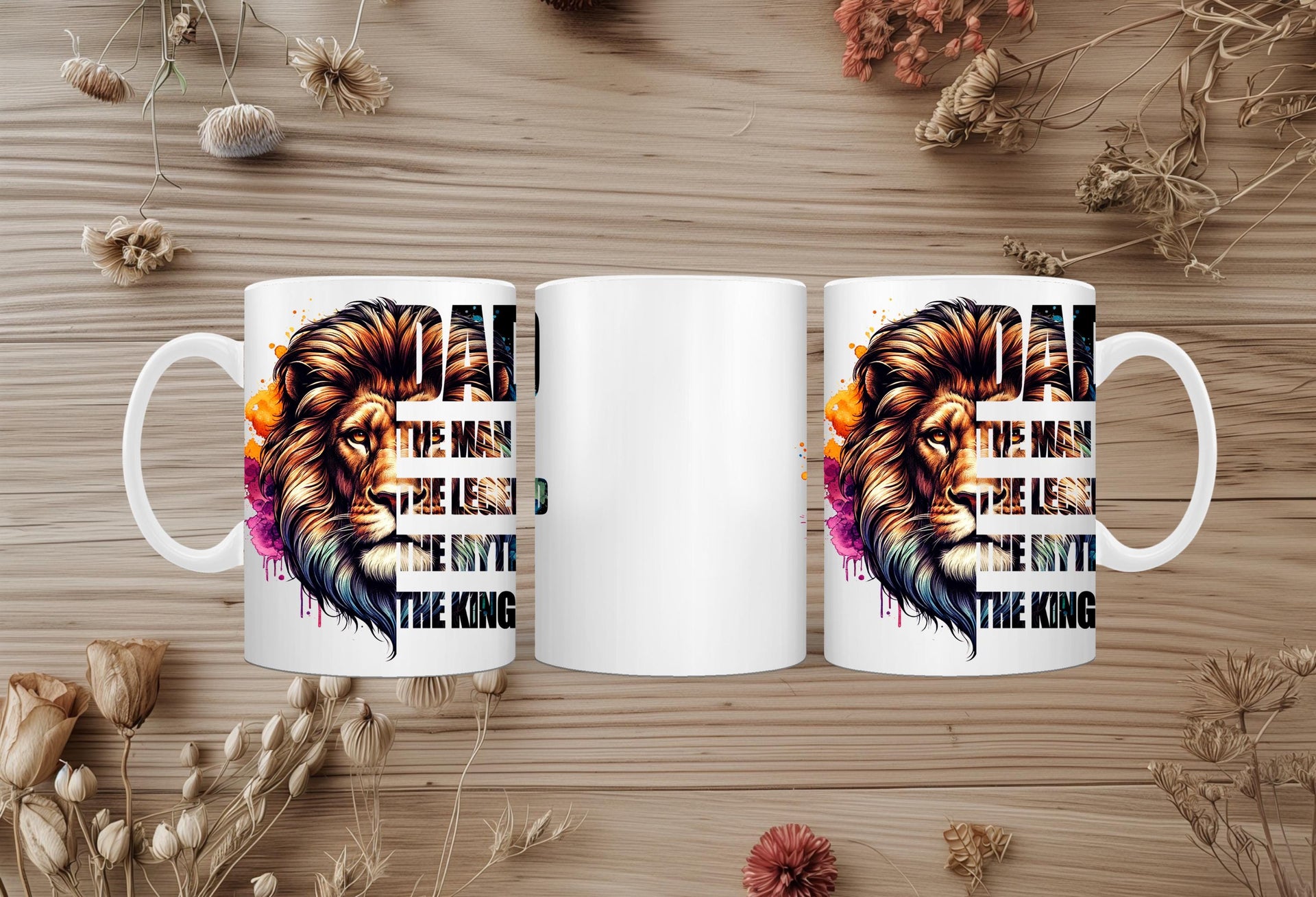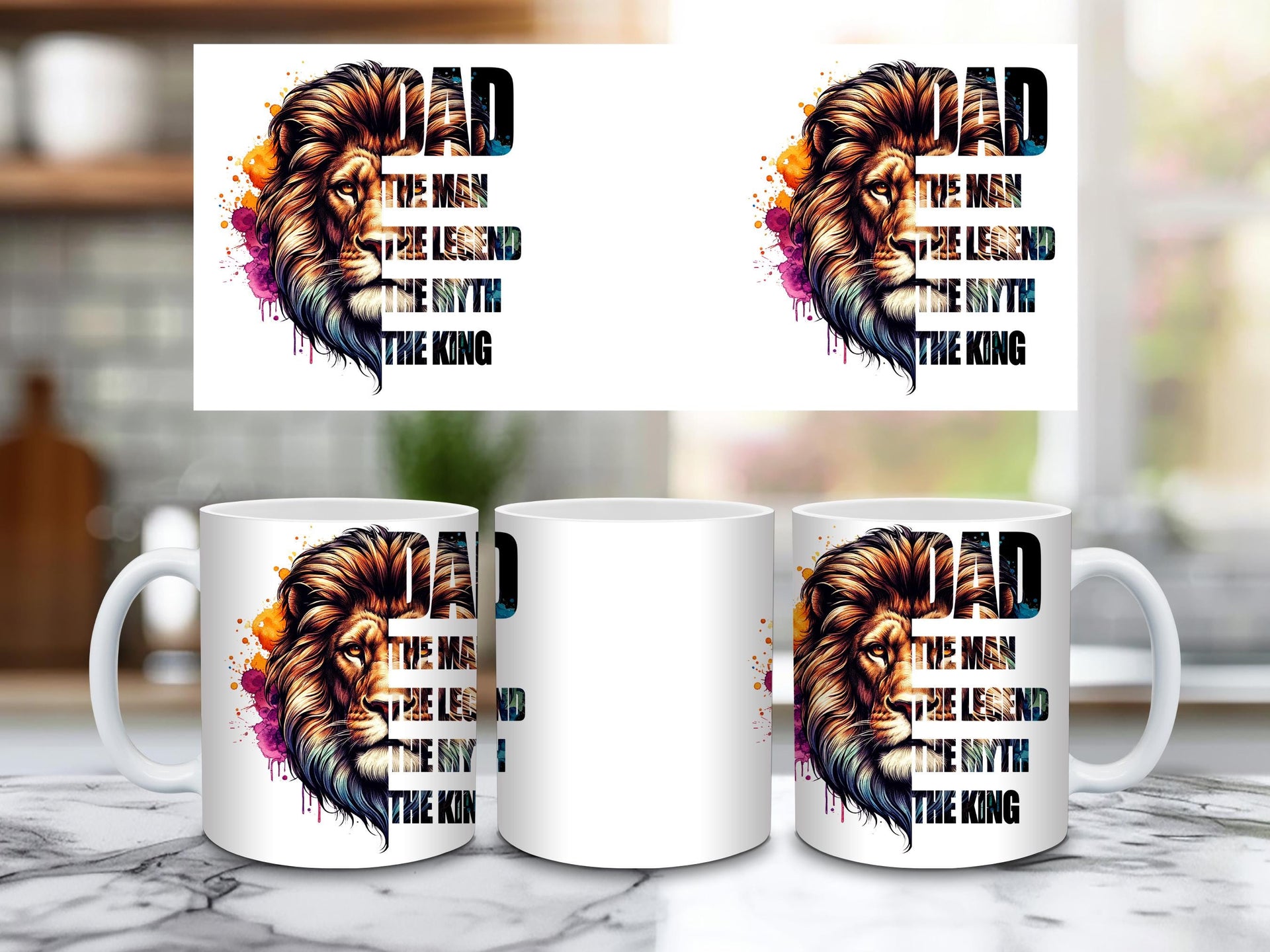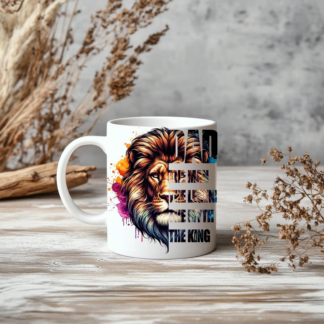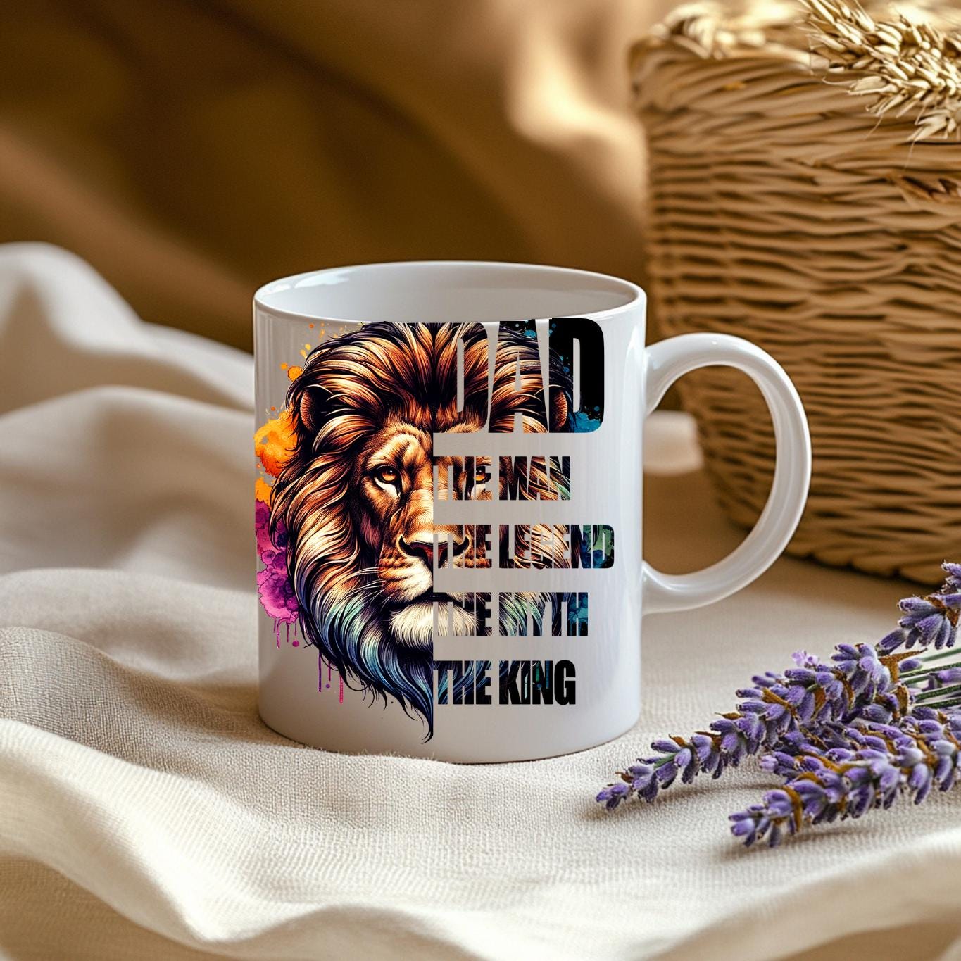 Honor the king of your family with this majestic "DAD: The Man, The Legend, The Myth, The King" Coffee Mug! This striking mug features a powerful lion's head with a vibrant, watercolor-style mane in a spectrum of blues, purples, oranges, and golds, symbolizing strength, wisdom, and royalty. Below the regal lion, the bold text proudly proclaims "DAD THE MAN THE LEGEND THE MYTH THE KING," making it the ultimate tribute to your father. Perfect for his morning coffee, tea, or any favorite beverage, this mug is an ideal gift for Father's Day, birthdays, holidays, or just to show your appreciation for all that he is. It's available in both a convenient 11oz size and a more generous 15oz capacity to suit his preference. Give him a gift that reminds him every day of his legendary status!