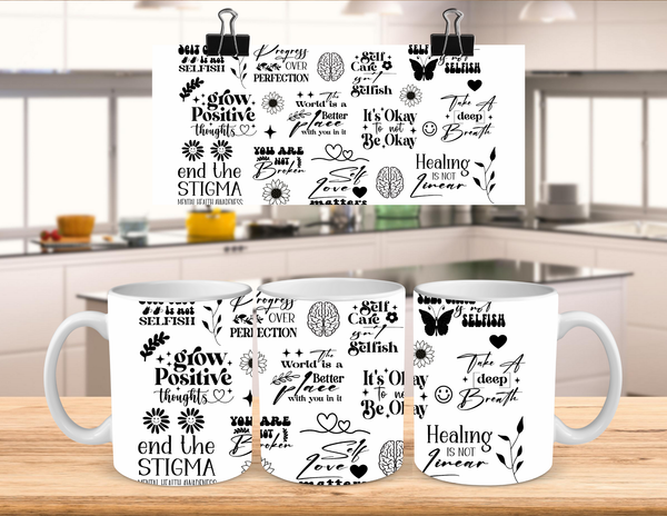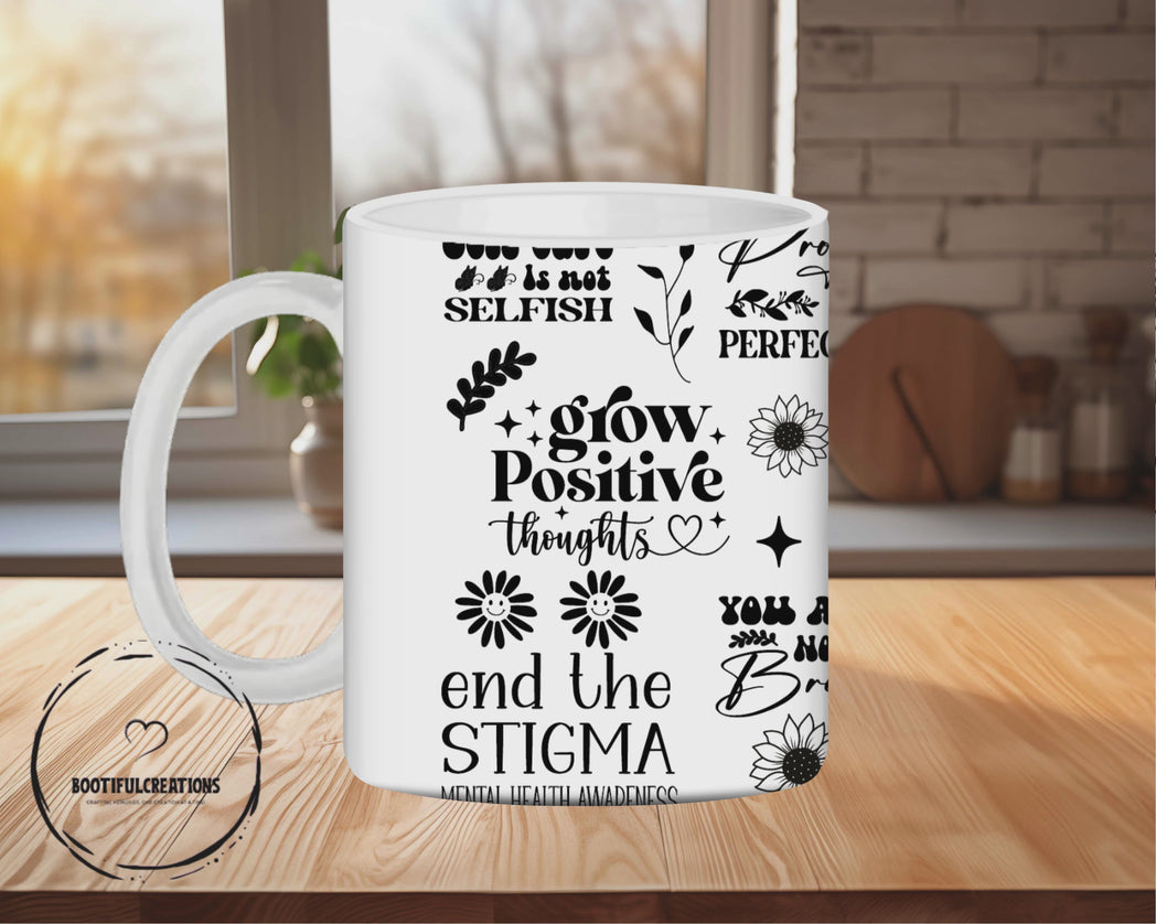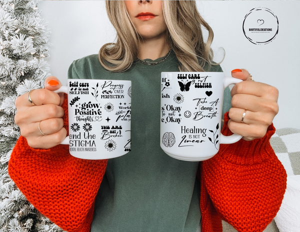 Elevate your morning coffee routine with our Mental Health Sayings Coffee Mug. Made from high-quality ceramic, this mug features inspiring mental health sayings to start your day with positive vibes. Available in two sizes, 11oz or 15oz, to fit your caffeine needs. Choose this mug and spread awareness about mental health!