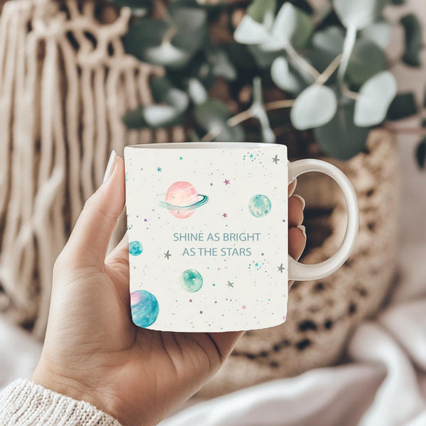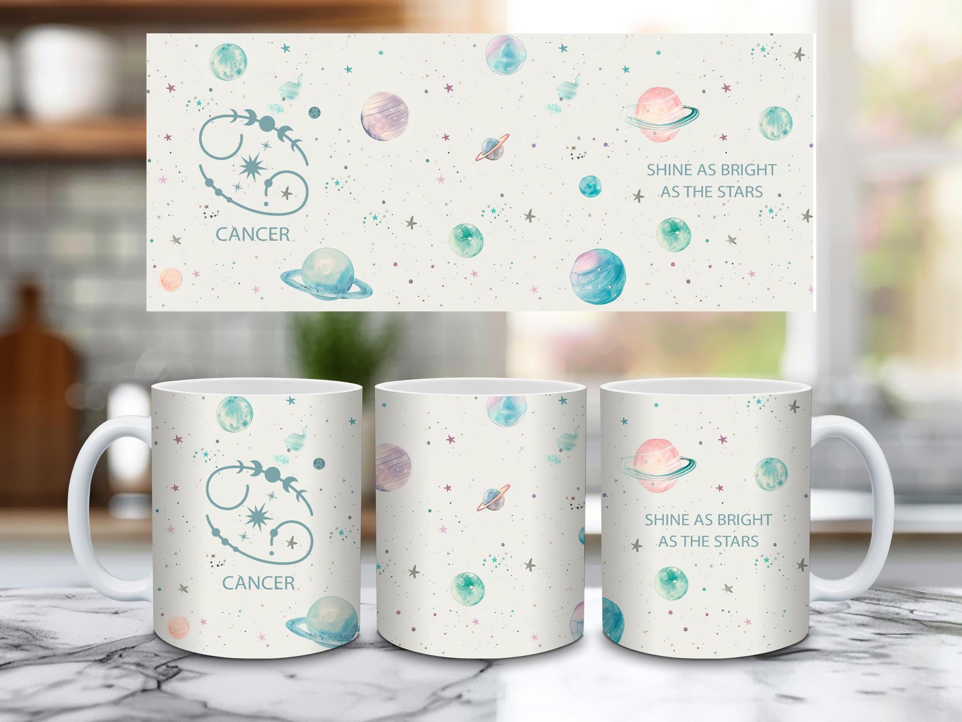 Embrace your empathetic spirit and shine bright with our "Shine As Bright As The Stars" Cancer Zodiac Coffee Mug! This enchanting mug features a whimsical design with pastel planets, twinkling stars, and delicate cosmic elements scattered across a soft, celestial background. On one side, it proudly displays the nurturing Cancer zodiac symbol and name, while the other side carries the inspiring message, "Shine As Bright As The Stars."